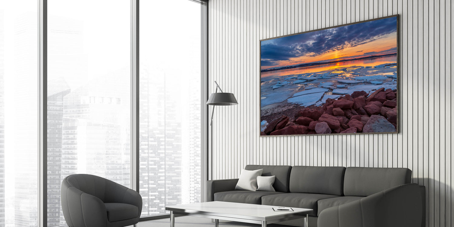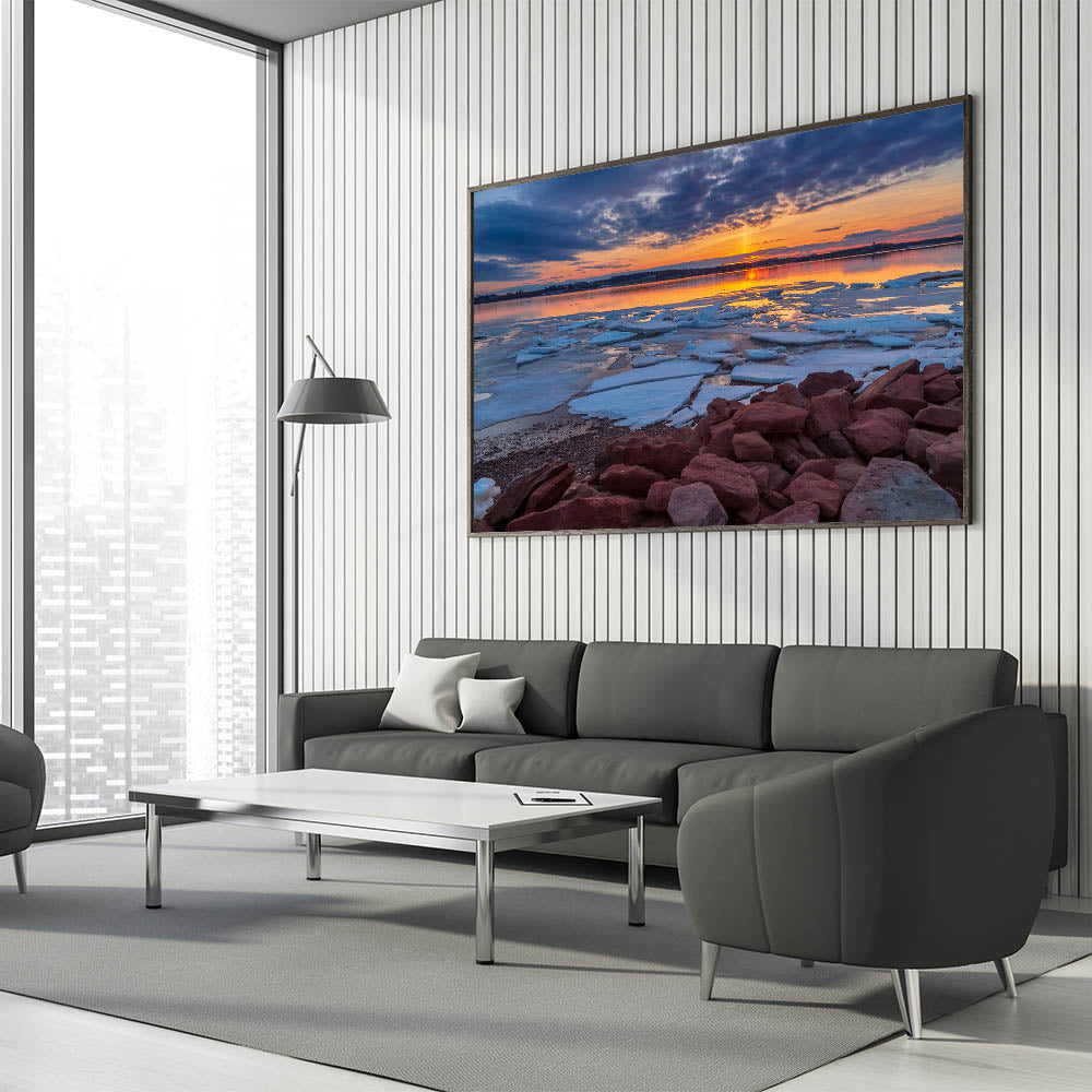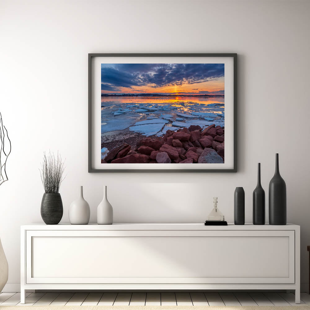 • Maritime wall decor that highlights the striking beauty of PEI’s winter scenery, with ice, rocks, and glowing skies.