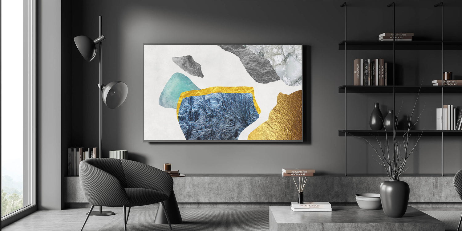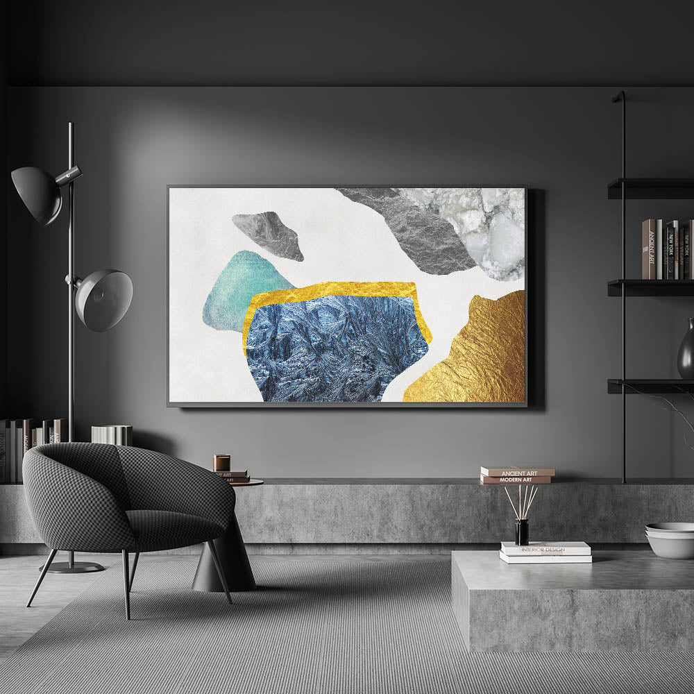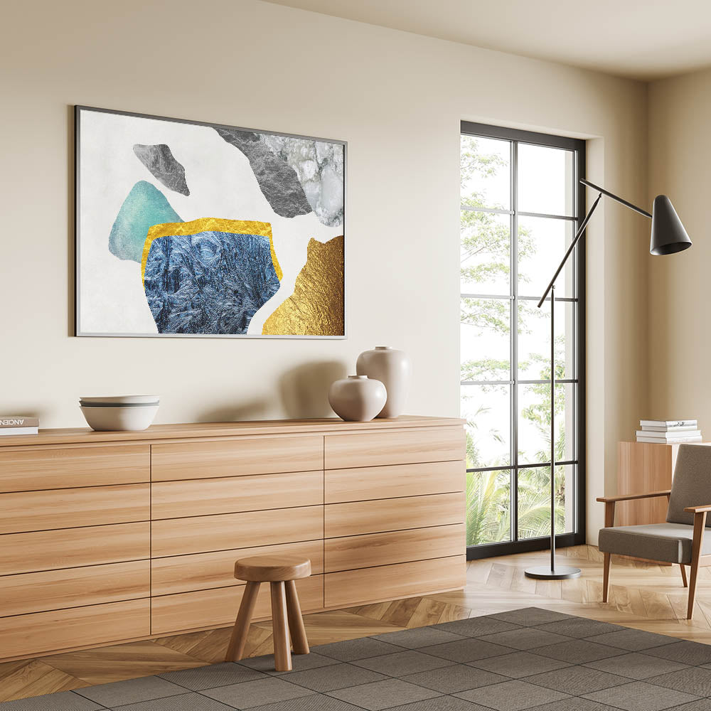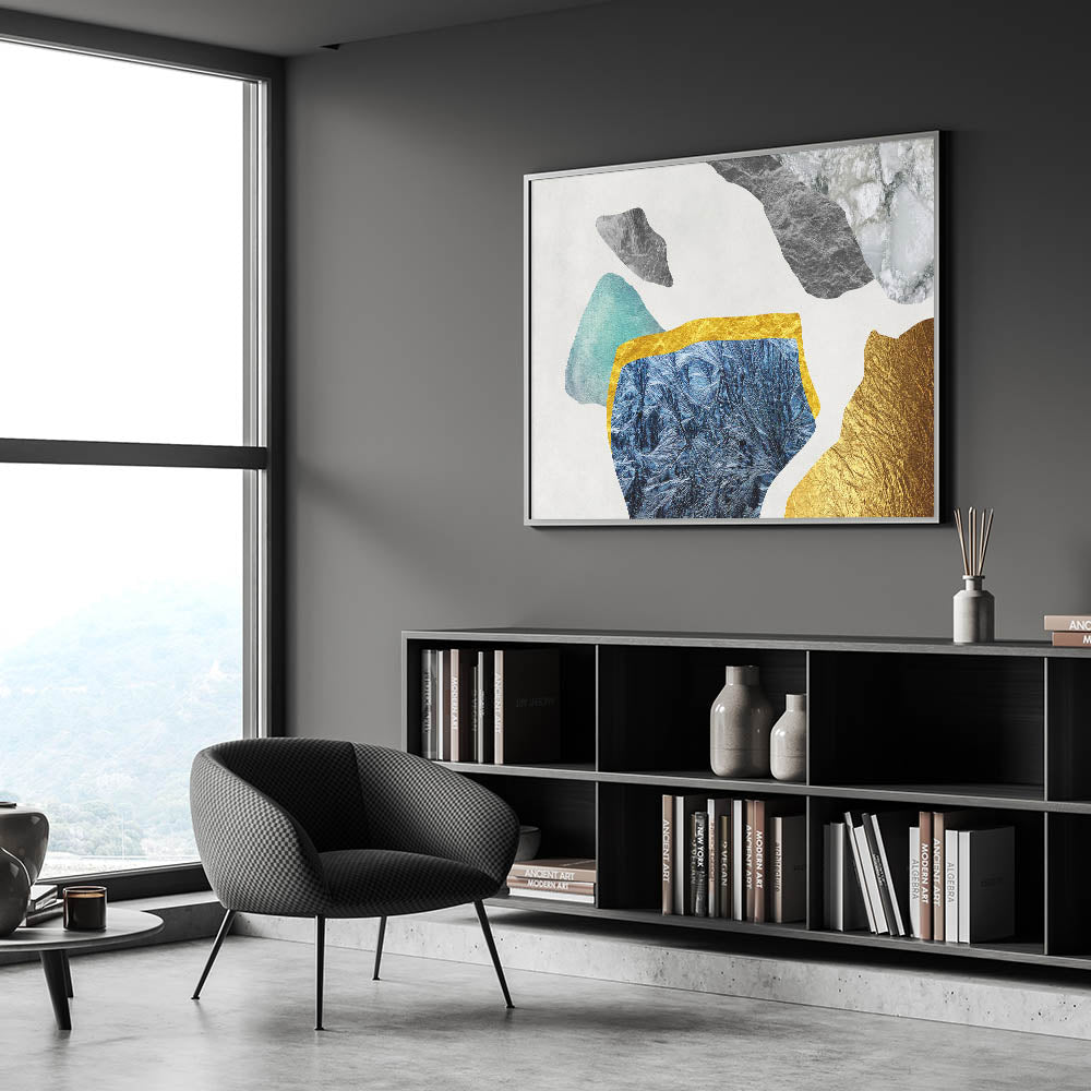 Bring a contemporary touch to your space with this Geometric Abstract Art piece, featuring a striking combination of gold, blue, teal, and gray textures. The artwork’s bold geometric shapes and rich textures create a dynamic visual effect that captivates the eye. The use of metallic gold adds a luxurious element, making this piece a perfect fit for modern or eclectic interiors.