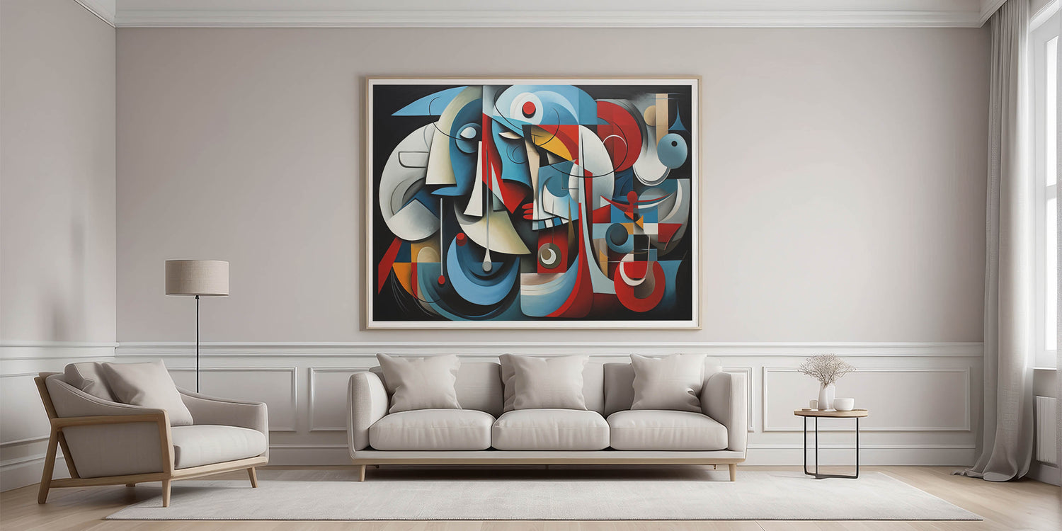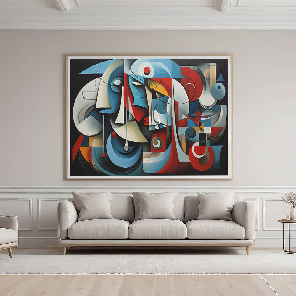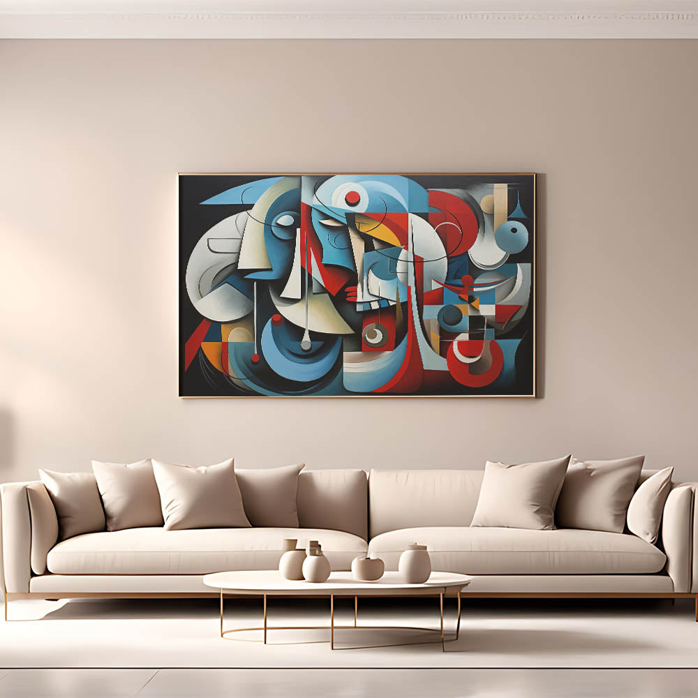 Immerse your space in the bold and structured elegance of this geometric harmony abstract expressionist wall art. This piece features an intricate composition of interlocking shapes and lines, highlighted by a striking color palette of deep blues, vibrant reds, and soft neutrals. The abstract forms and rhythmic patterns create a visually compelling piece that evokes both balance and movement.