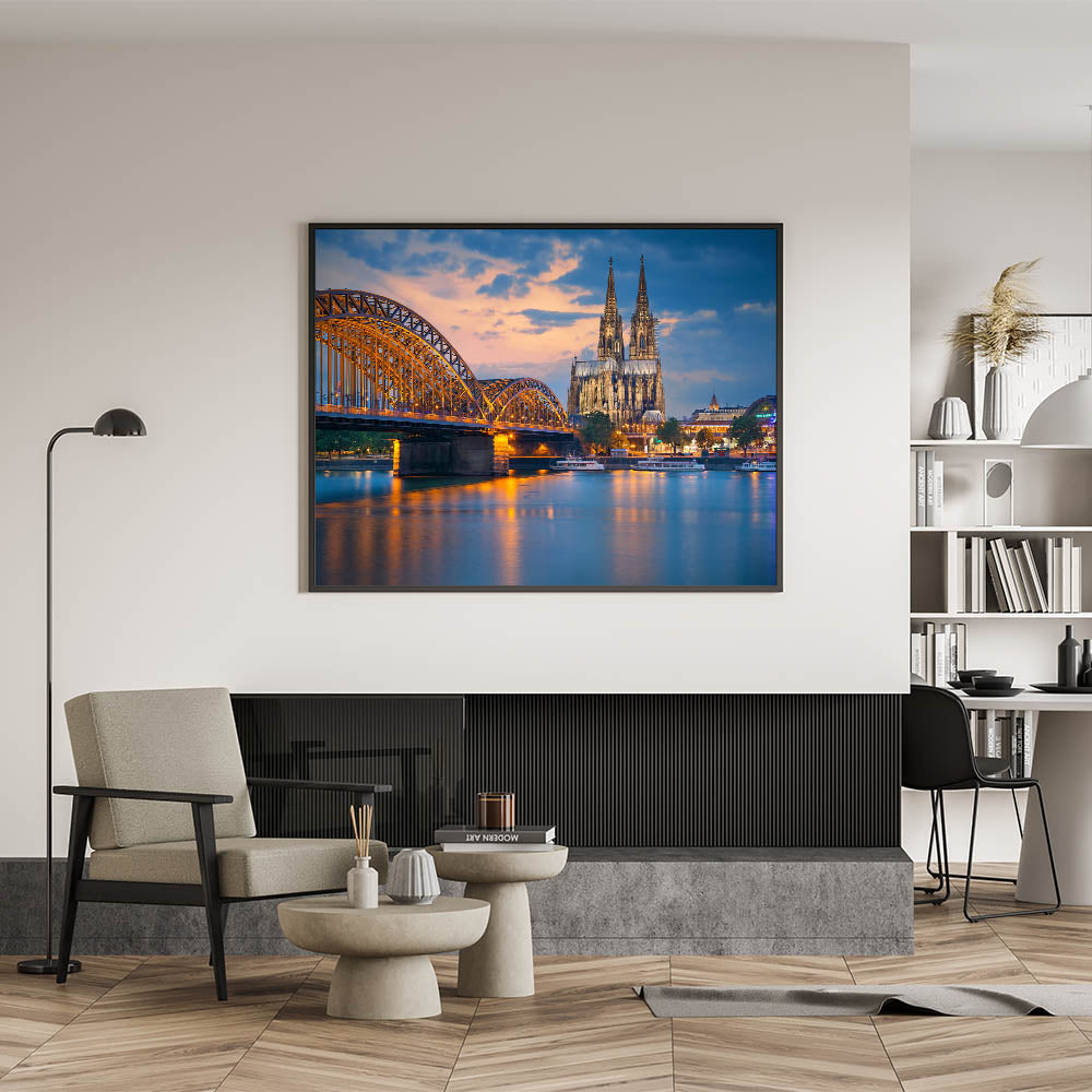 Transform your space with this stunning Germany Wall Art featuring the majestic Cologne Cathedral and Hohenzollern Bridge, beautifully captured at sunset. This scene brings together the historic charm of German architecture and modern design. Whether you're decorating a living room or office, this piece offers a breathtaking view of Scenic Germany that adds sophistication and warmth to any space.