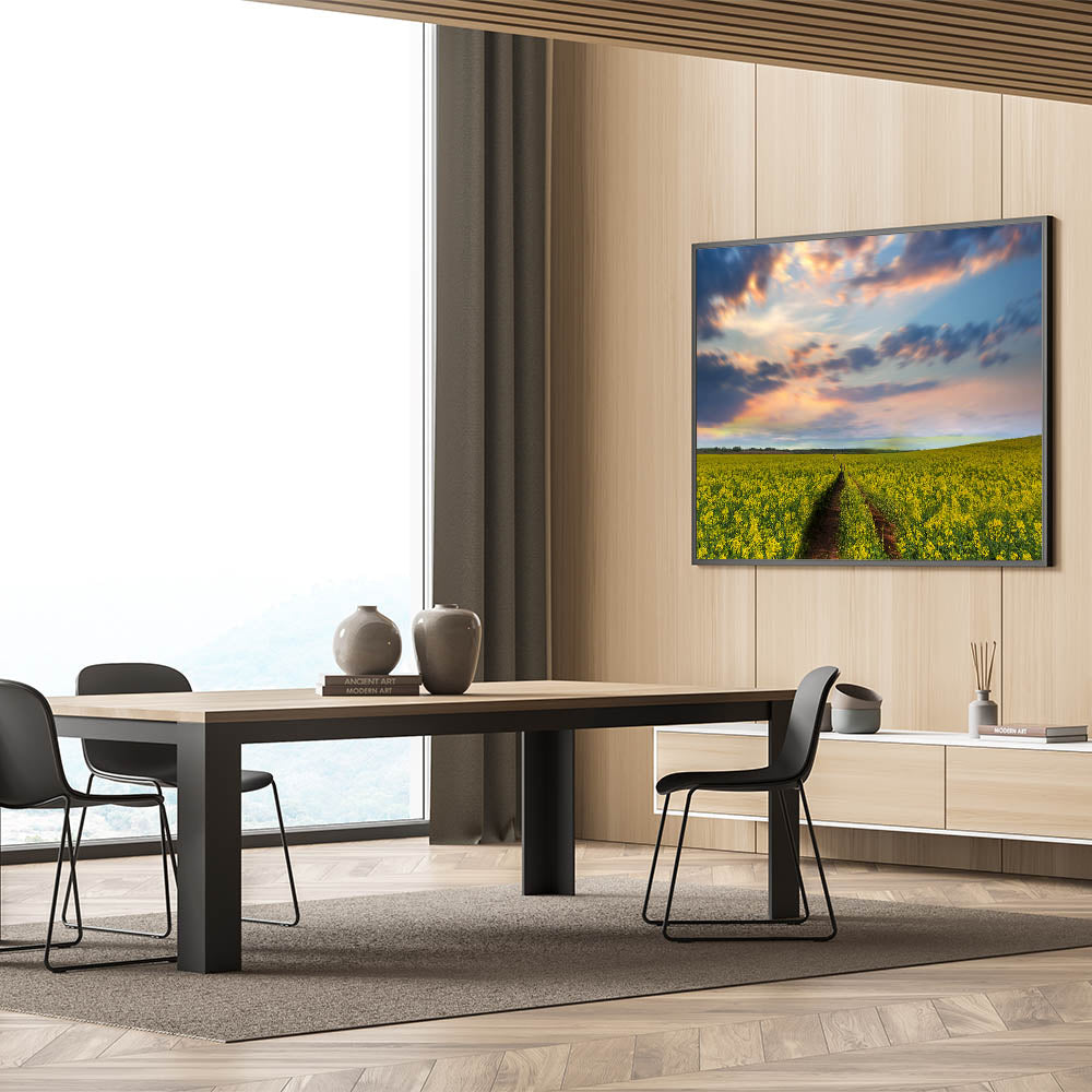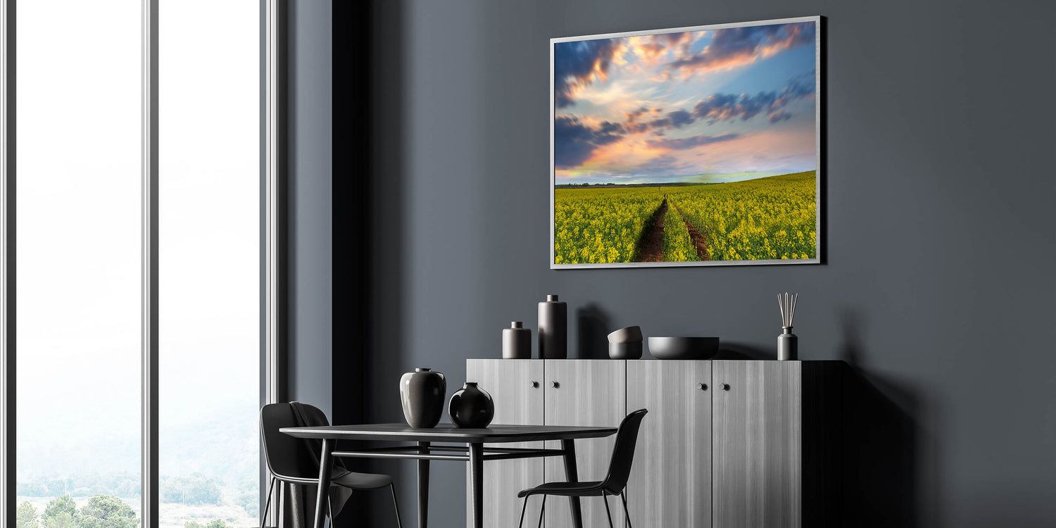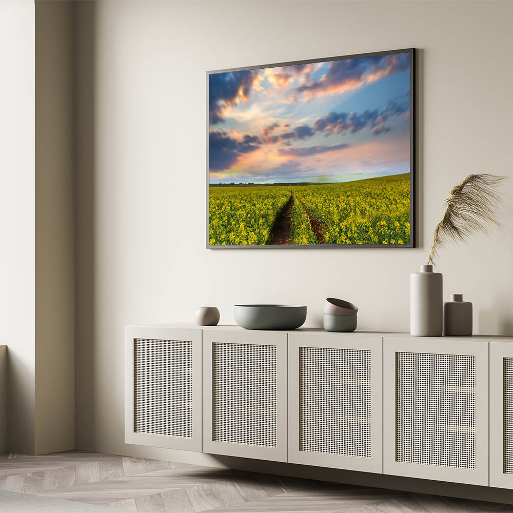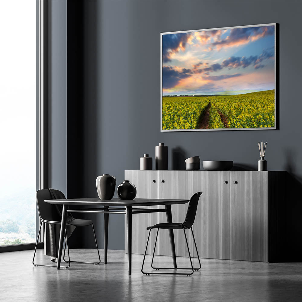 Experience the serene beauty of the Bangladeshi countryside with this stunning wall art, capturing the golden fields of mustard in full bloom under a breathtaking sunset. The artwork depicts a path cutting through the vibrant yellow fields, leading the eye towards the horizon where the sky is ablaze with warm hues of pink, orange, and blue. The tranquil setting exudes a sense of peace and calm, making this piece an ideal addition to any space in need of a soothing atmosphere.