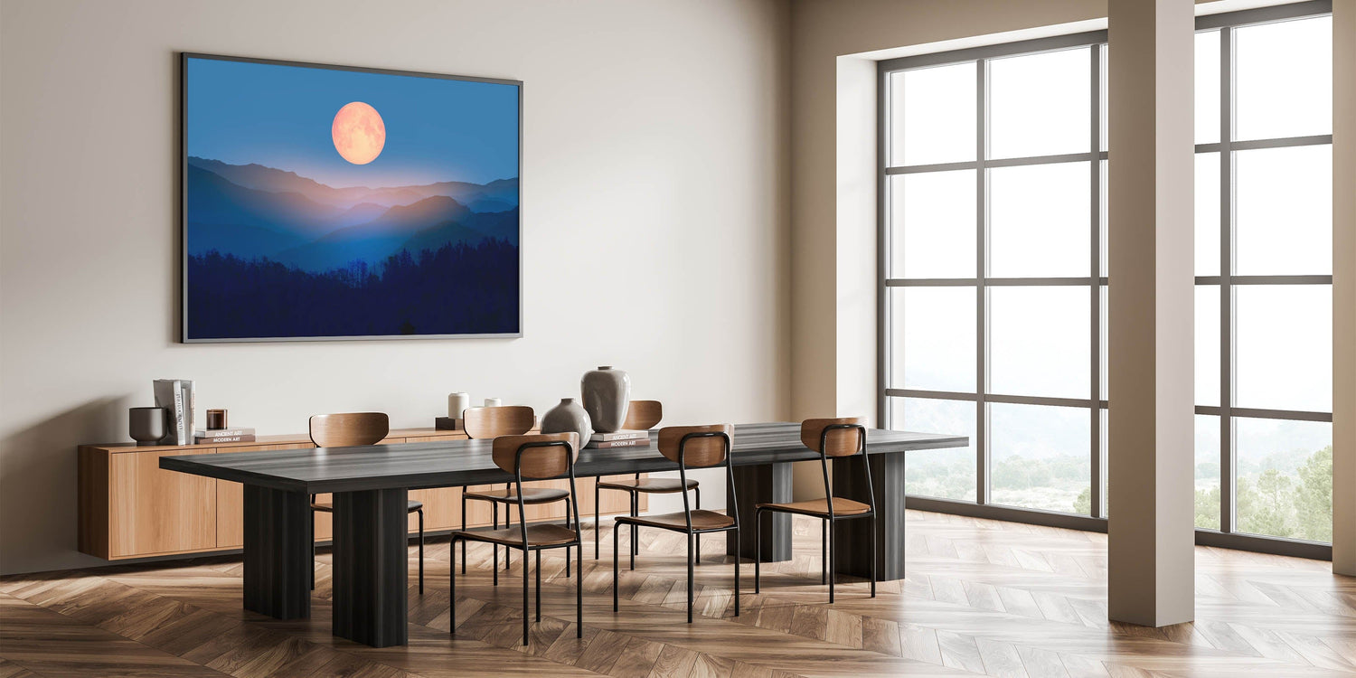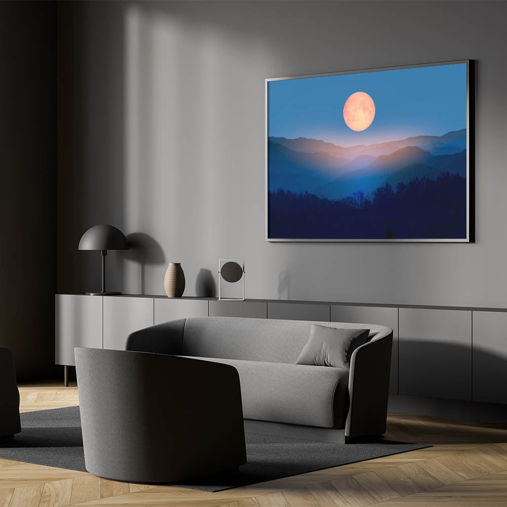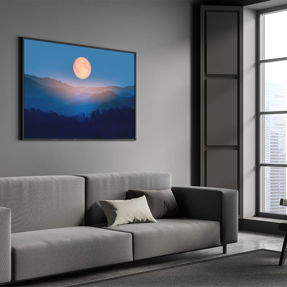 Bring a sense of tranquility and cosmic beauty to your home with this enchanting moon-inspired wall art. Featuring a golden full moon rising over layers of misty mountains, this serene landscape evokes the peaceful quiet of a moonlit night. The blend of rich blues and warm golden tones creates a striking contrast, making this artwork the perfect addition to any room looking for a touch of celestial decor.