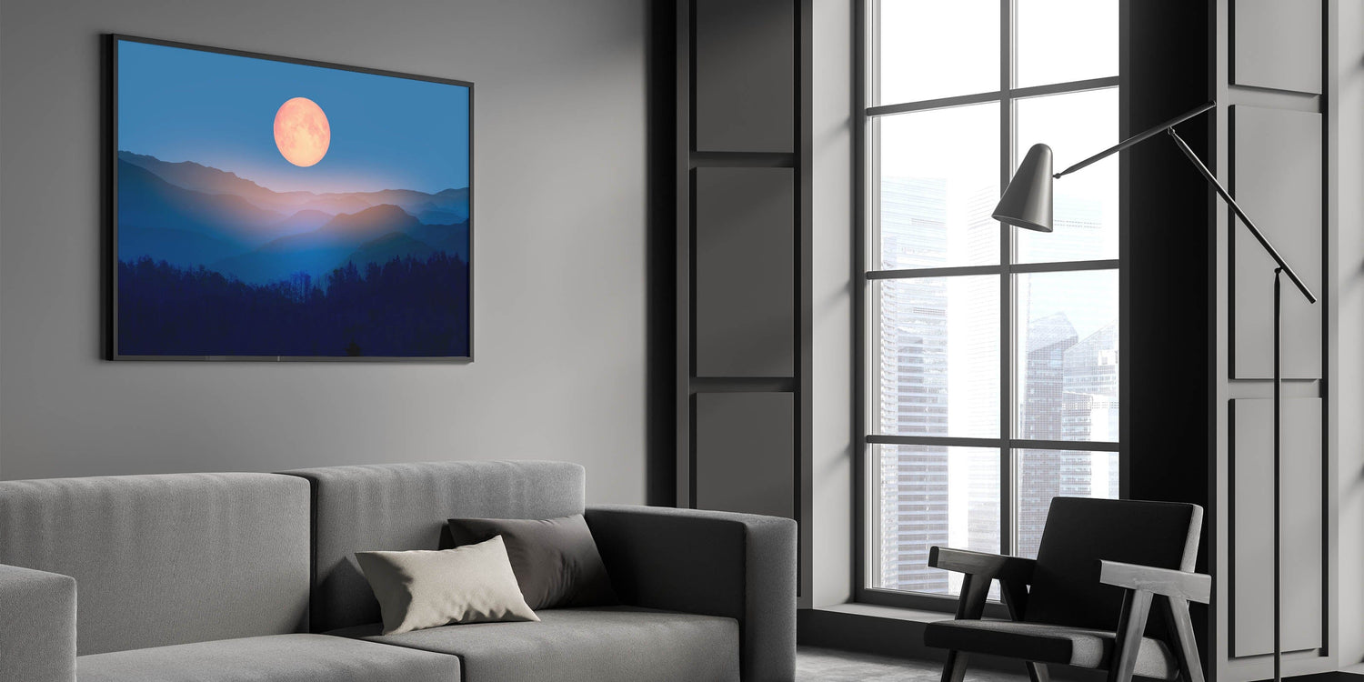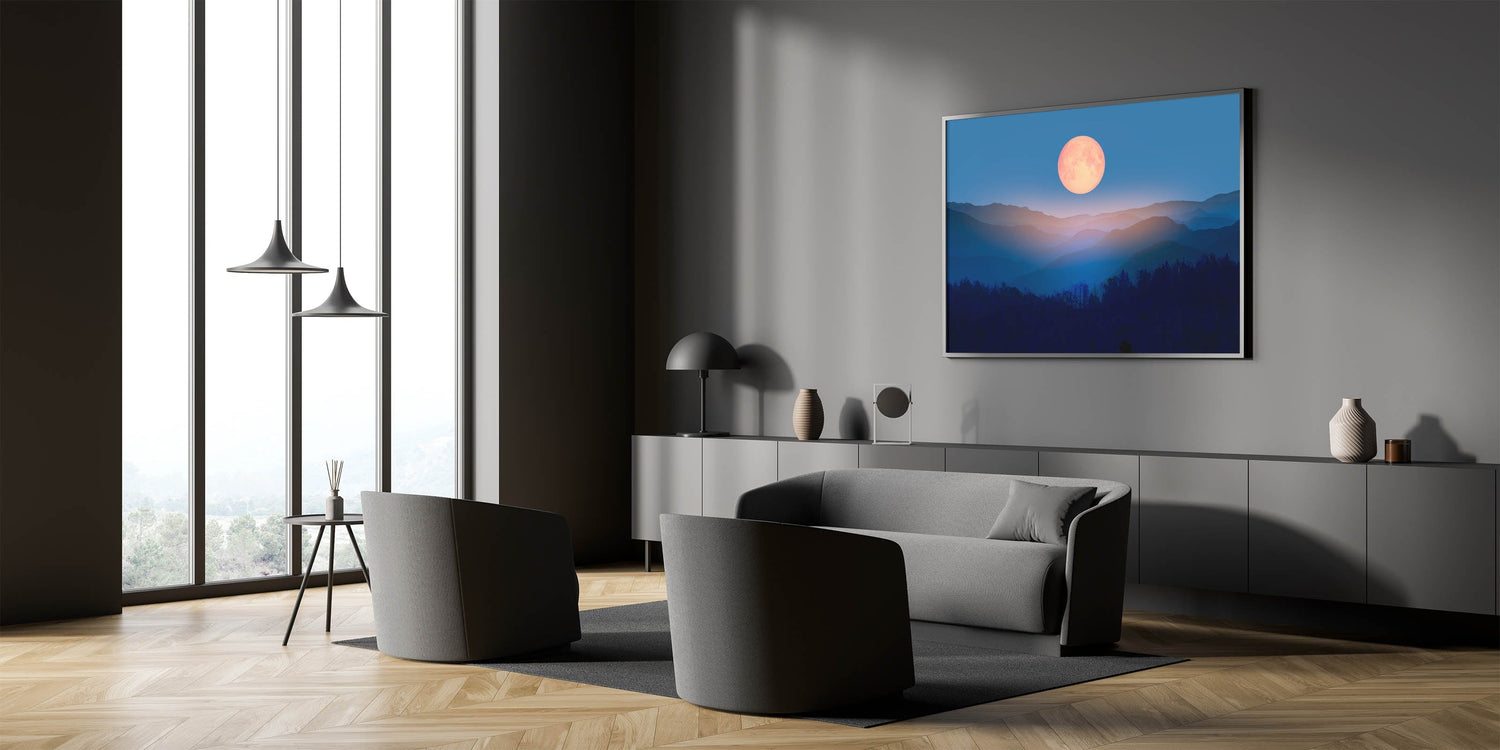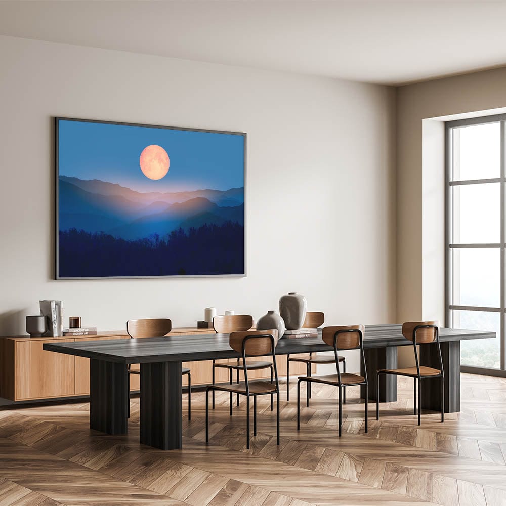 Bring a sense of tranquility and cosmic beauty to your home with this enchanting moon-inspired wall art. Featuring a golden full moon rising over layers of misty mountains, this serene landscape evokes the peaceful quiet of a moonlit night. The blend of rich blues and warm golden tones creates a striking contrast, making this artwork the perfect addition to any room looking for a touch of celestial decor.