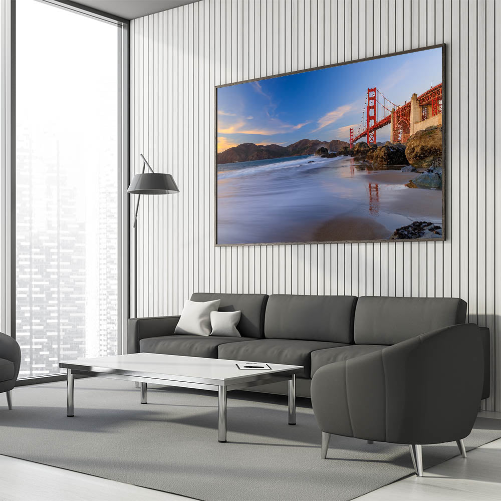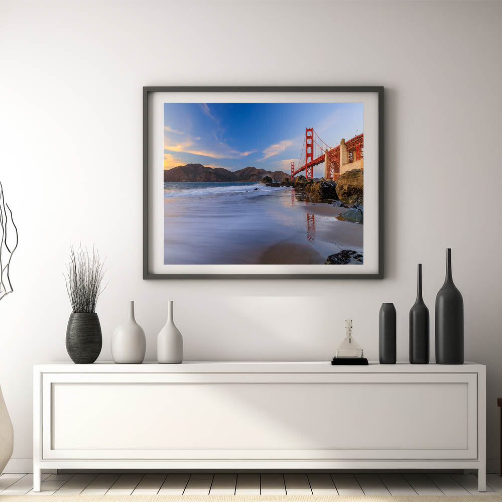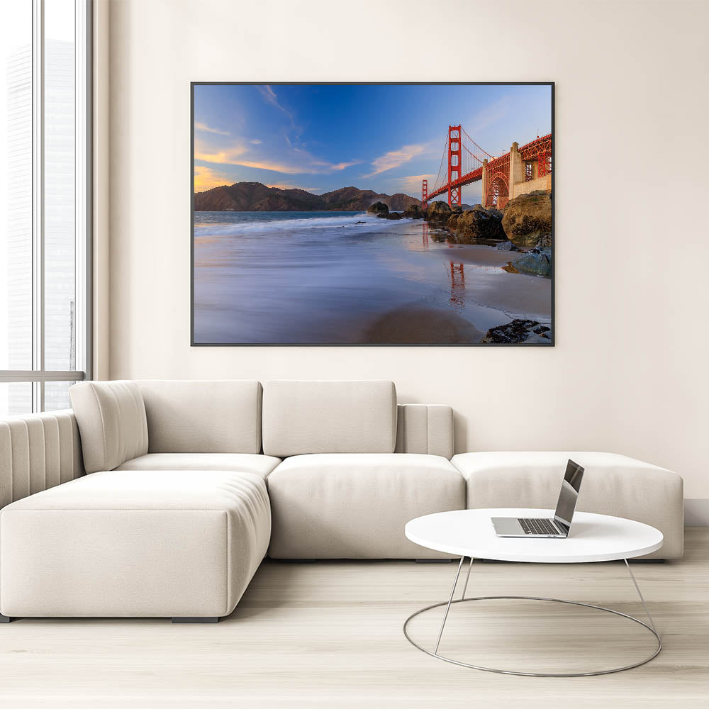 Capture the iconic beauty of San Francisco with our Golden Gate Bridge at Sunset canvas print. This stunning artwork showcases the majestic Golden Gate Bridge bathed in the warm hues of sunset, set against the backdrop of the rugged coastal landscape. The vibrant colors and the serene reflection of the bridge in the calm waters below make this piece a breathtaking addition to any room.