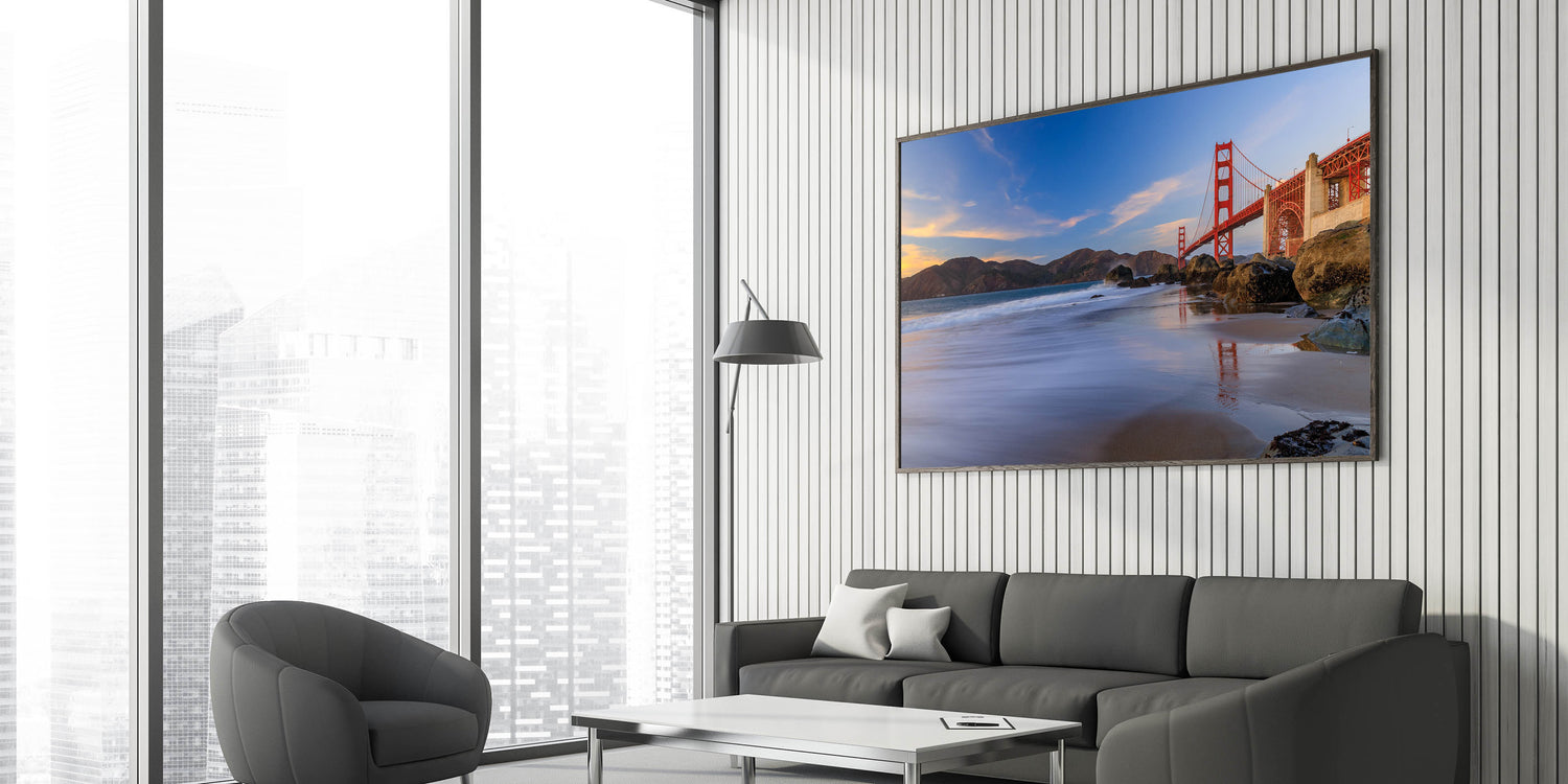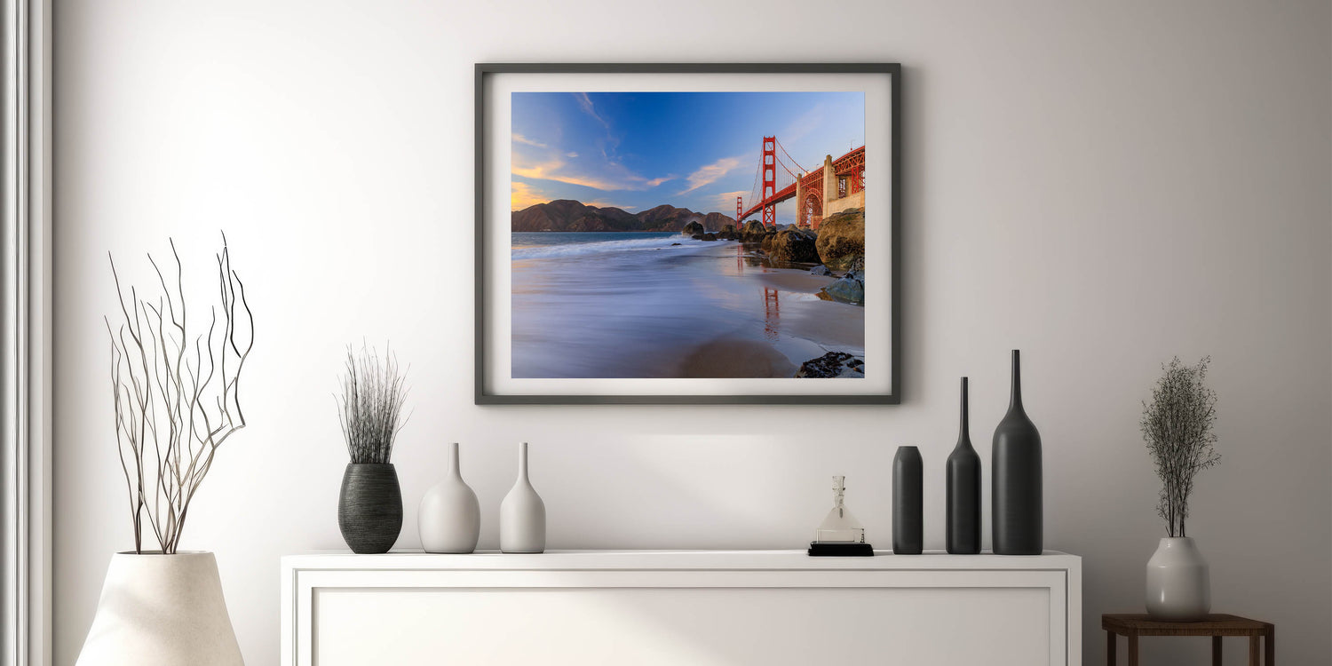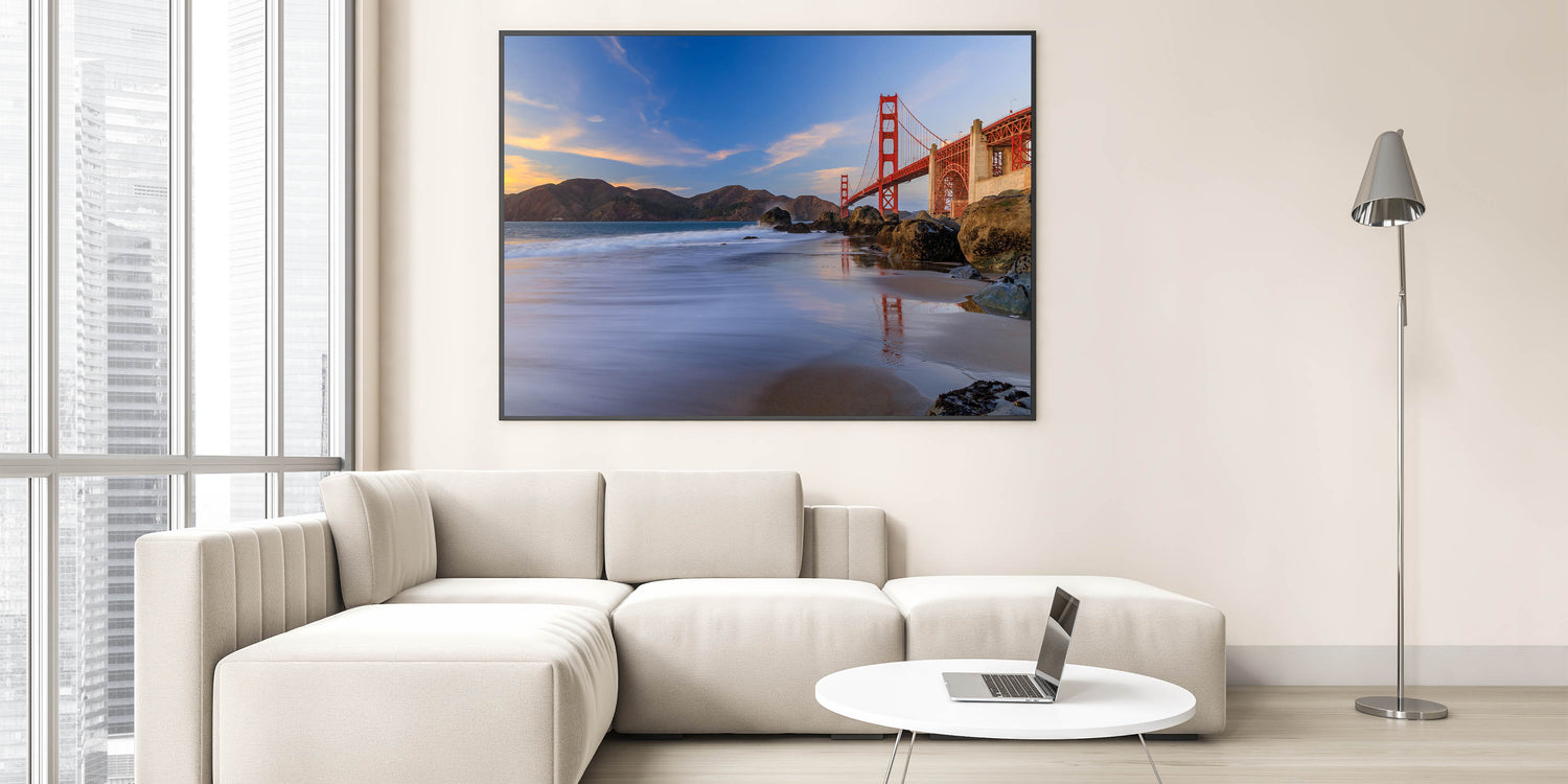 Capture the iconic beauty of San Francisco with our Golden Gate Bridge at Sunset canvas print. This stunning artwork showcases the majestic Golden Gate Bridge bathed in the warm hues of sunset, set against the backdrop of the rugged coastal landscape. The vibrant colors and the serene reflection of the bridge in the calm waters below make this piece a breathtaking addition to any room.