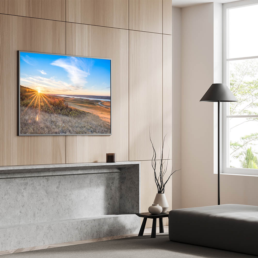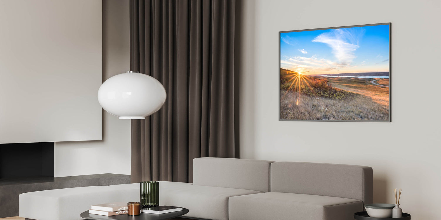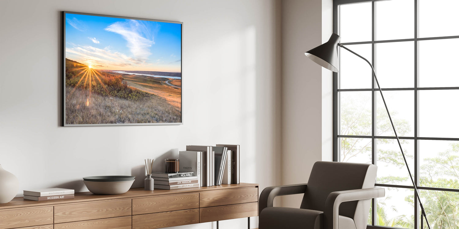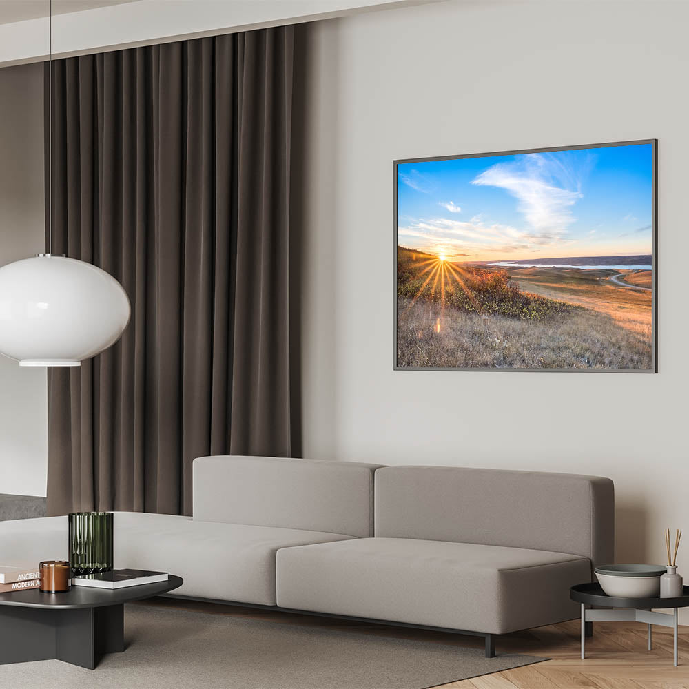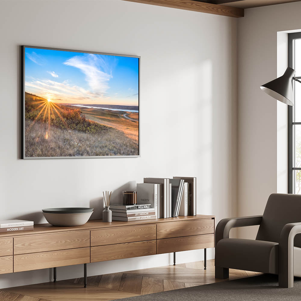 Bring the warmth and beauty of a Saskatchewan sunrise into your home with this breathtaking wall art. Featuring the sun’s golden rays stretching over rolling hills and a winding road, this artwork captures the tranquil beauty of the early morning. The expansive sky and the soft light reflecting off the landscape create a serene atmosphere, perfect for any room in need of a calming touch.