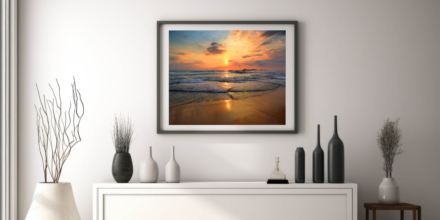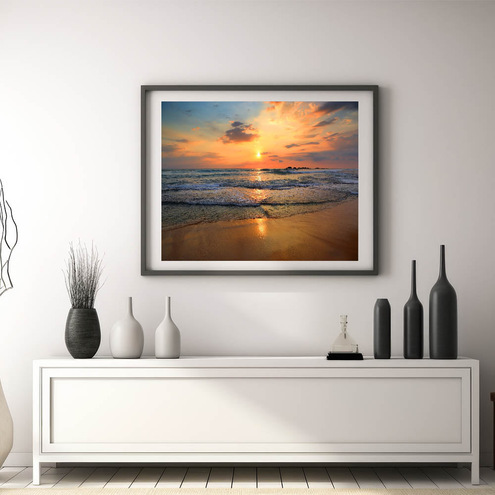 Elevate your interior with this beautiful piece of oceanfront artwork, perfect for those who love the calming effects of a sunset. Whether you’re creating a beach-themed room or simply want to bring the soothing vibes of the ocean into your space, this artwork is the ideal choice.
