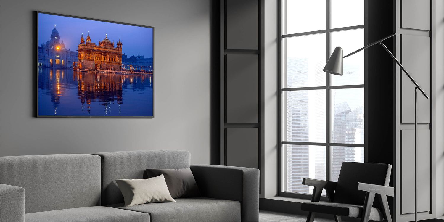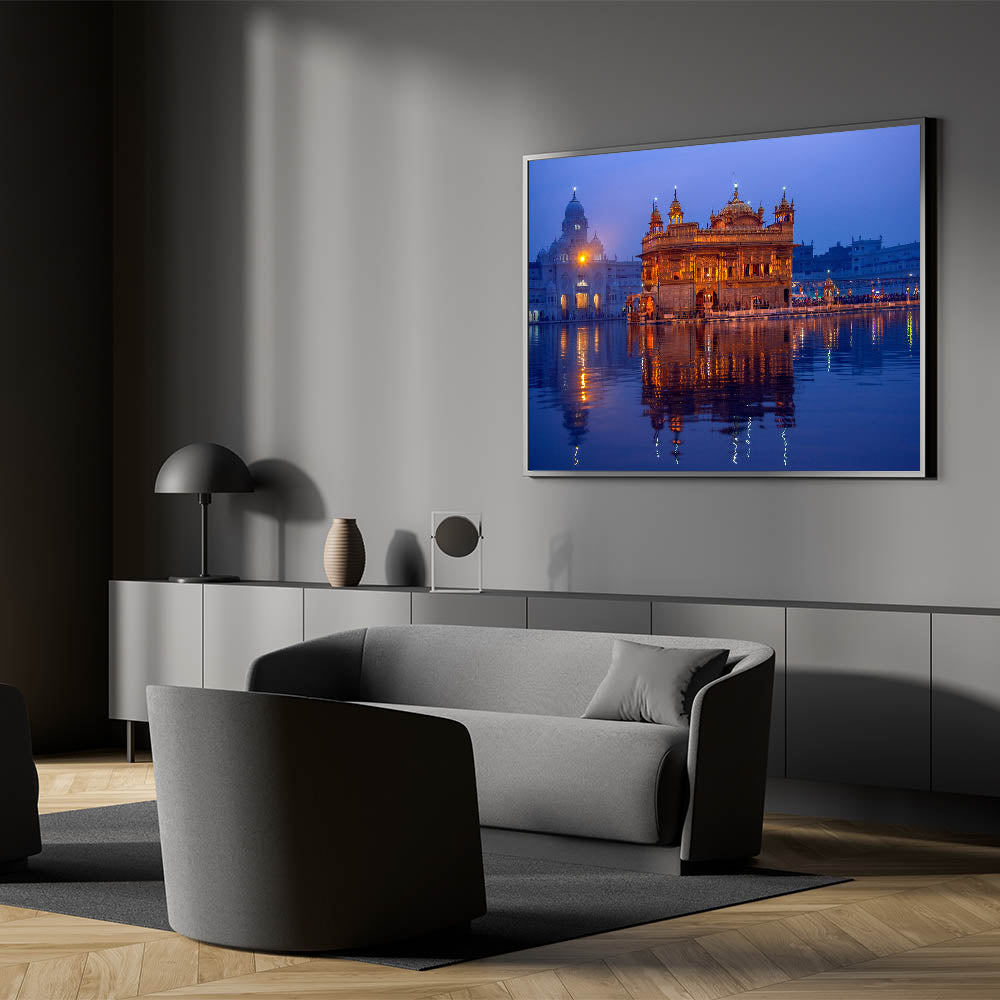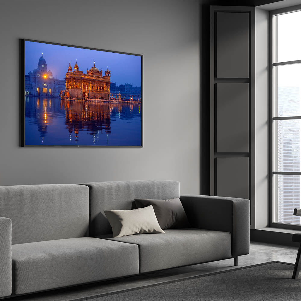 - High-quality print of the Golden Temple bathed in golden light and reflected in the water