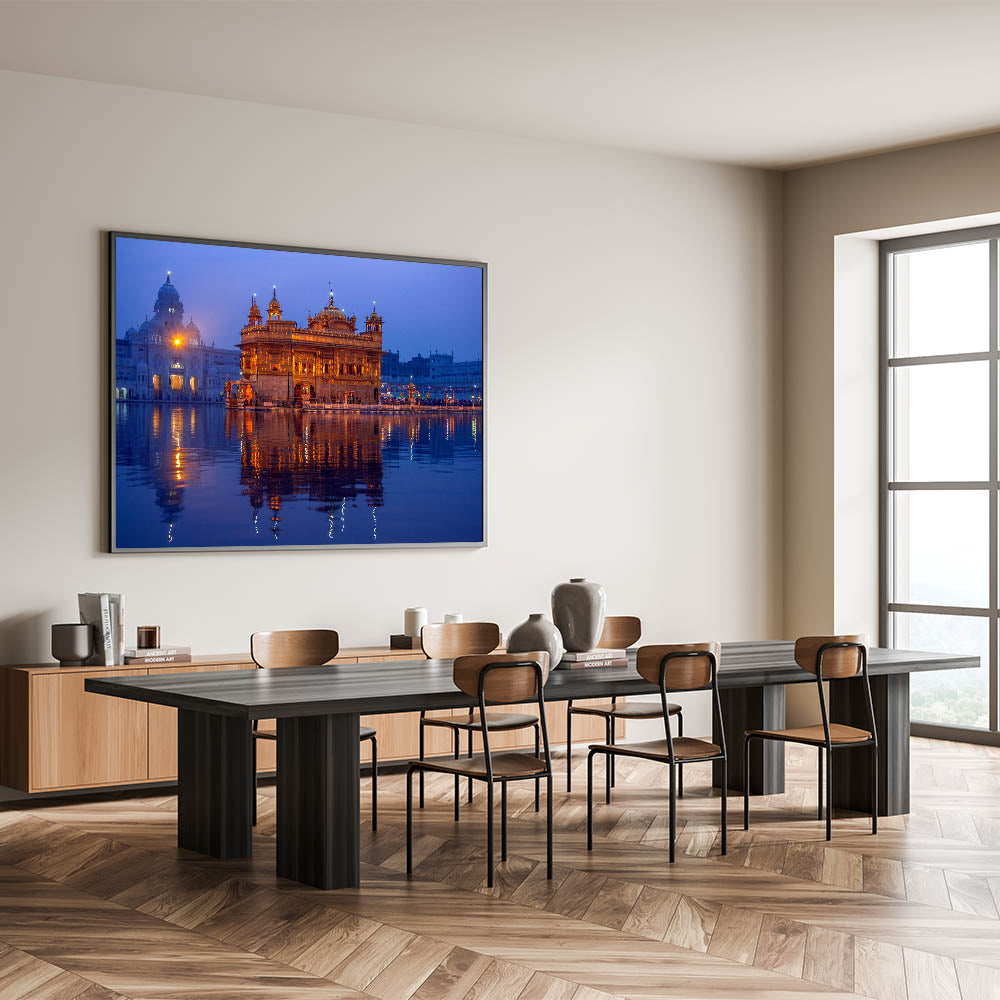 Illuminate your space with the ethereal beauty of the Golden Temple at Night Wall Art. This stunning canvas print captures the sacred Golden Temple shimmering under the night sky, with its reflection gracefully mirrored in the surrounding water. The golden glow of the temple contrasts beautifully with the deep blues of the evening, creating a serene and spiritual atmosphere that is perfect for any space.