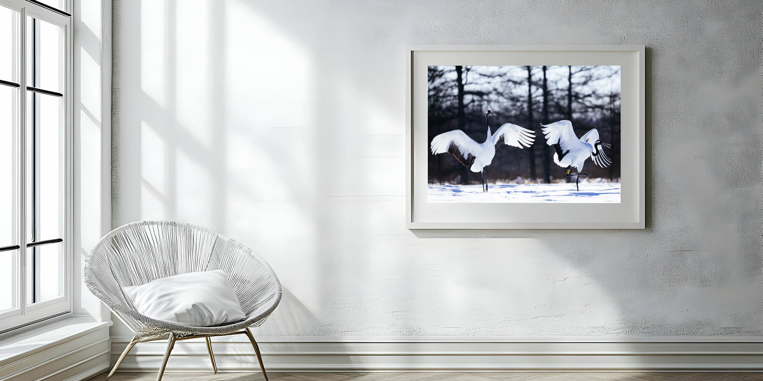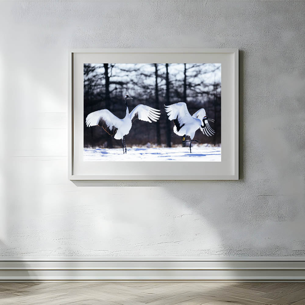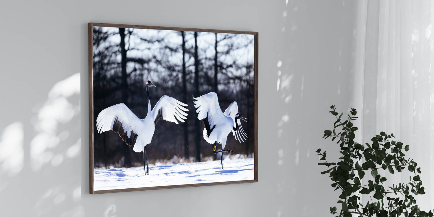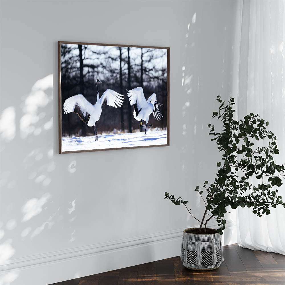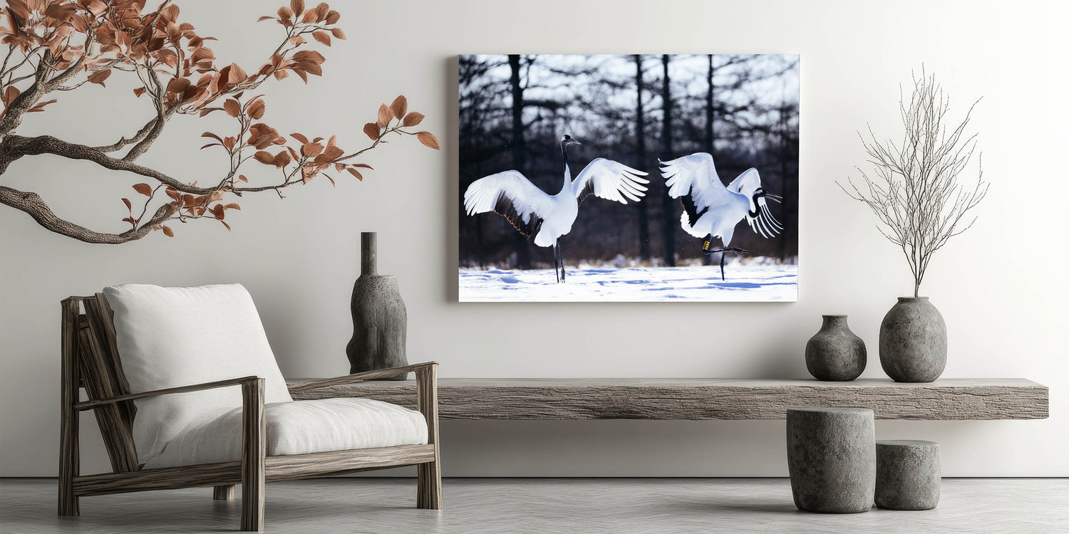 Graceful Crane Wall Art – Dancing Cranes in Snow on Canvas & Acrylic