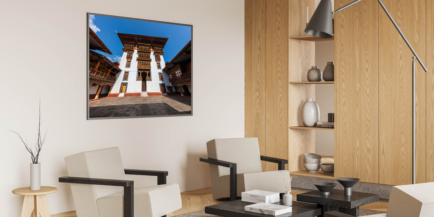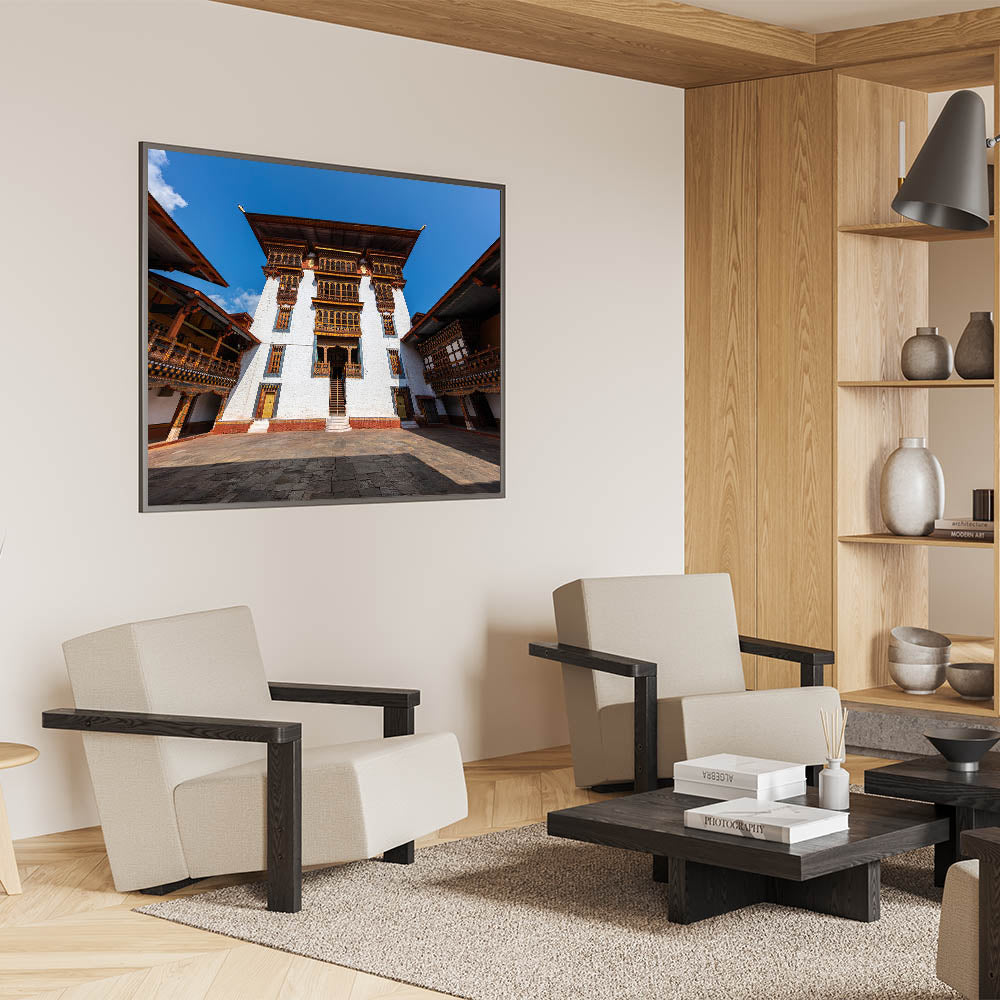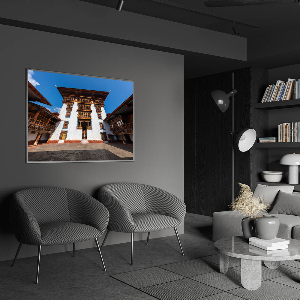 Embrace the grandeur of Bhutan's architectural marvels with this striking wall art showcasing a majestic Dzong fortress under a clear blue sky. This Bhutan wall art captures the imposing presence and intricate details of the fortress, offering a glimpse into the country’s rich historical and cultural heritage. Perfect for any space that seeks to highlight the beauty of Bhutanese architecture.