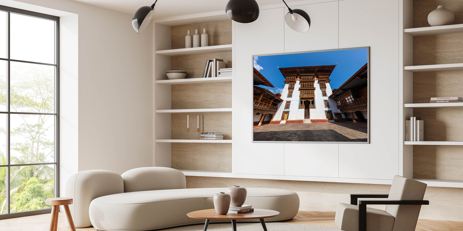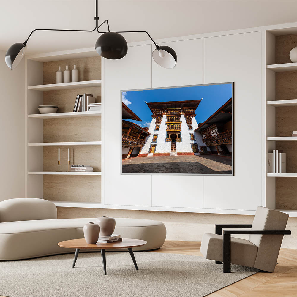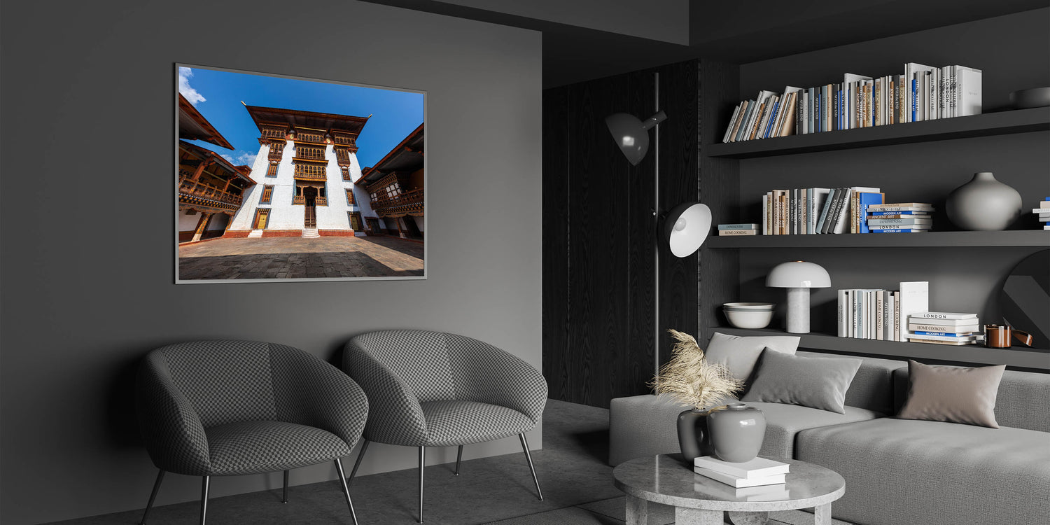 Embrace the grandeur of Bhutan's architectural marvels with this striking wall art showcasing a majestic Dzong fortress under a clear blue sky. This Bhutan wall art captures the imposing presence and intricate details of the fortress, offering a glimpse into the country’s rich historical and cultural heritage. Perfect for any space that seeks to highlight the beauty of Bhutanese architecture.
