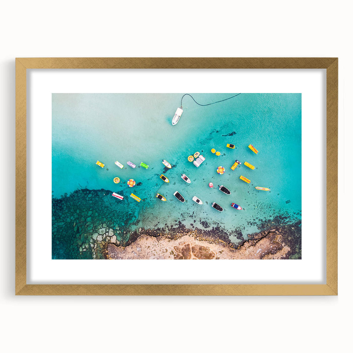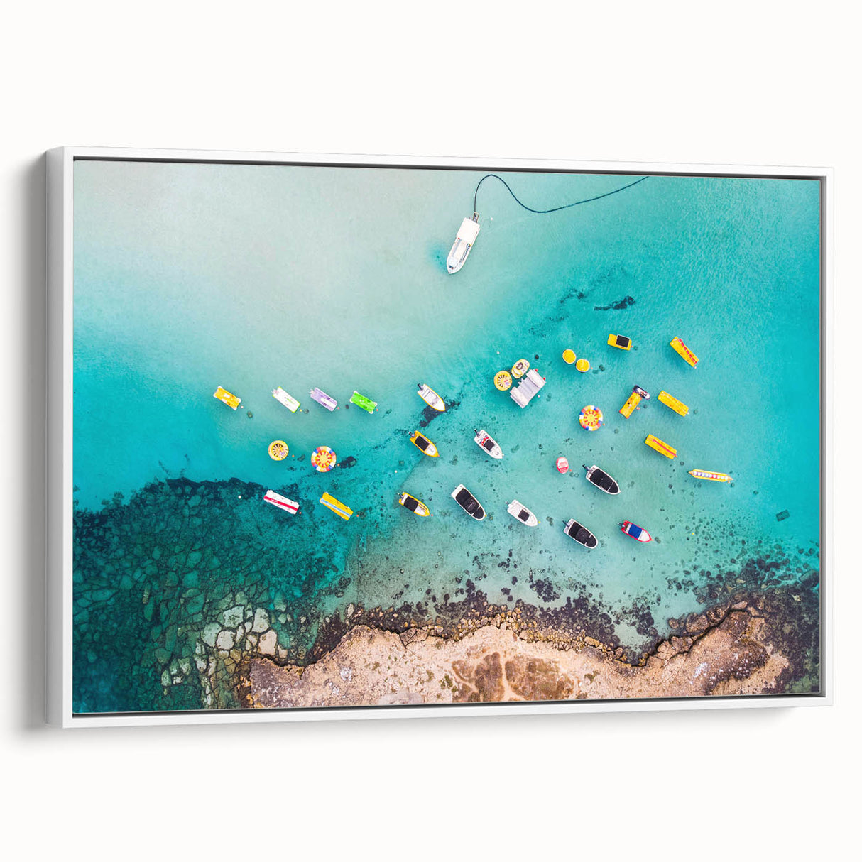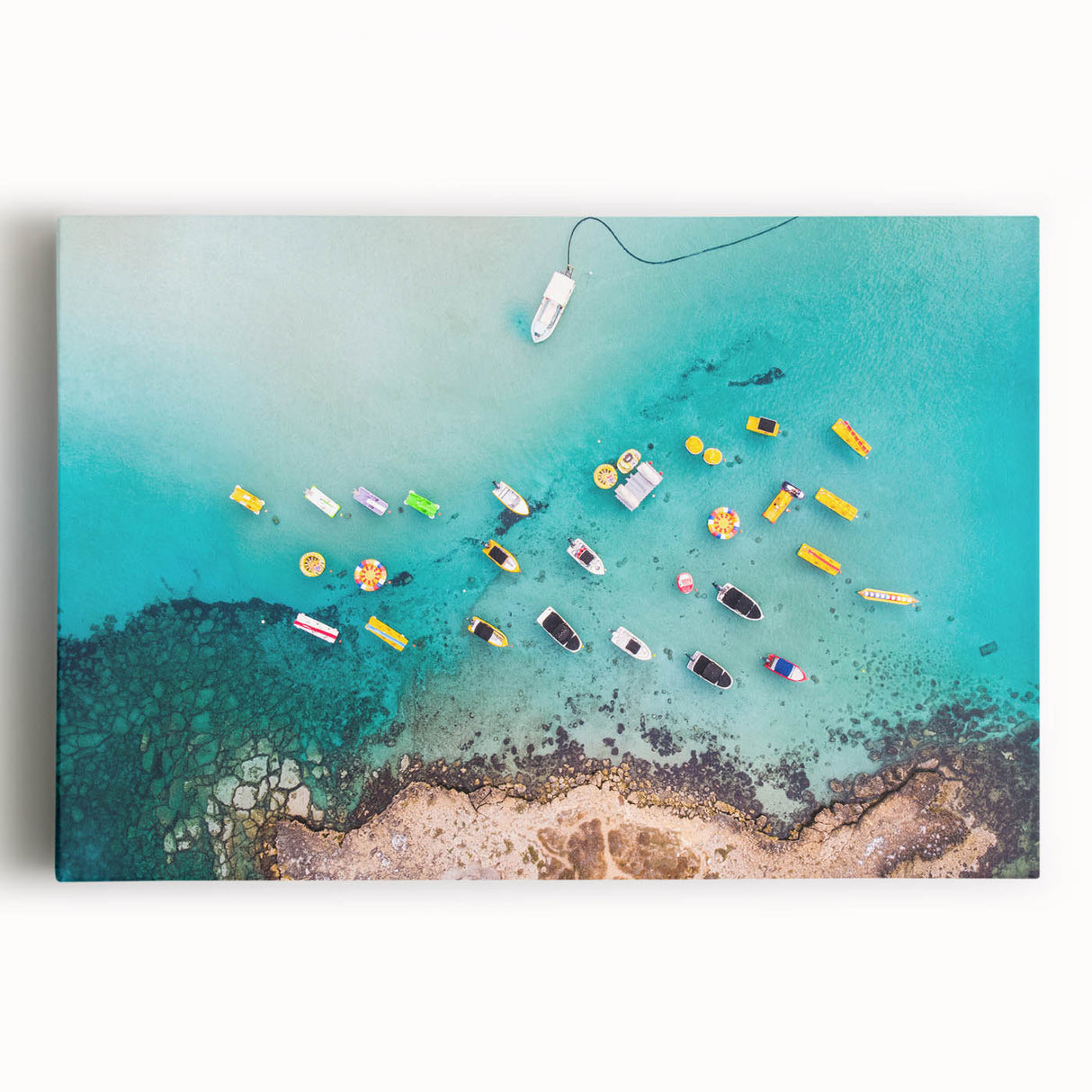 Elevate your space with our "Cyprus Marine Mosaic Art" from the Greek Island Canvas series. This stunning aerial photograph captures a lively array of boats and water activities set against the sparkling turquoise waters of Cyprus, showcasing the island’s vibrant marine life and leisure culture.