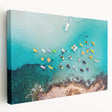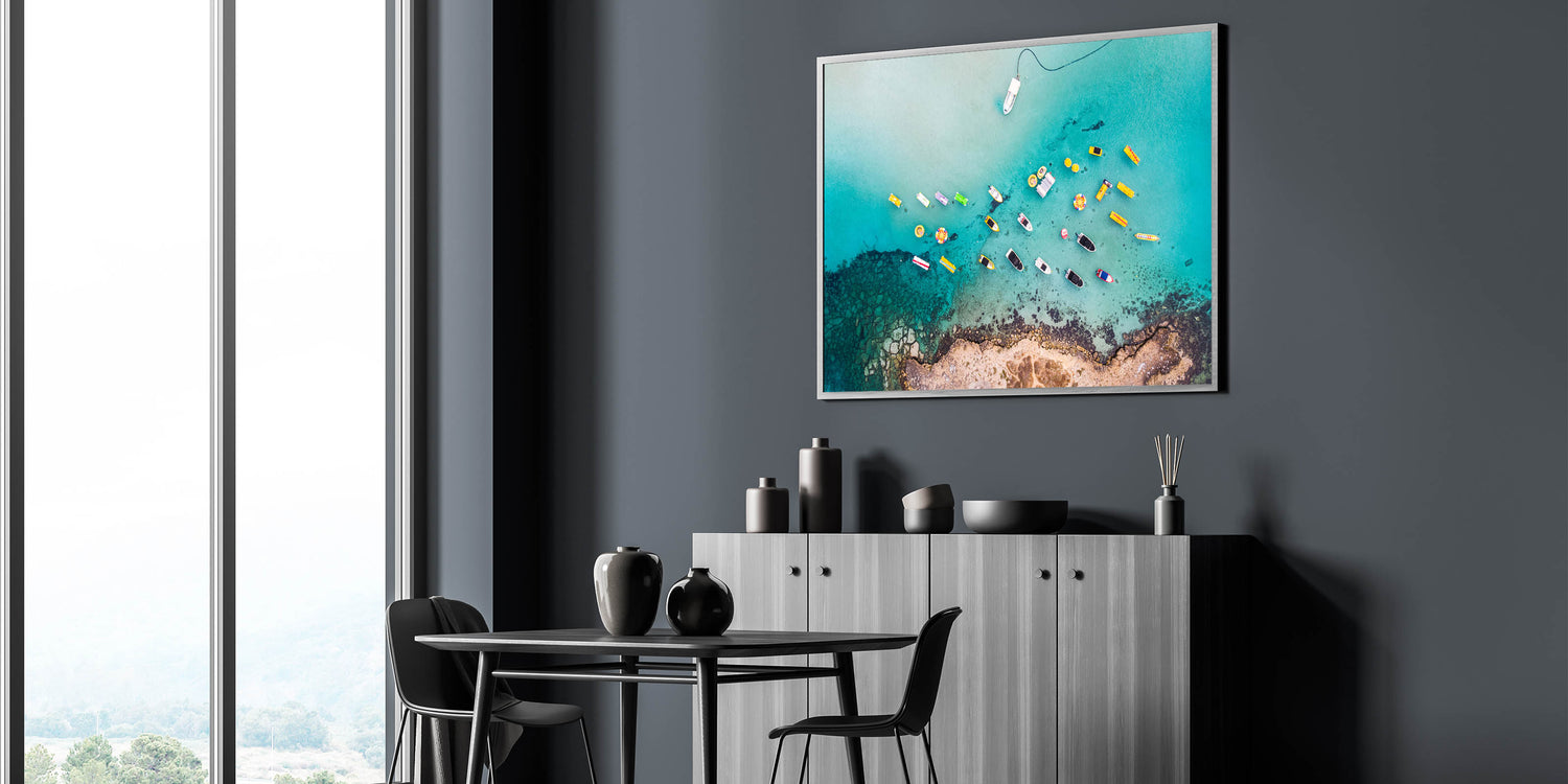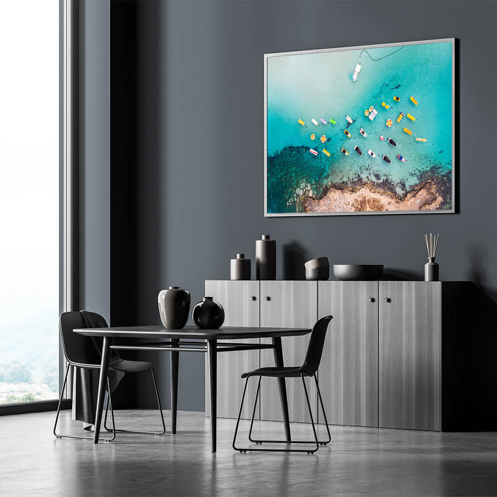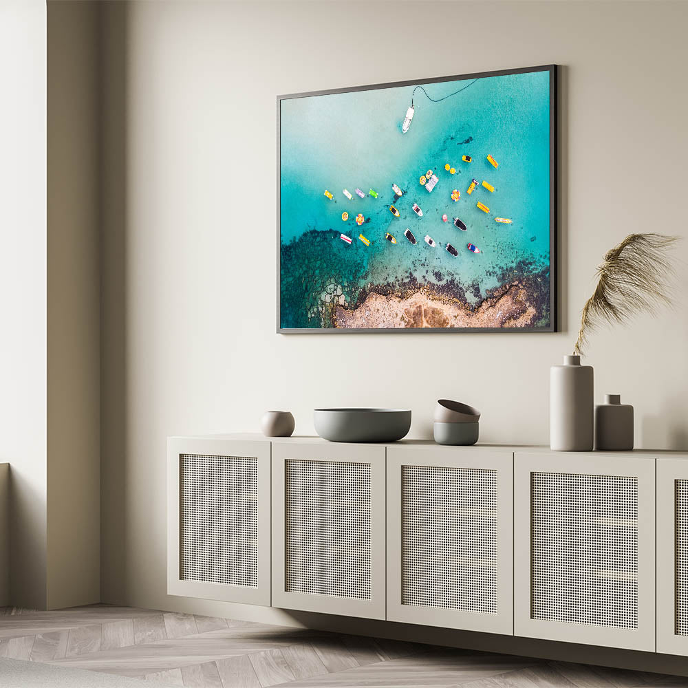 Elevate your space with our "Cyprus Marine Mosaic Art" from the Greek Island Canvas series. This stunning aerial photograph captures a lively array of boats and water activities set against the sparkling turquoise waters of Cyprus, showcasing the island’s vibrant marine life and leisure culture.