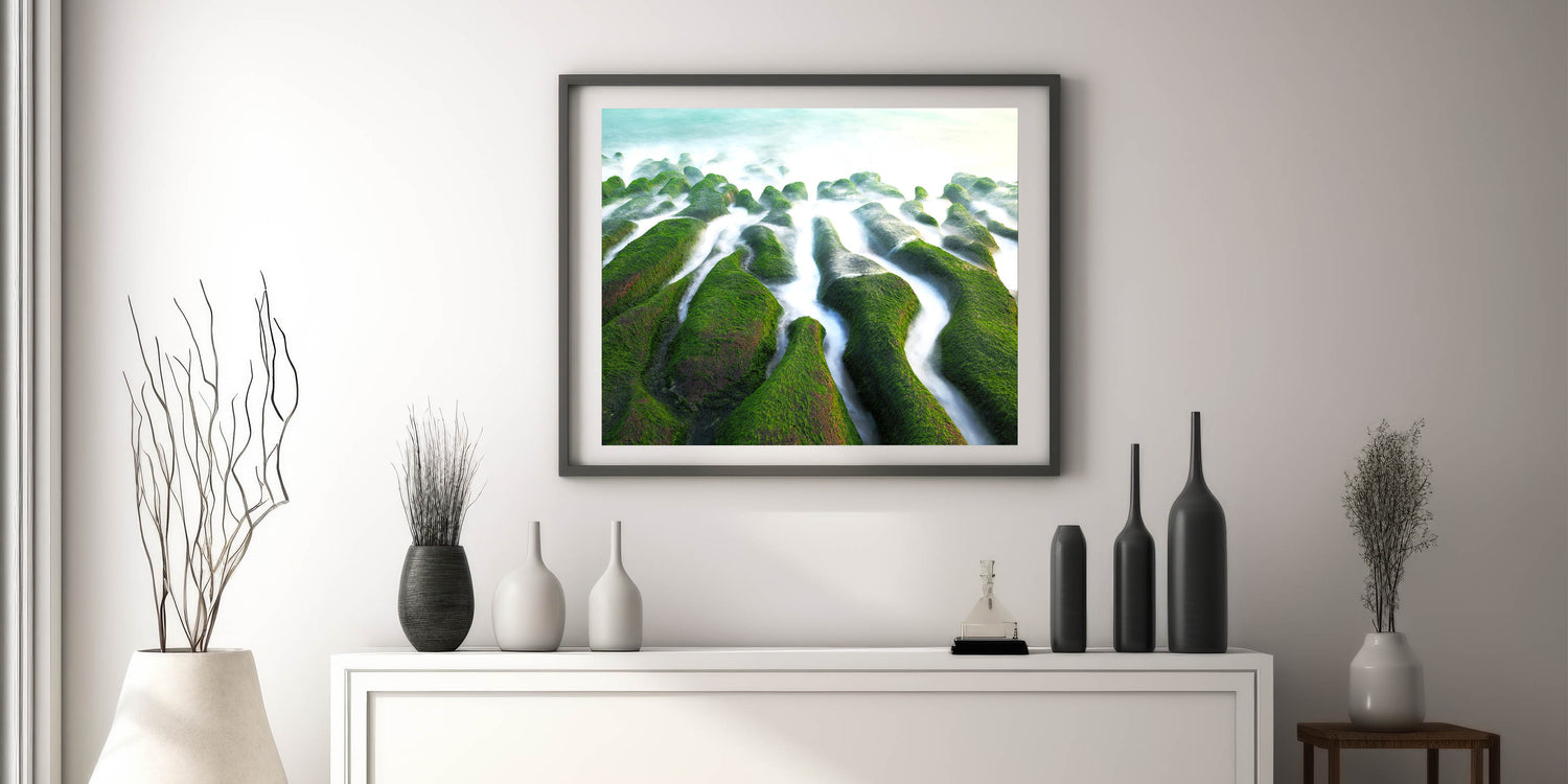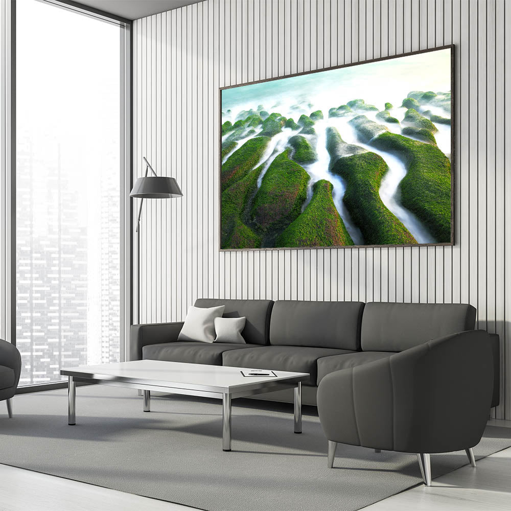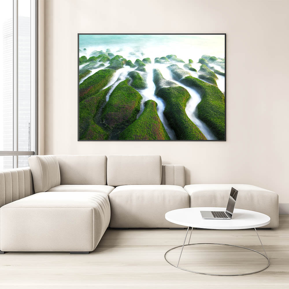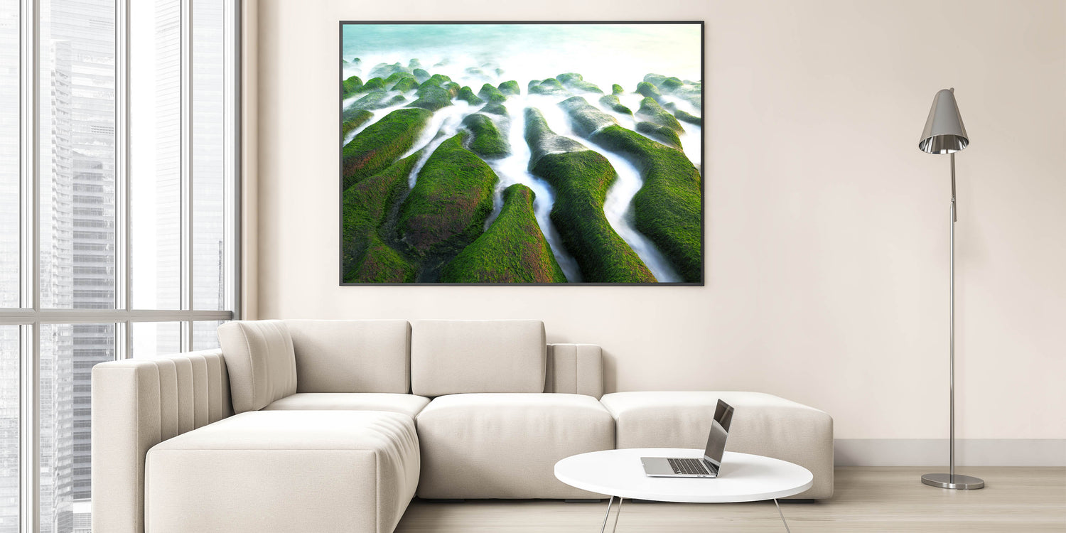 Bring the serene beauty of Taiwan’s coast into your space with this breathtaking wall art featuring lush green rock formations, gently shaped by the ocean’s waves. The intricate texture of the rocks and the peaceful flow of the water make this artwork a perfect choice for those who admire Taiwanese landscapes and beautiful Taiwan scenery. This piece is an excellent representation of Asia region wall art, celebrating the natural wonders of Taiwan’s iconic landmarks.