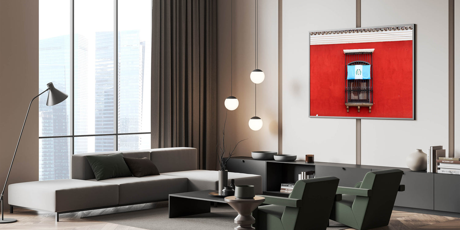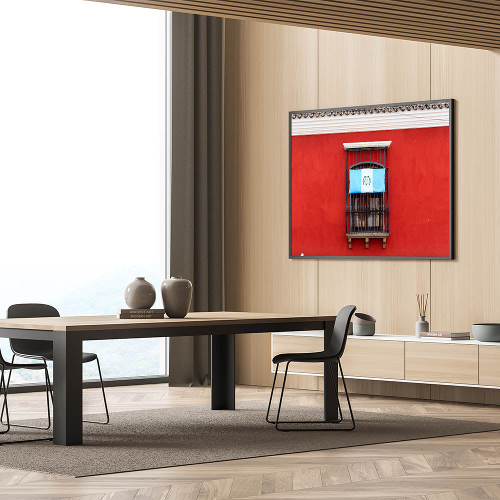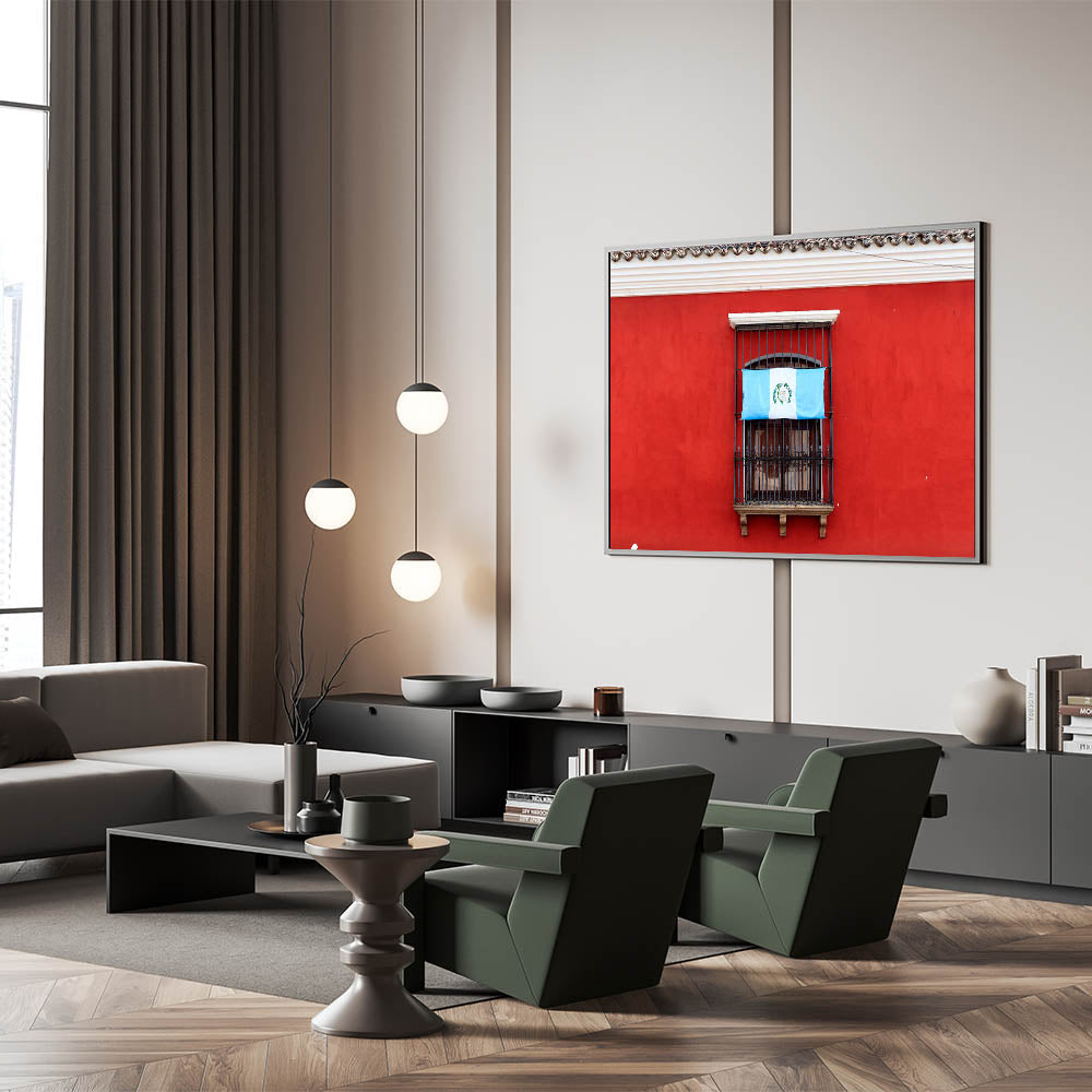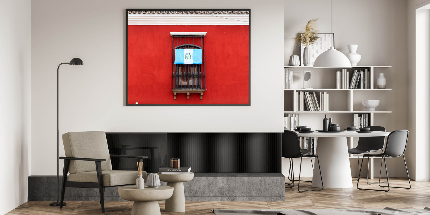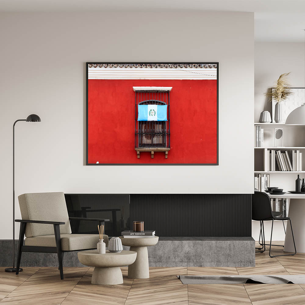 Discover the vibrant spirit of Guatemala with "Patriotic Flag on Red Wall," a striking piece from our Guatemalan Art Prints collection. This artwork features the Guatemalan flag proudly displayed on a vivid red backdrop, symbolizing the nation's rich heritage and pride.