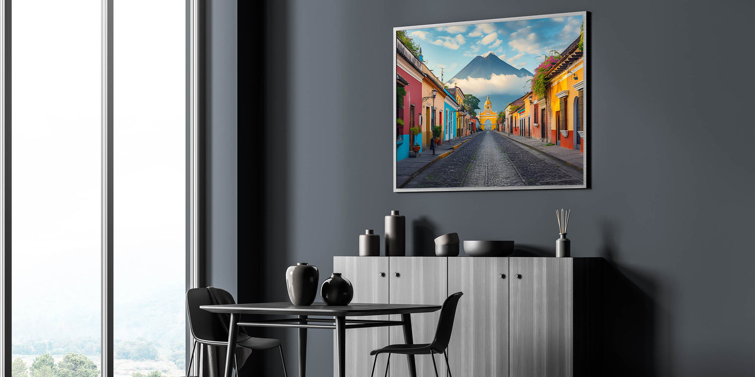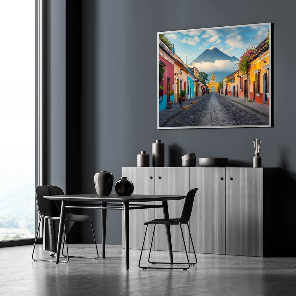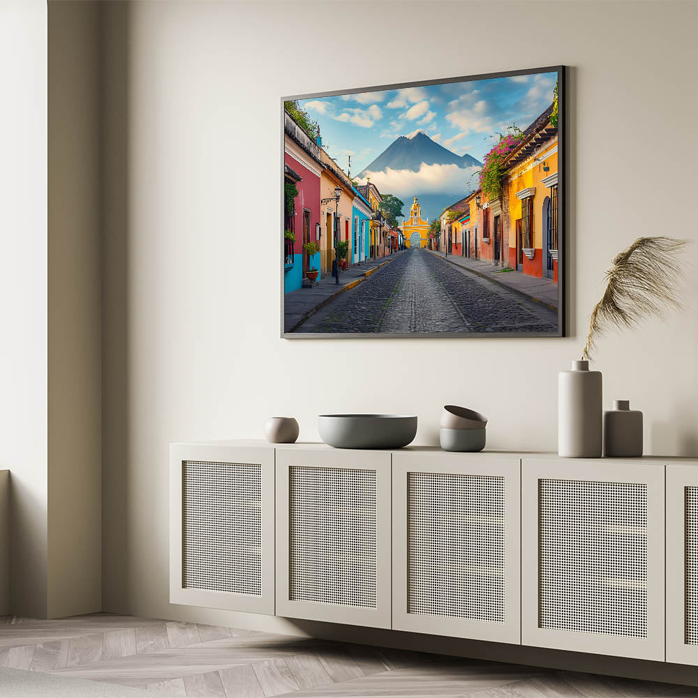 Antigua Street Art - Volcanic Horizon at Dusk" captures the serene beauty of Antigua's colorful colonial architecture with the majestic Volcano Agua looming in the backdrop. This piece showcases the iconic street leading up to the vibrant yellow arch that frames the volcano, portrayed in the soft light of sunset.