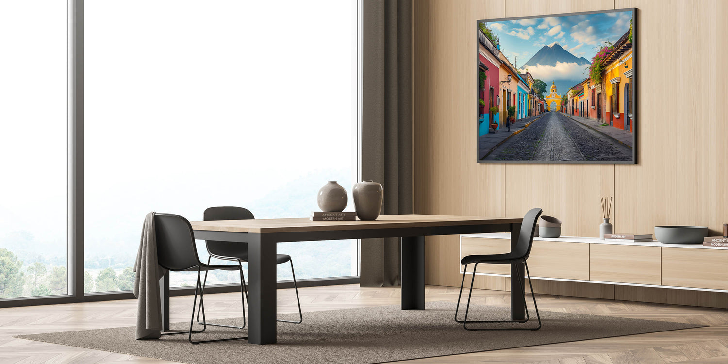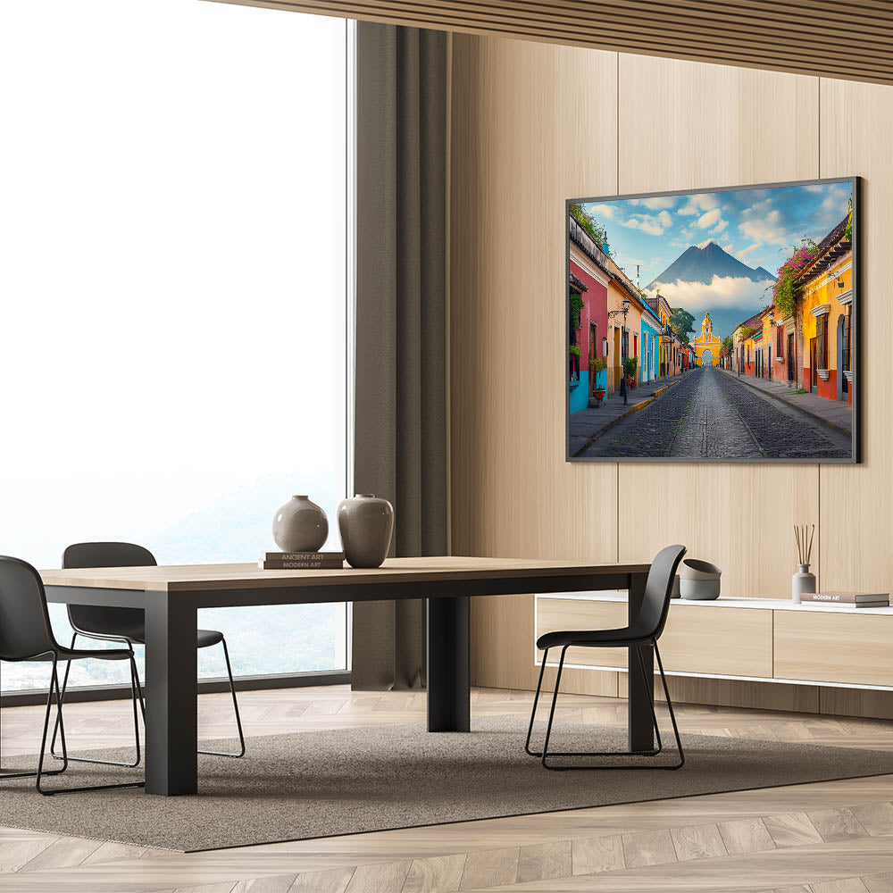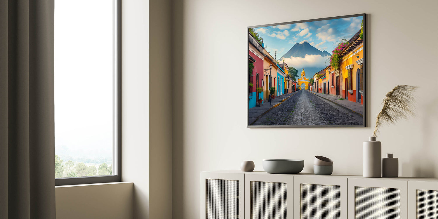 Antigua Street Art - Volcanic Horizon at Dusk" captures the serene beauty of Antigua's colorful colonial architecture with the majestic Volcano Agua looming in the backdrop. This piece showcases the iconic street leading up to the vibrant yellow arch that frames the volcano, portrayed in the soft light of sunset.