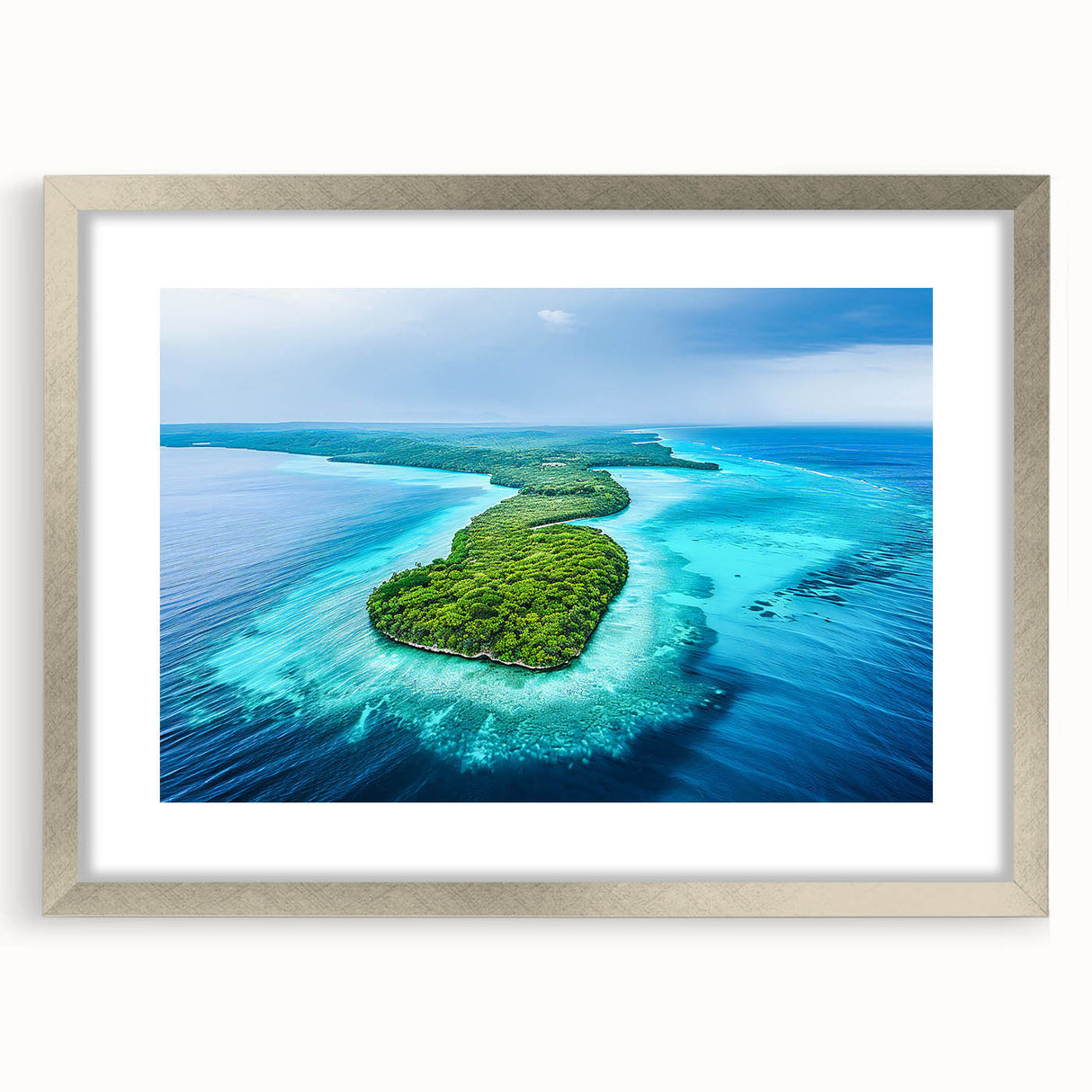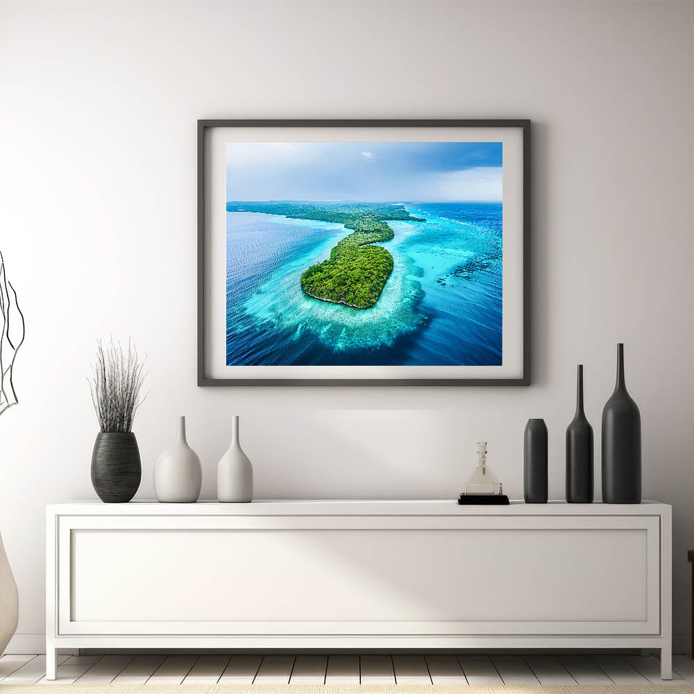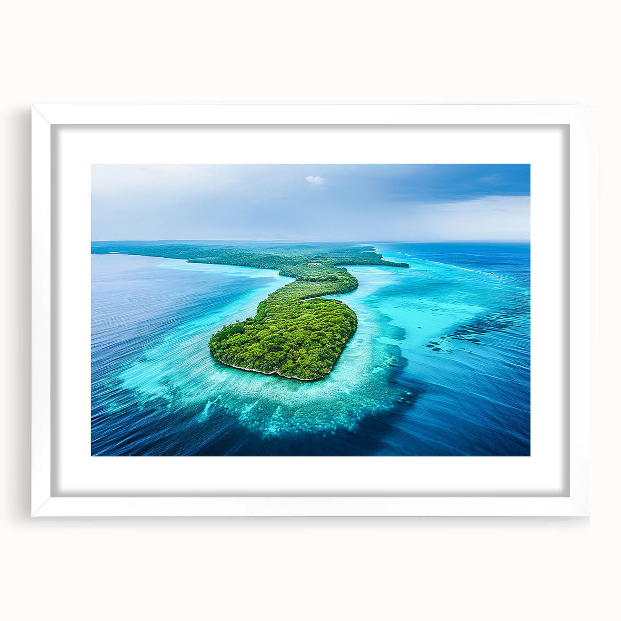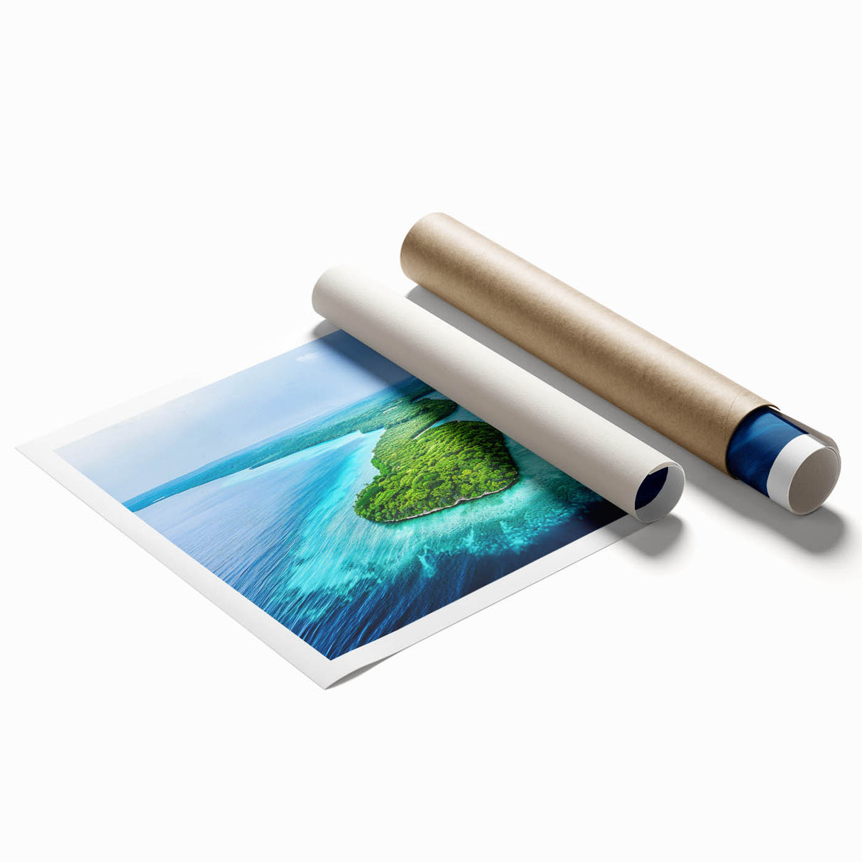 Capture the unique charm of Micronesia with our "Heart-Shaped Island Art Print" from the Pacific Ocean Art collection. This exceptional print offers a breathtaking aerial view of a naturally heart-shaped island, surrounded by the stunning turquoise waters of the Pacific.