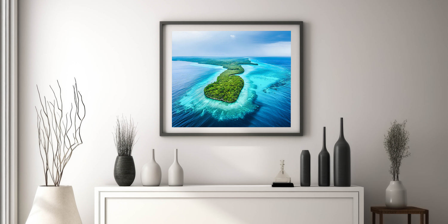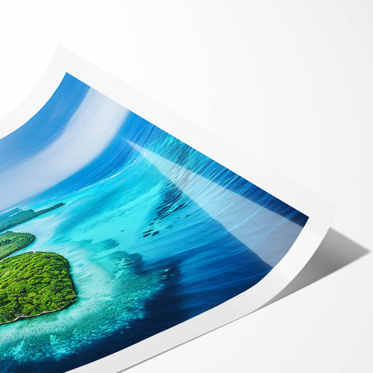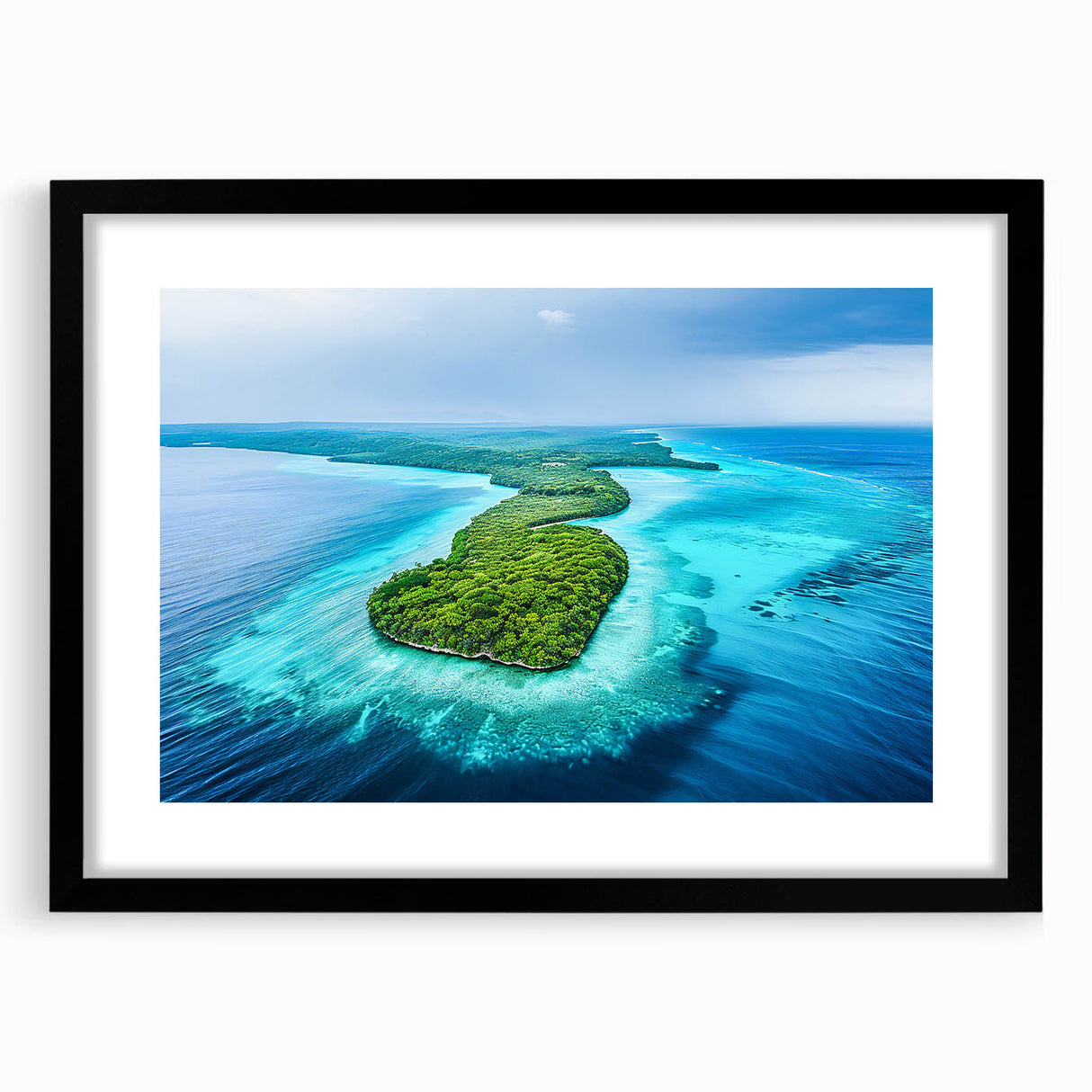 Capture the unique charm of Micronesia with our "Heart-Shaped Island Art Print" from the Pacific Ocean Art collection. This exceptional print offers a breathtaking aerial view of a naturally heart-shaped island, surrounded by the stunning turquoise waters of the Pacific.