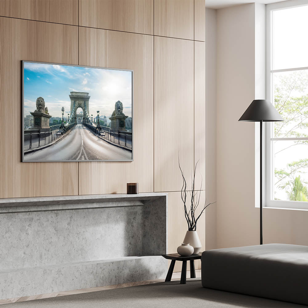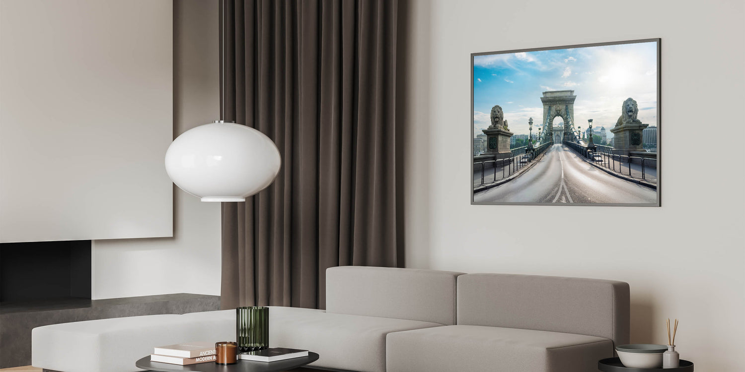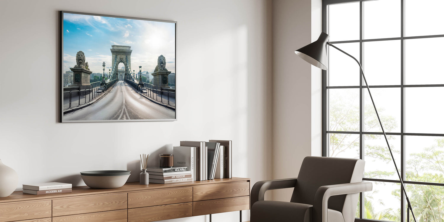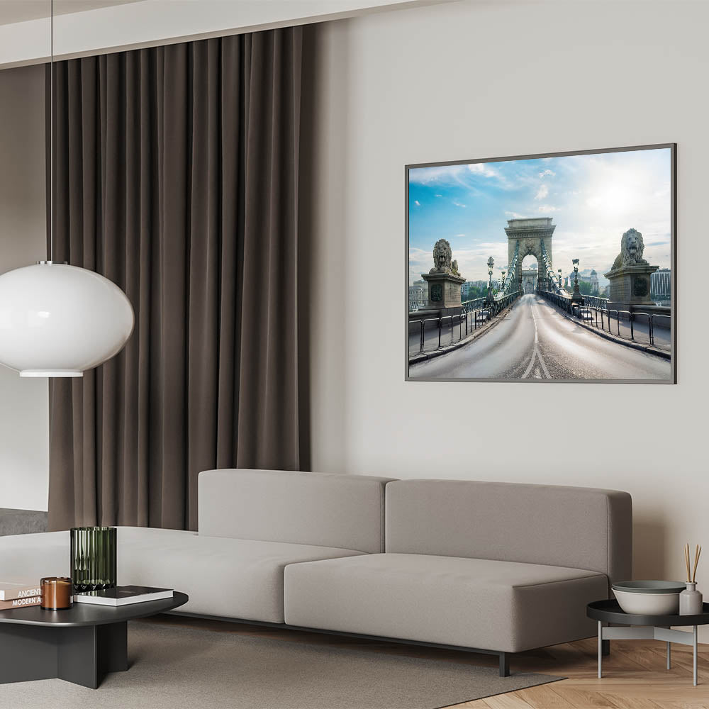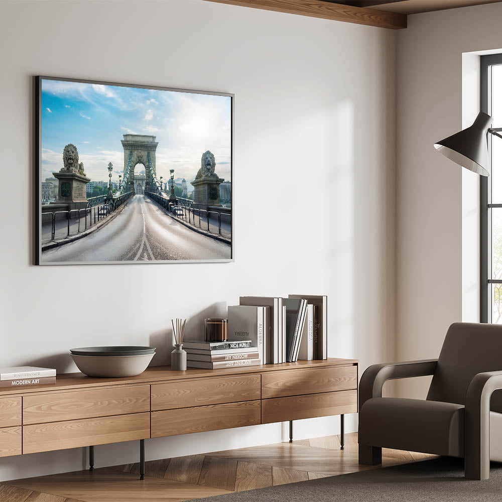 Capture the grandeur of European architecture with this striking wall art featuring the iconic Chain Bridge adorned with majestic lion statues. This high-quality canvas print beautifully showcases the bridge’s intricate design and the serene cityscape in the background, bathed in soft daylight. Ideal for adding a touch of historic elegance to your living room, office, or study, this artwork is perfect for those who appreciate classic architecture and timeless beauty.
