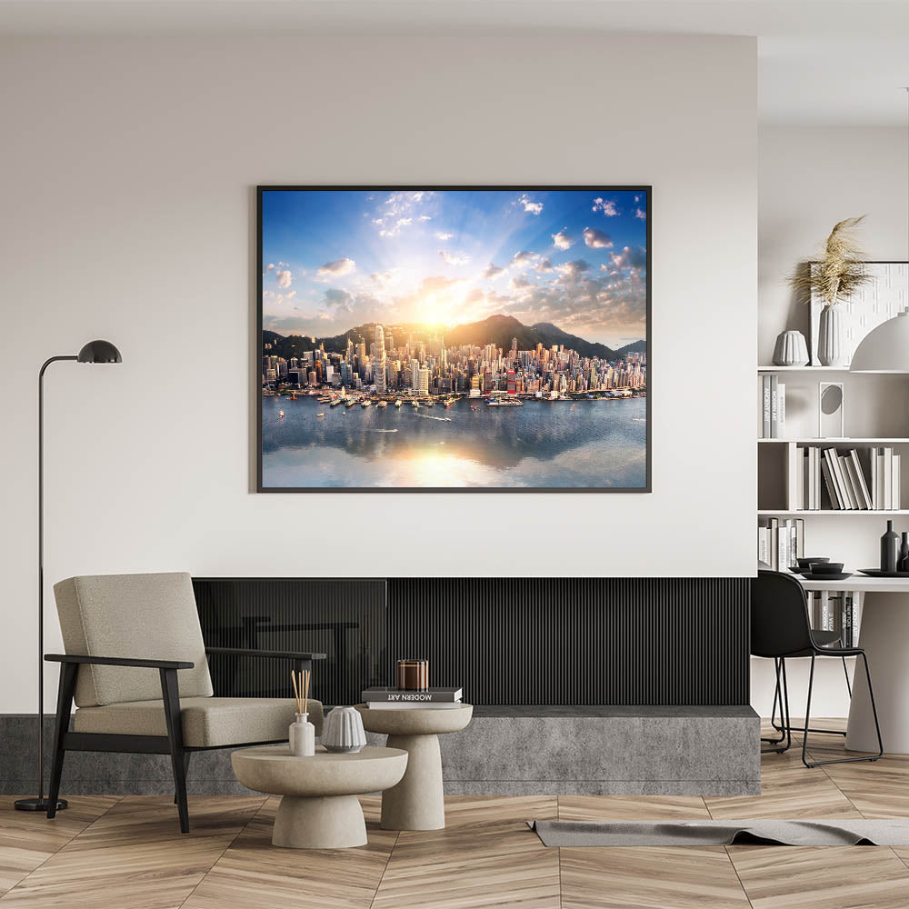Experience the vibrant energy of Hong Kong with this breathtaking Hong Kong skyline canvas art. Capturing the city at dawn, this stunning cityscape art print showcases the iconic skyline bathed in the golden hues of sunrise. The intricate details of the skyscrapers, contrasted against the serene waters of Victoria Harbour, make this Hong Kong panorama art a captivating addition to any space.