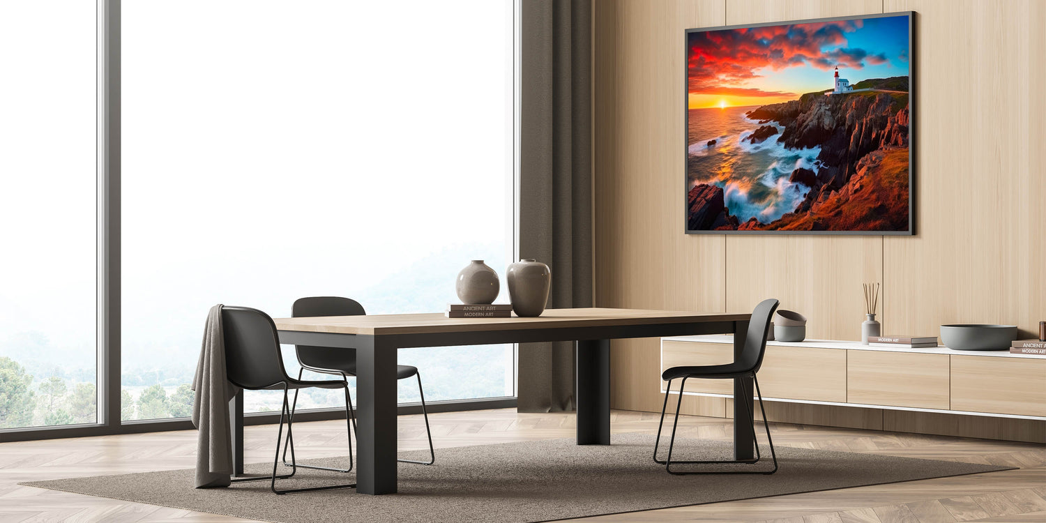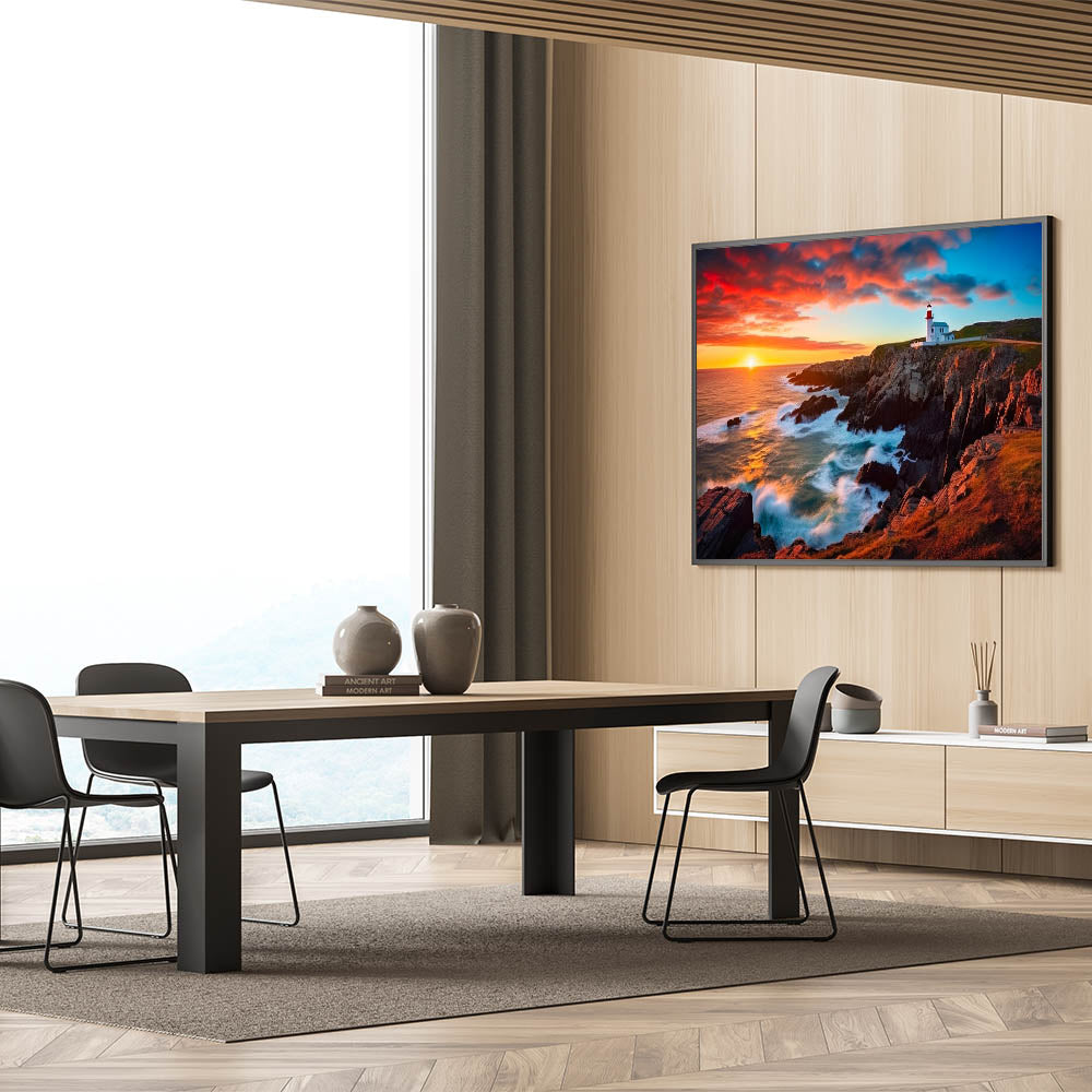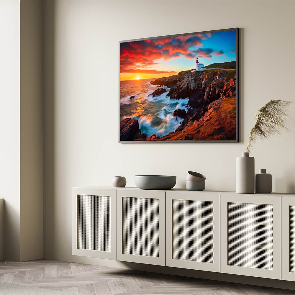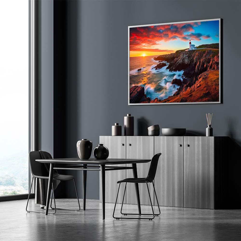 Immerse yourself in the stunning beauty of Newfoundland’s coastline with this dramatic lighthouse sunset wall art. The vibrant colors of the sky, ranging from deep red to orange and blue, reflect on the waves crashing against the rugged cliffs. The lighthouse stands tall, bathed in the warm glow of the setting sun, creating a perfect focal point. This artwork is ideal for those who love coastal scenery and captivating sunsets.
