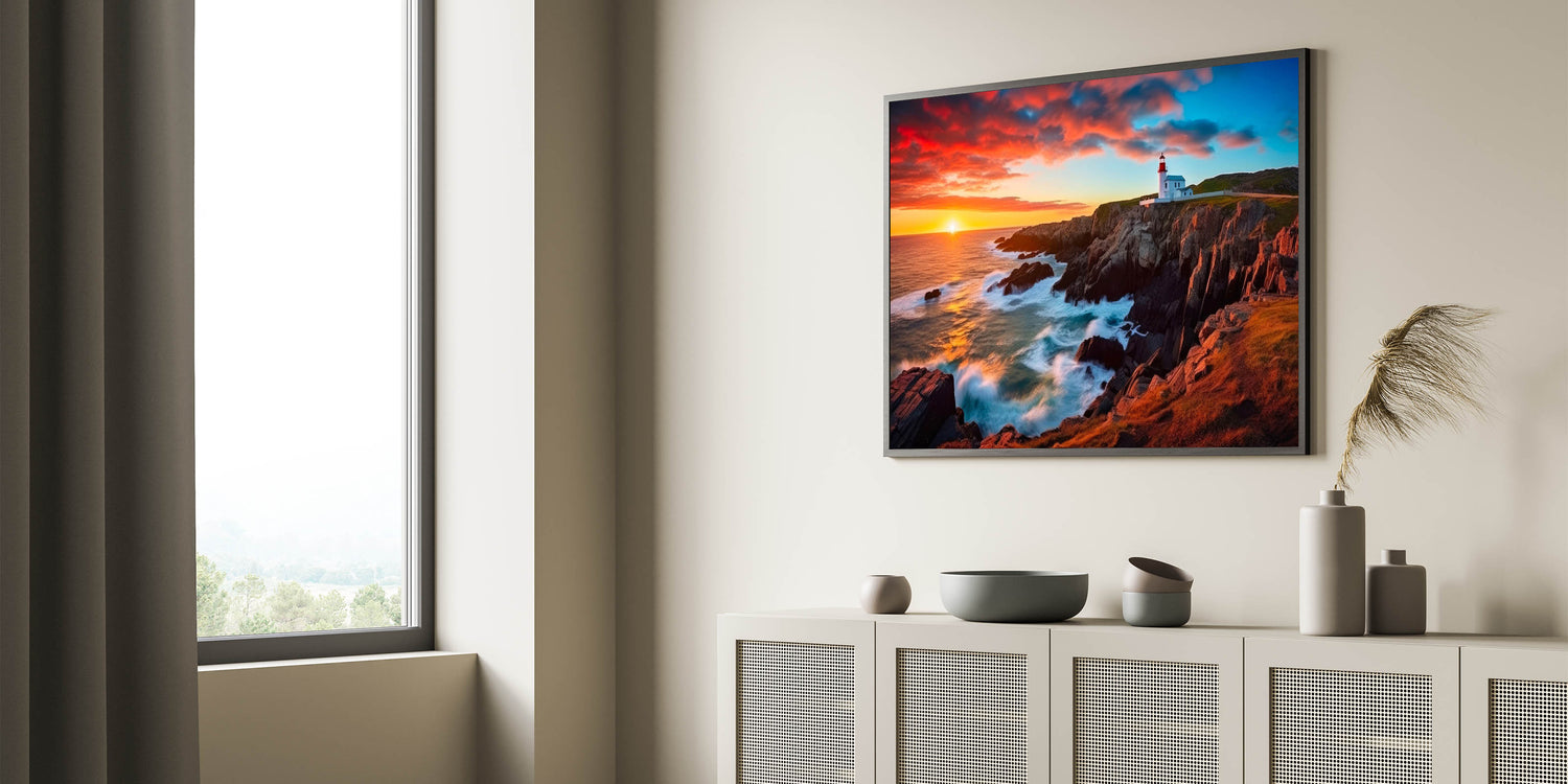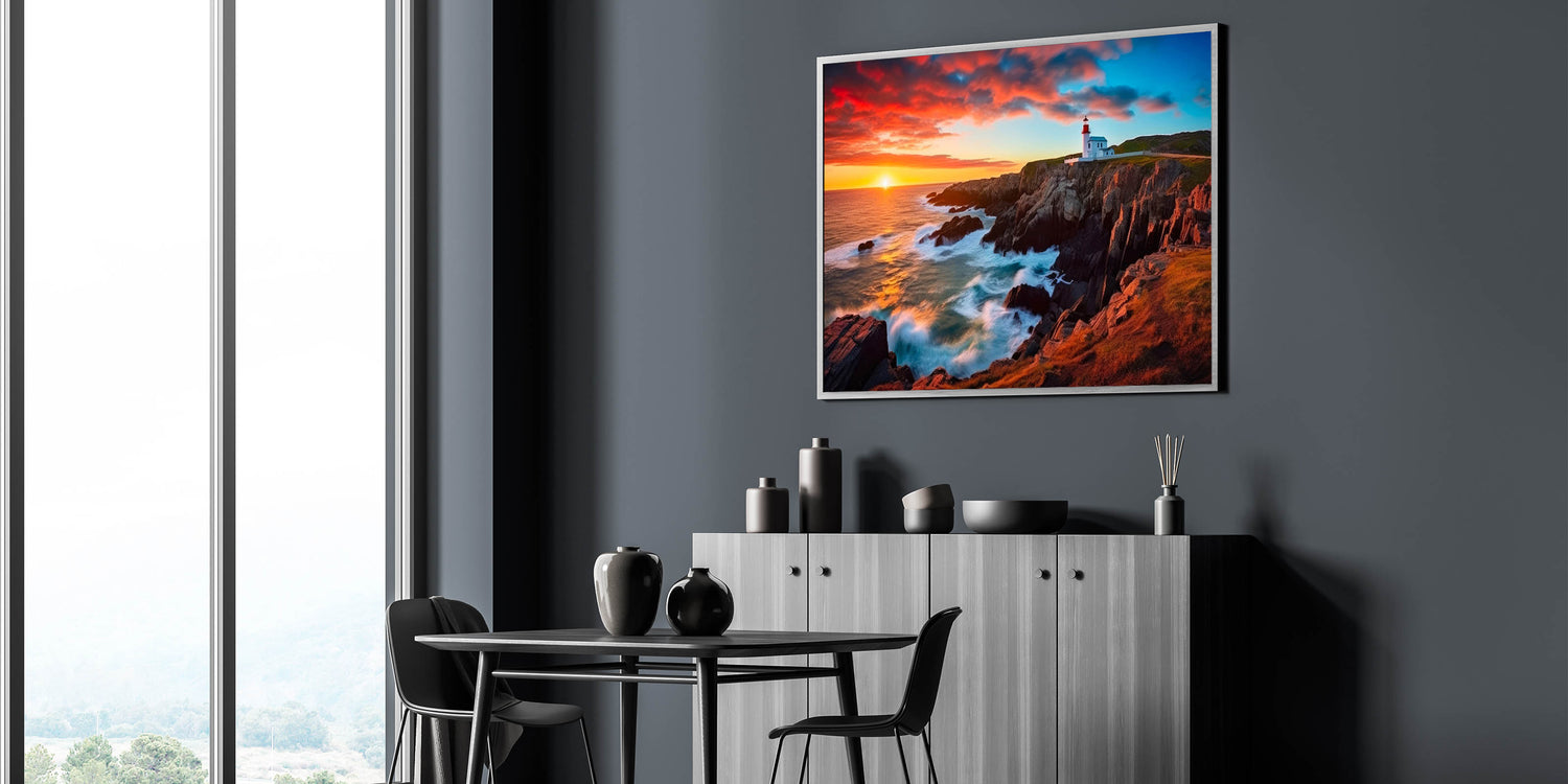 Bring the awe-inspiring beauty of Newfoundland’s sunsets into your home with this striking lighthouse wall art. Whether for your own decor or as a unique gift, this artwork will brighten up any space with its vibrant coastal colors and dramatic scenery.