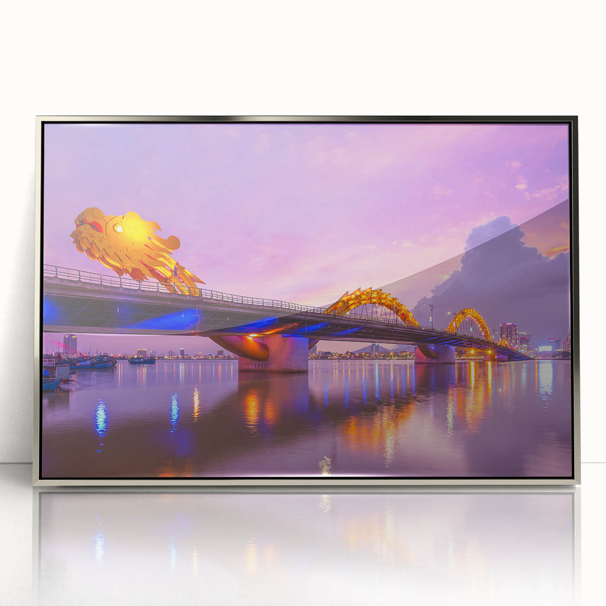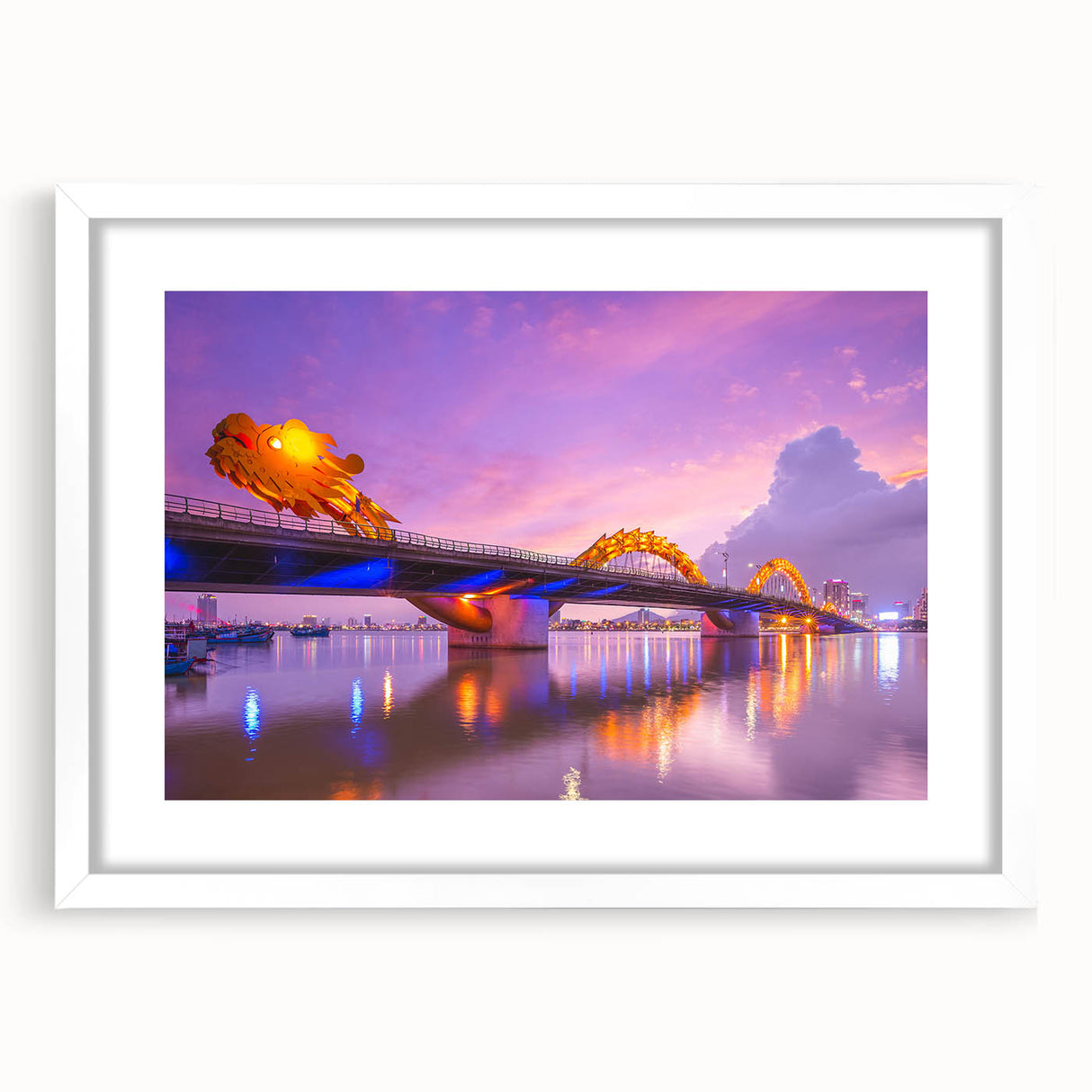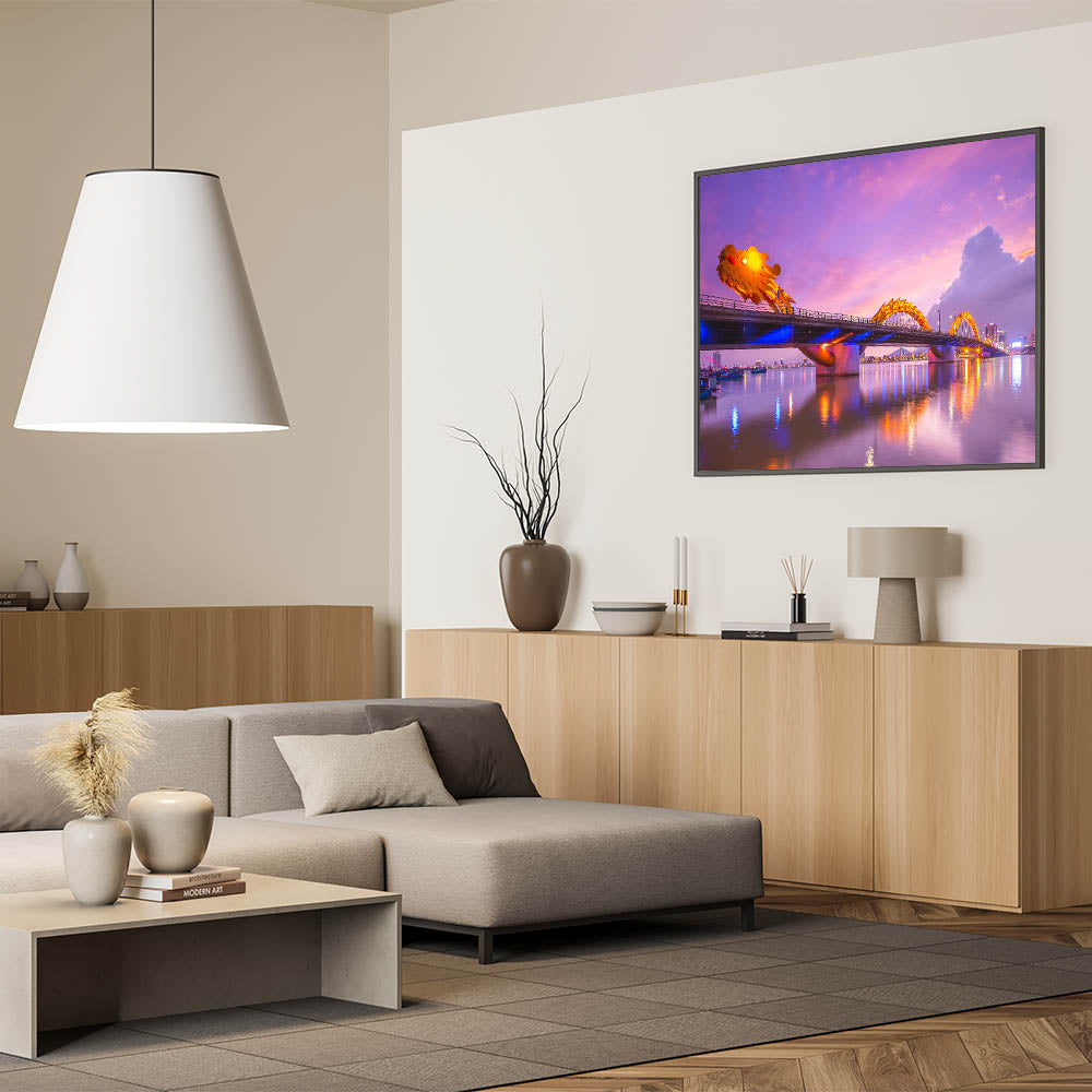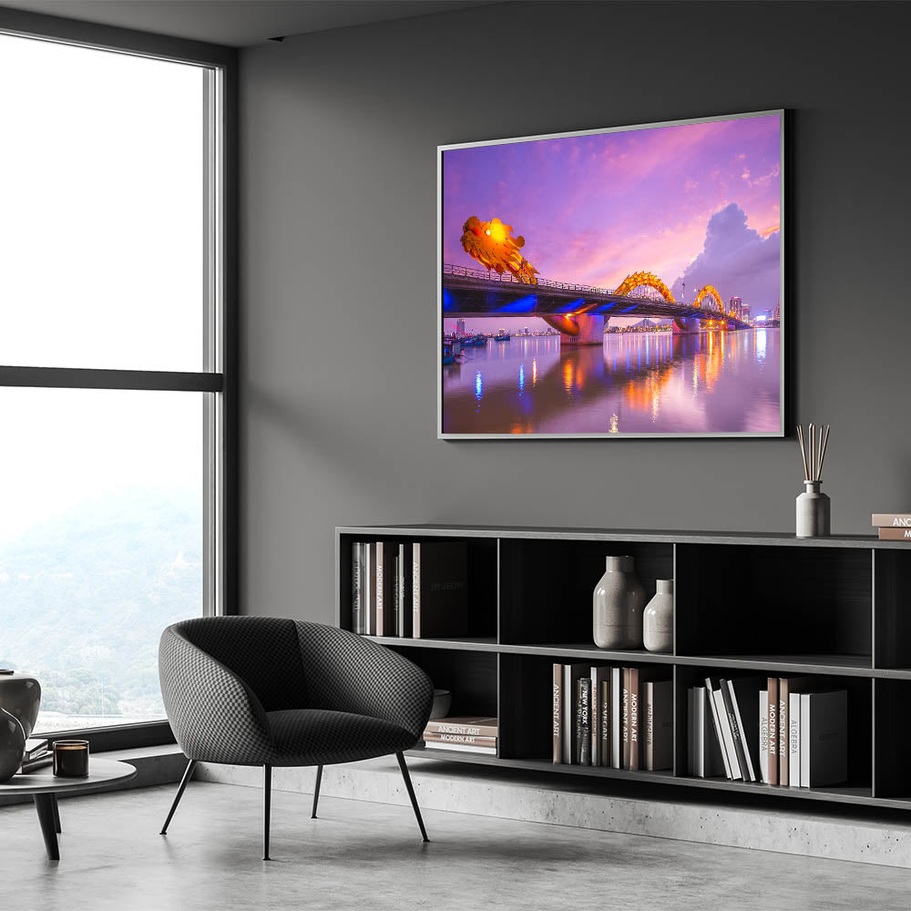 - High-quality Vietnamese cityscape print capturing the illuminated Dragon Bridge