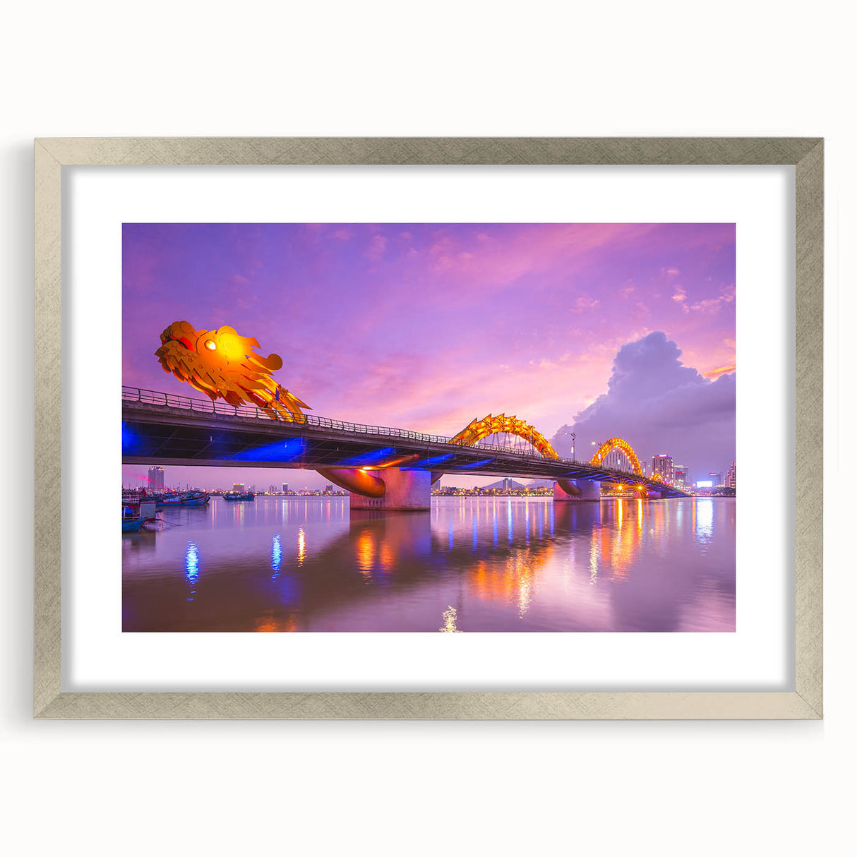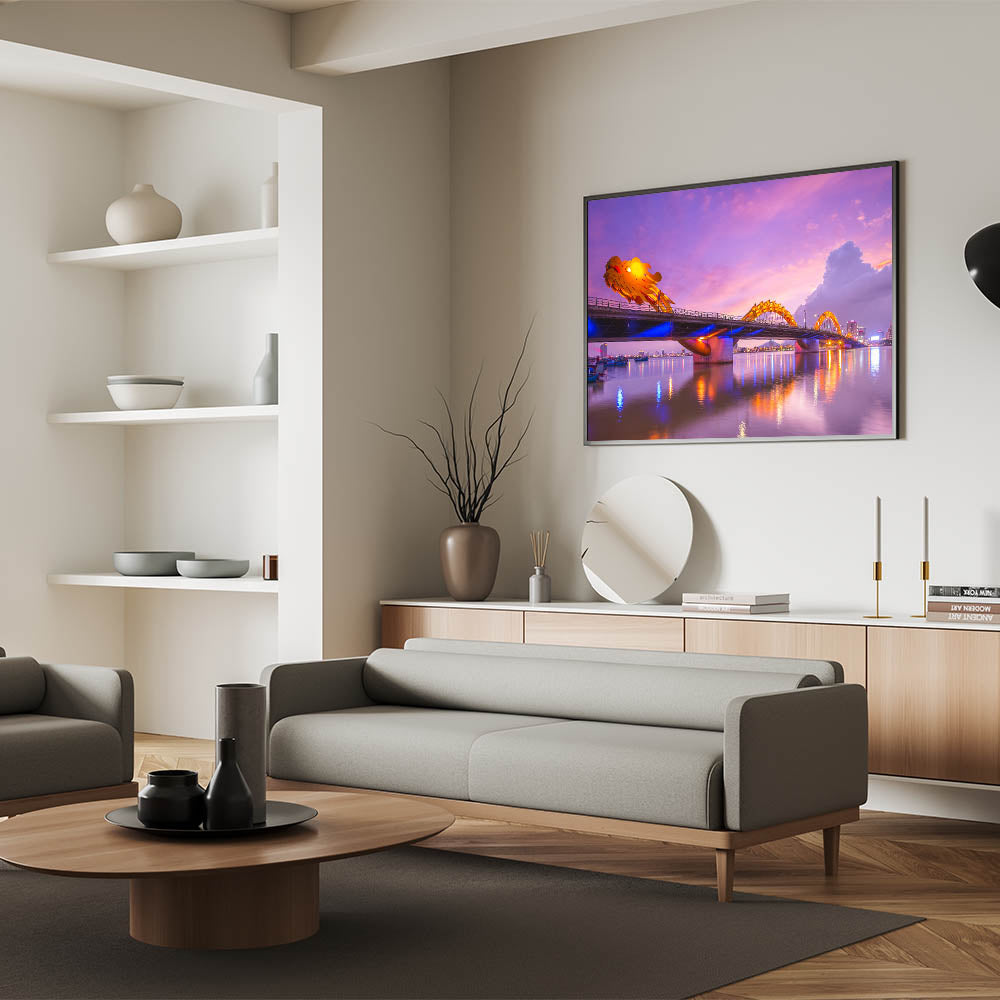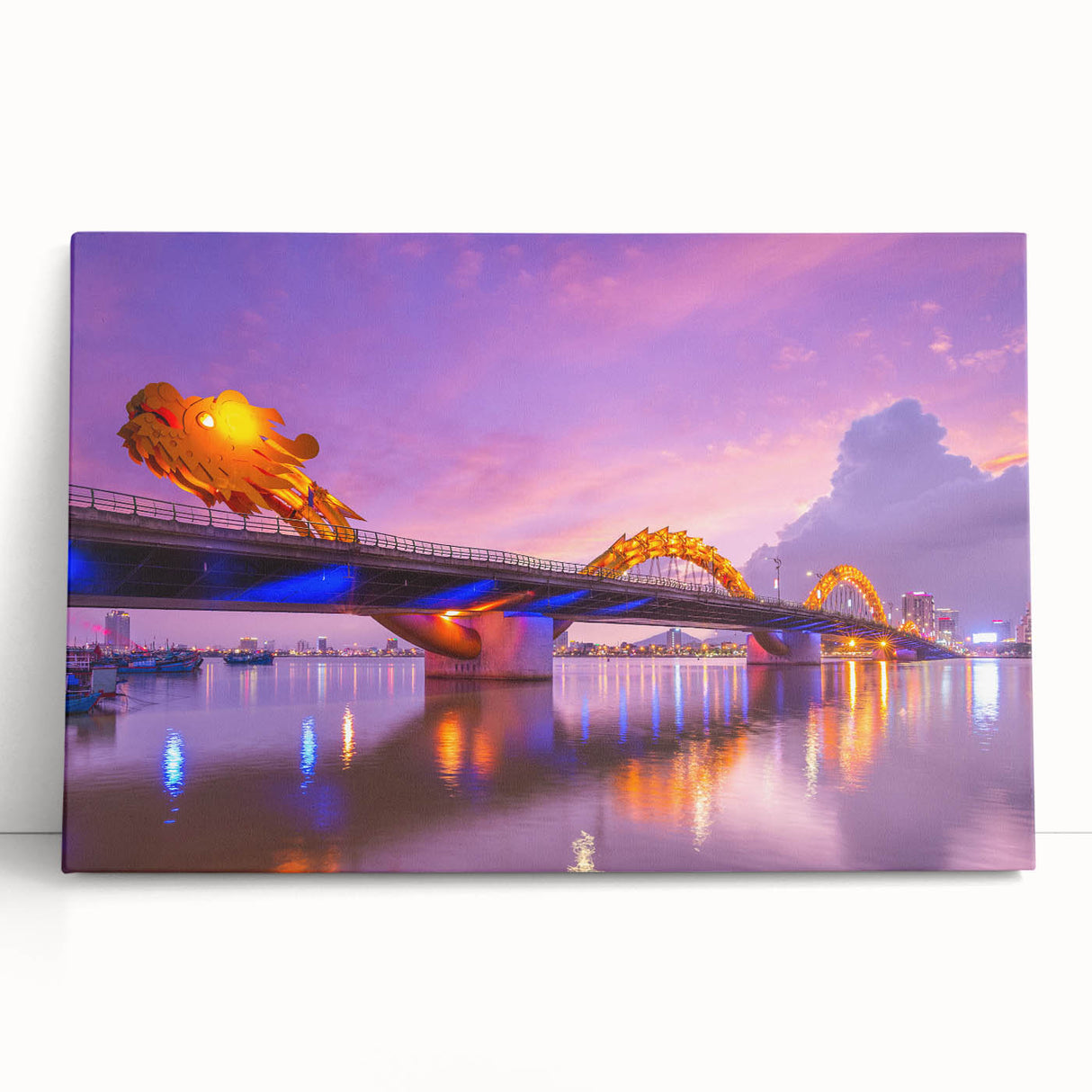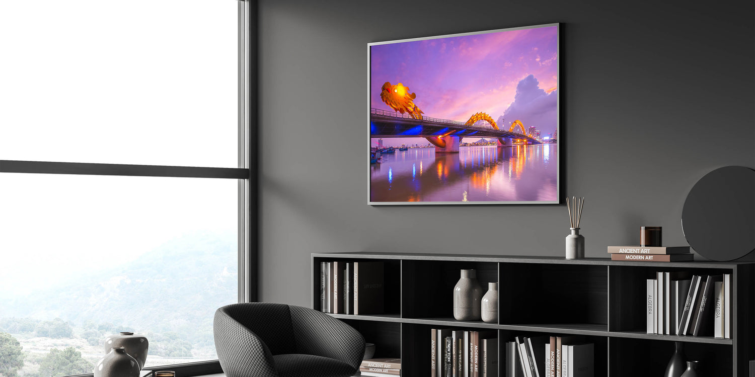 - High-quality Vietnamese cityscape print capturing the illuminated Dragon Bridge