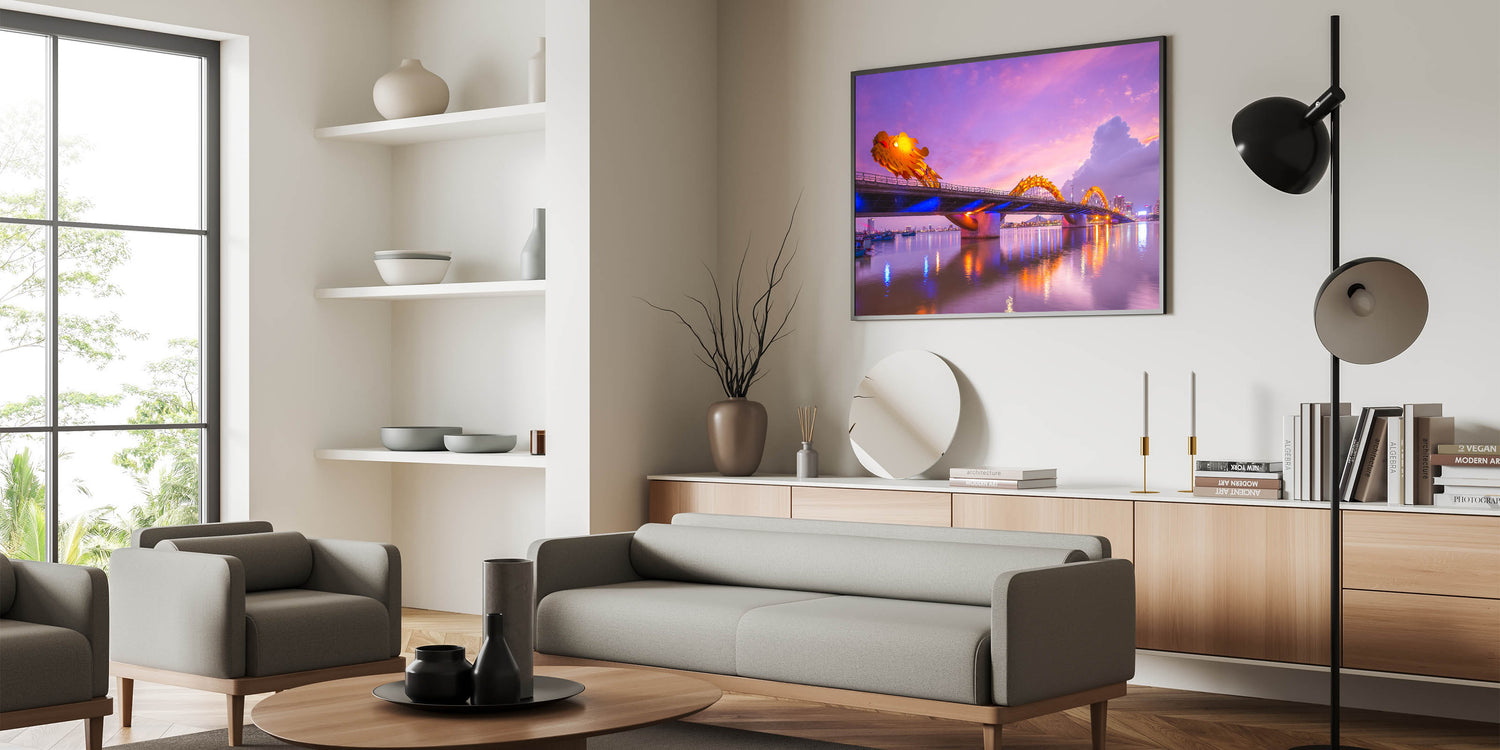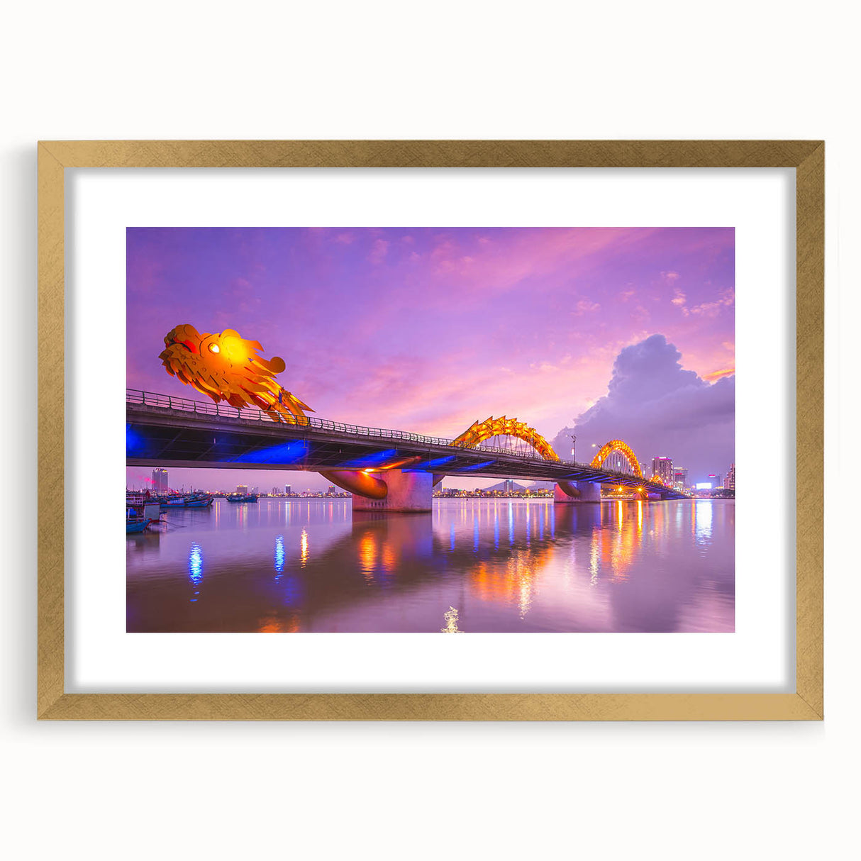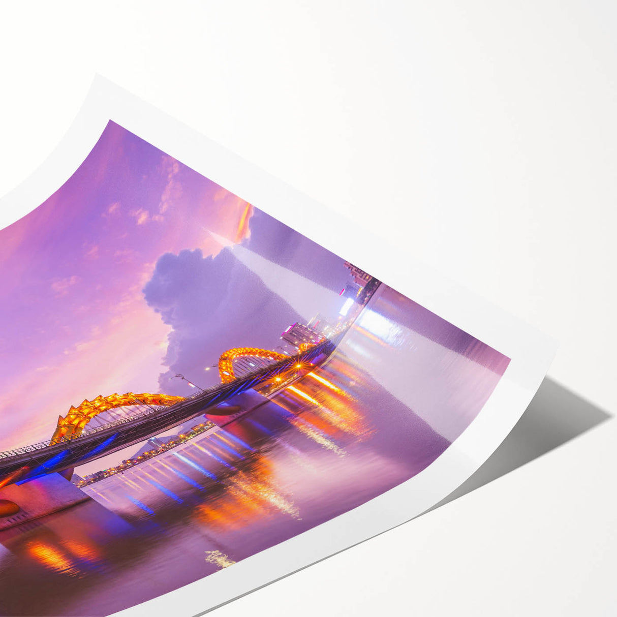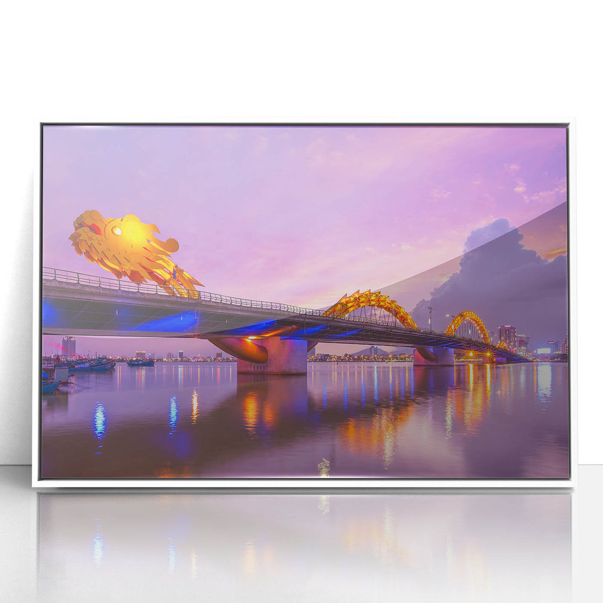 - High-quality Vietnamese cityscape print capturing the illuminated Dragon Bridge