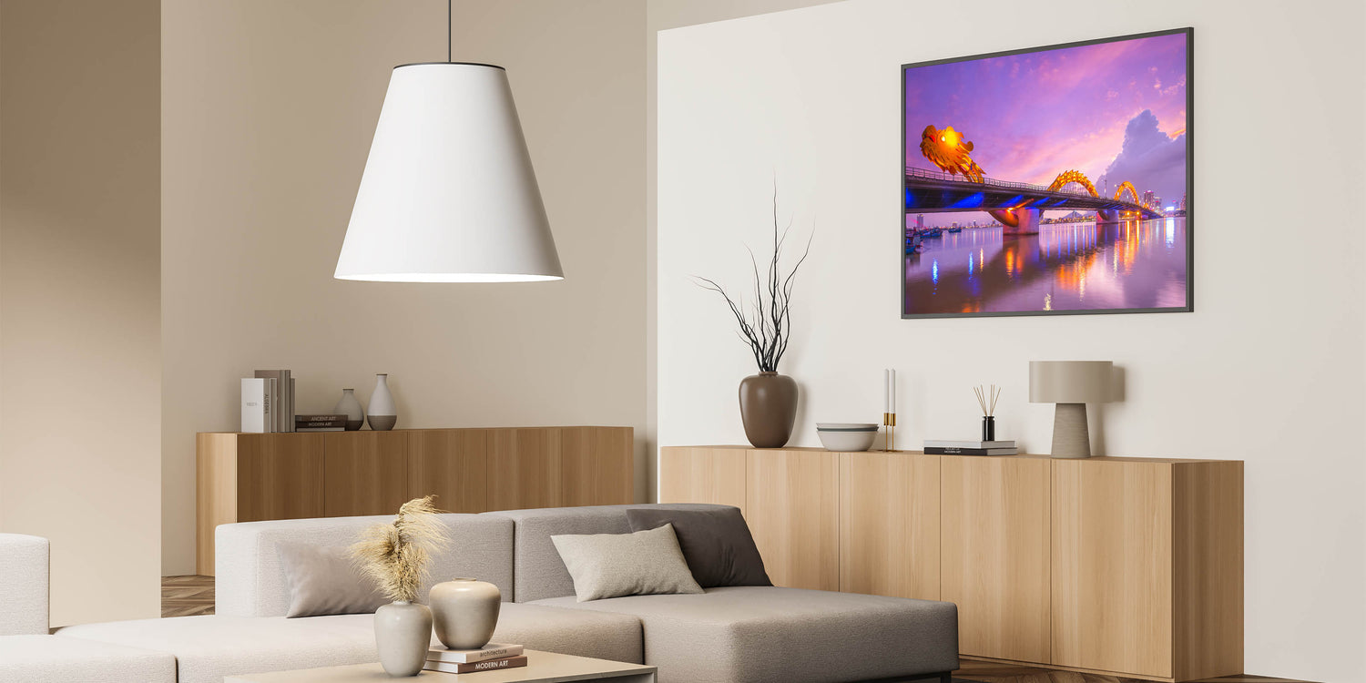 Illuminate your space with the breathtaking "Illuminated Dragon Bridge" wall art, capturing the vibrant essence of Vietnam's famous Dragon Bridge at dusk. This print features the stunning architectural marvel, with its glowing dragon sculpture winding across the river against a backdrop of the city's evening lights.