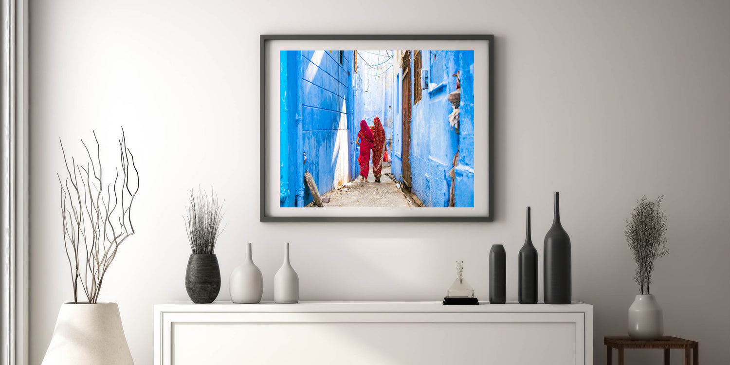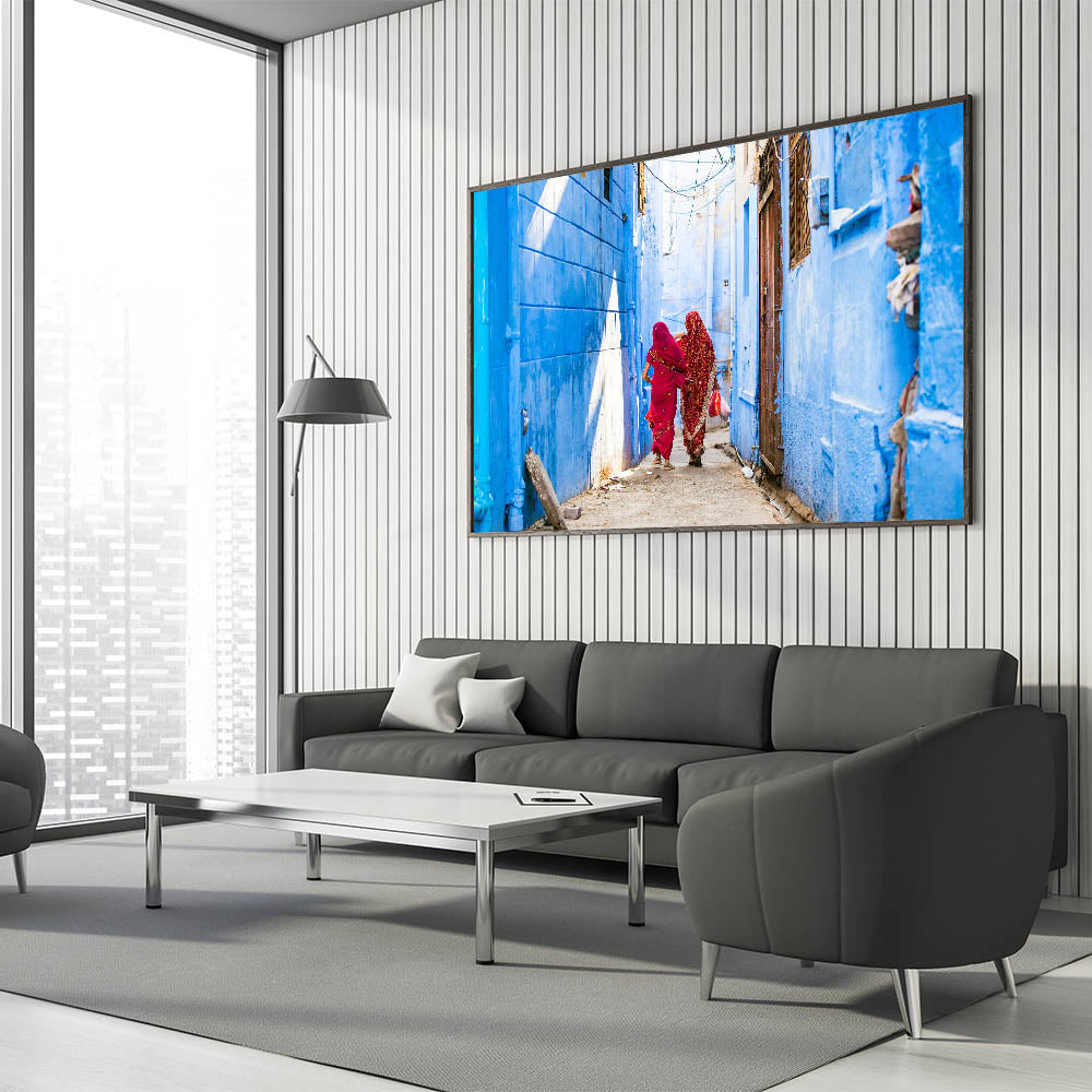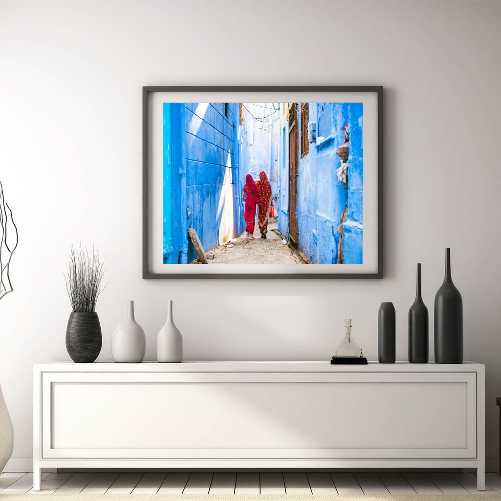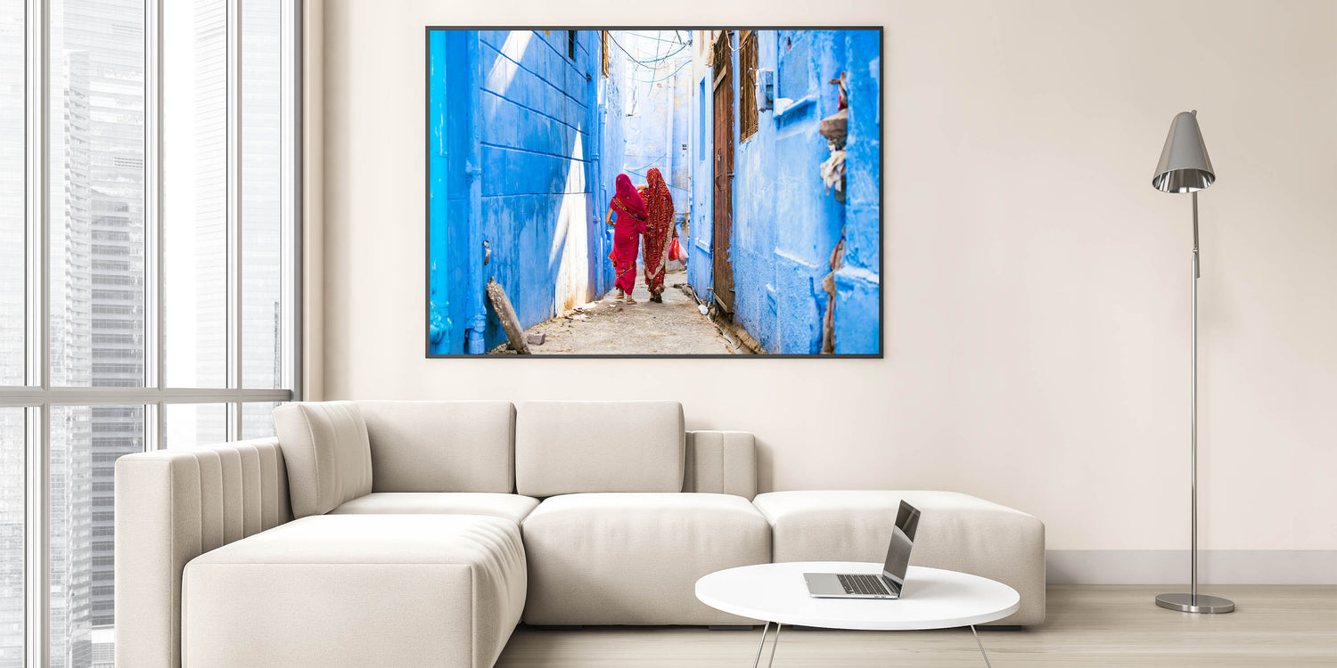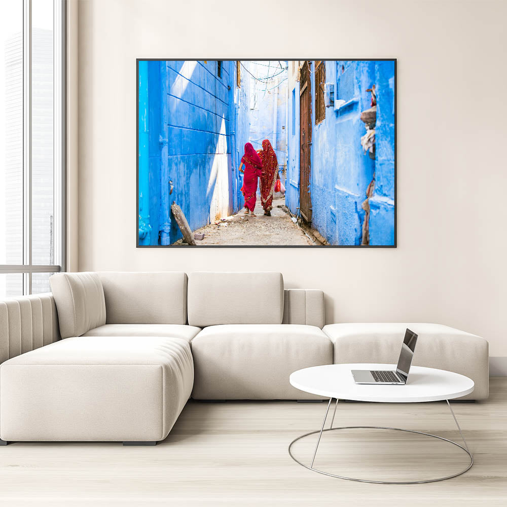 Experience the vibrant culture of India with this striking Indian Landscape Canvas featuring the iconic blue streets of Jodhpur. This captivating artwork showcases two women in traditional Indian attire walking through the narrow alleys, surrounded by the stunning blue architecture that Jodhpur is famous for. The bold contrast between the vibrant red saris and the blue walls creates an eye-catching and culturally rich scene, perfect for adding a splash of color to any space.