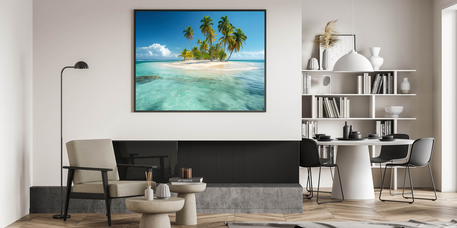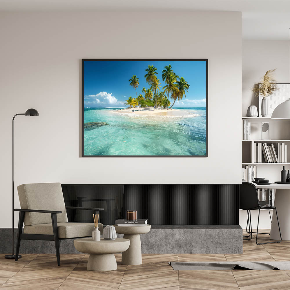 Escape to a tropical paradise with this stunning wall art, featuring a serene beach scene on a small island surrounded by crystal-clear waters and tall palm trees. The vibrant blue sky, lush greenery, and white sand create an idyllic view that brings the warmth and beauty of the Caribbean right into your space. This artwork is perfect for anyone looking to add a touch of tropical elegance to their home or office decor.