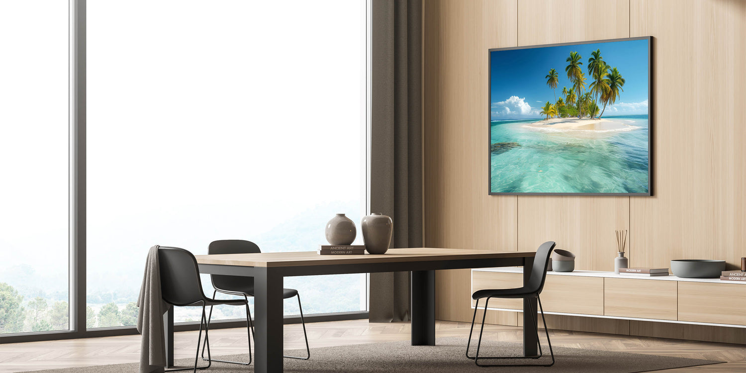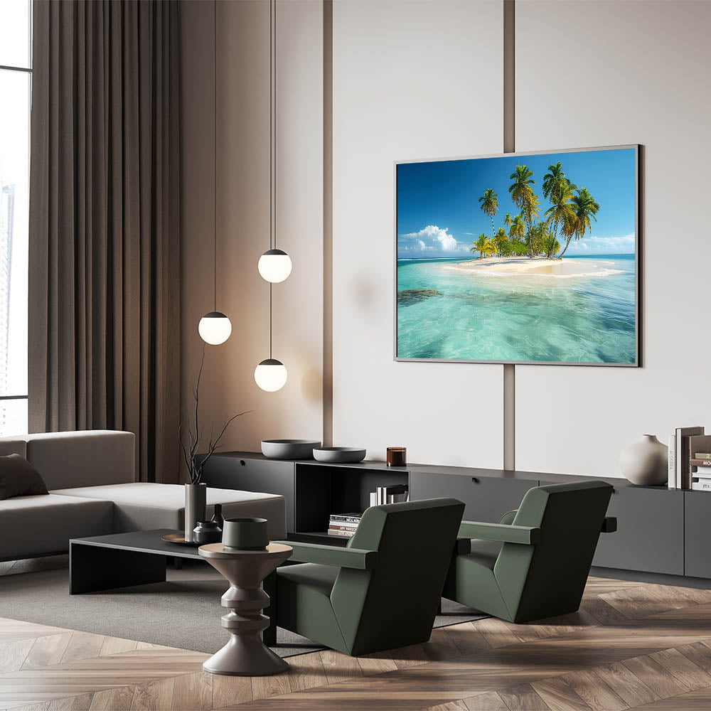 • Tropical Island Scene: A breathtaking image of a palm tree-covered island surrounded by turquoise waters, ideal for creating a serene and refreshing atmosphere.