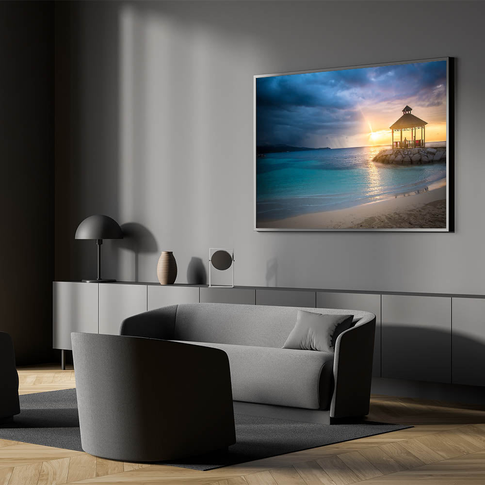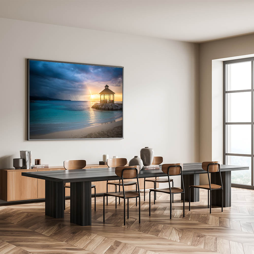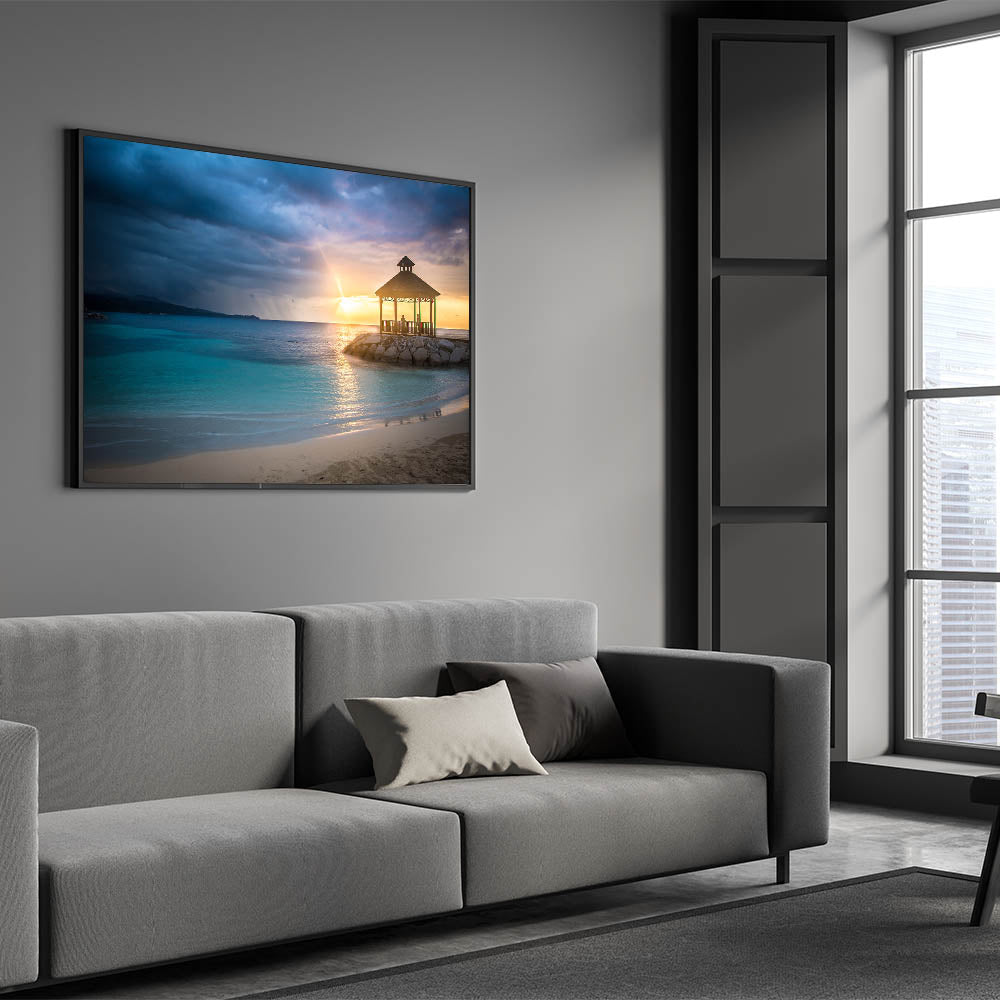 Capture the breathtaking beauty of a Caribbean sunset with this stunning wall art. Featuring a peaceful pavilion set against the backdrop of a golden sunset and turquoise waters, this artwork transports you to the serene beaches of Jamaica. Whether you're looking to add a touch of tropical elegance to your space or simply want to evoke the warmth of island living, this piece is perfect for any decor.