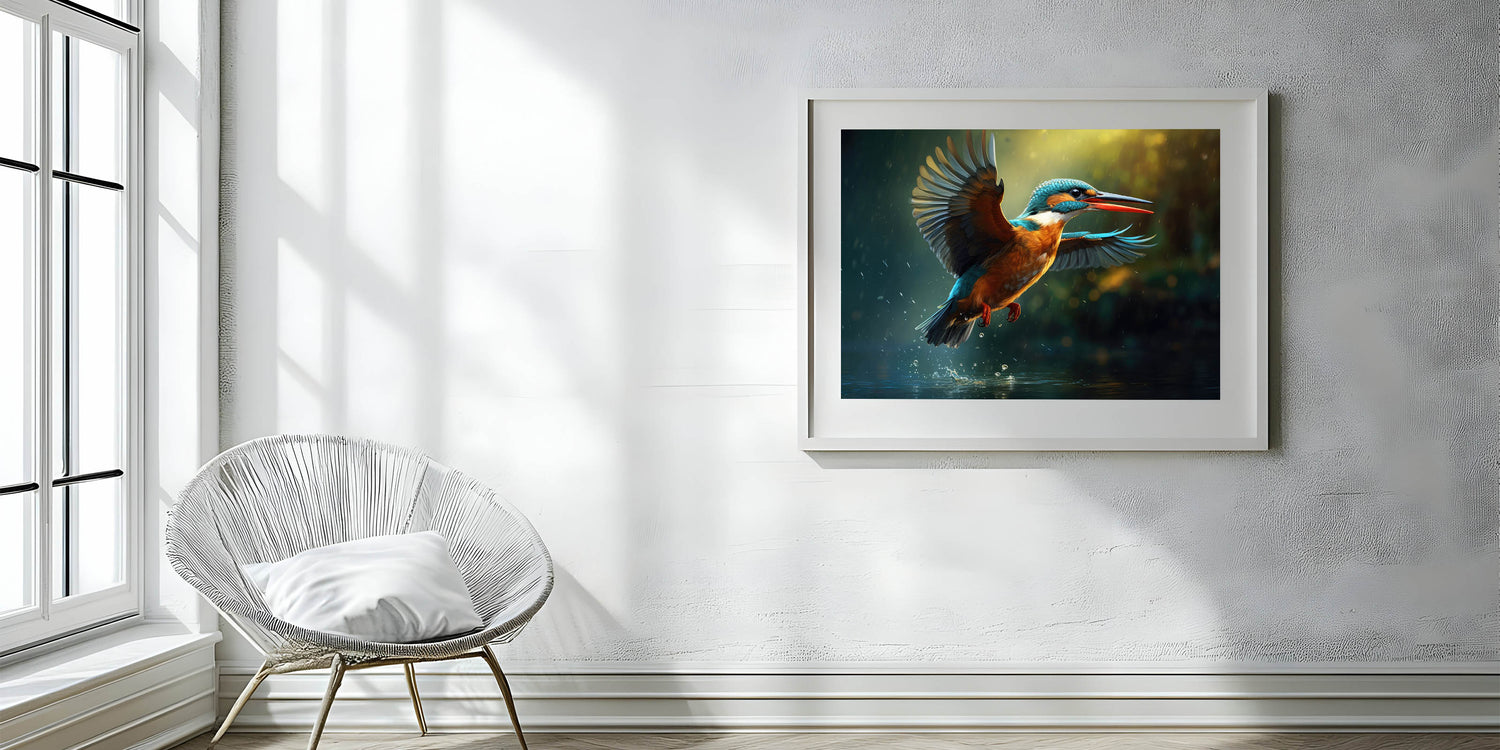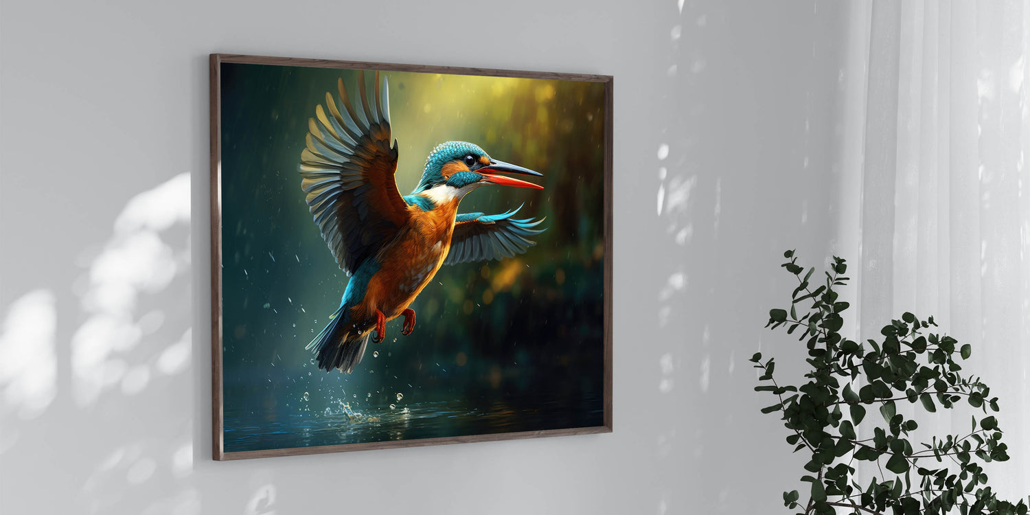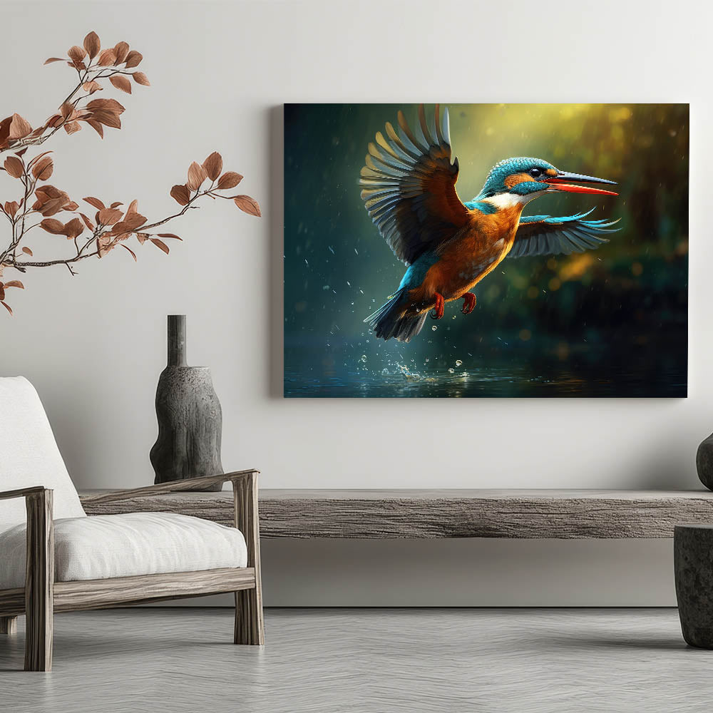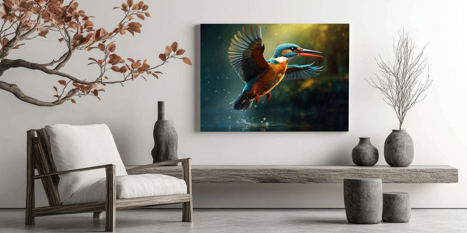 - High-Definition Print: Stunning clarity and color fidelity bring out the intricate details of the kingfisher's feathers and the shimmering water.
