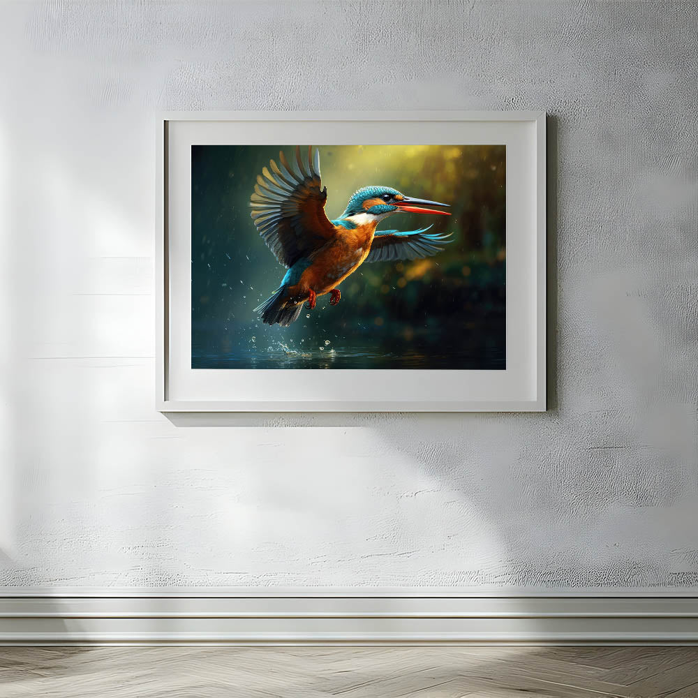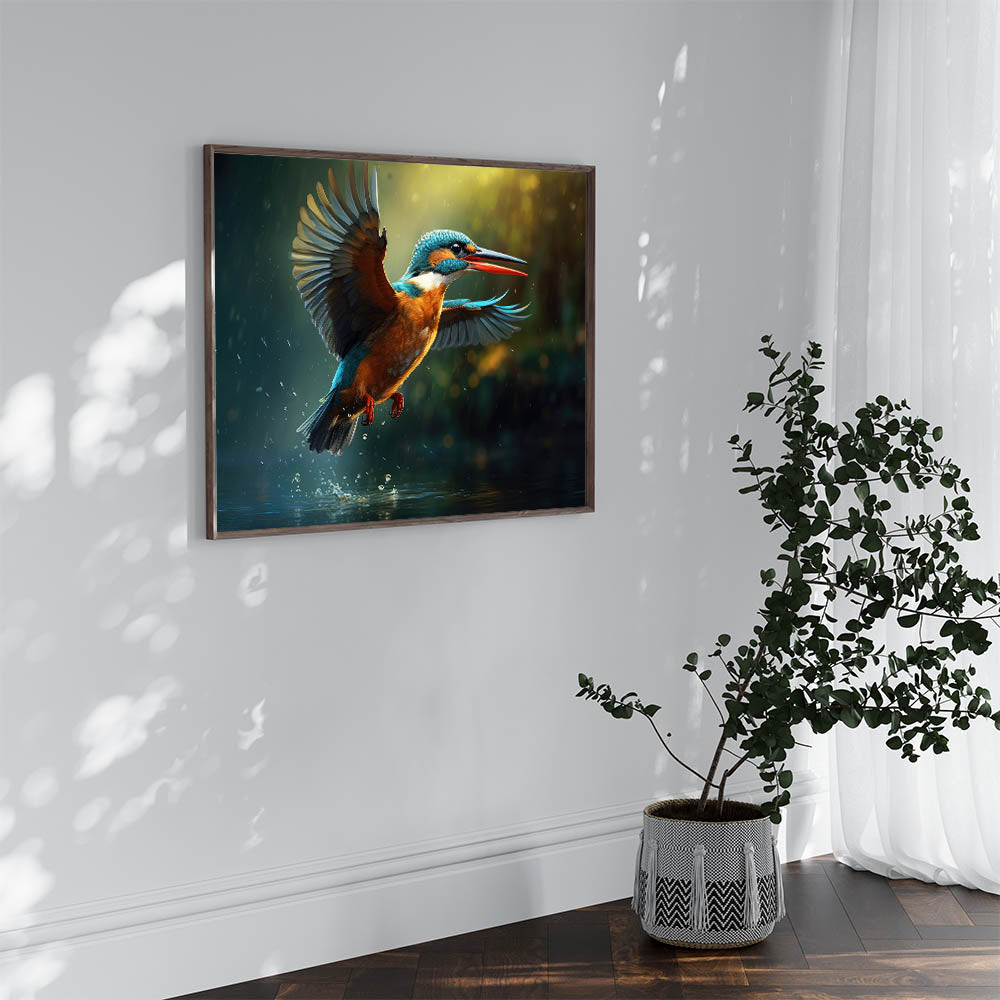 Capture the breathtaking beauty of nature with this stunning Kingfisher in Flight Wall Art. This artwork showcases the exquisite detail and vibrant colors of a kingfisher as it gracefully rises from the water, droplets flying in its wake. The dynamic pose and rich, saturated colors make this piece an eye-catching addition to any room, perfect for bringing a sense of movement and life into your space.