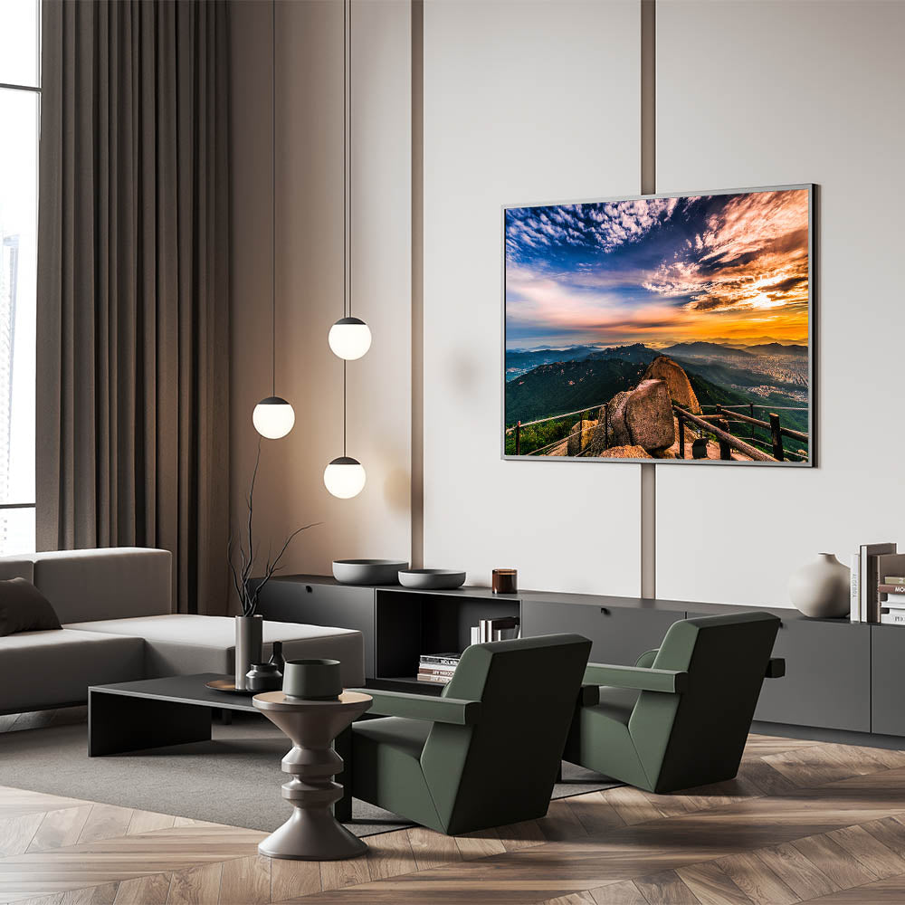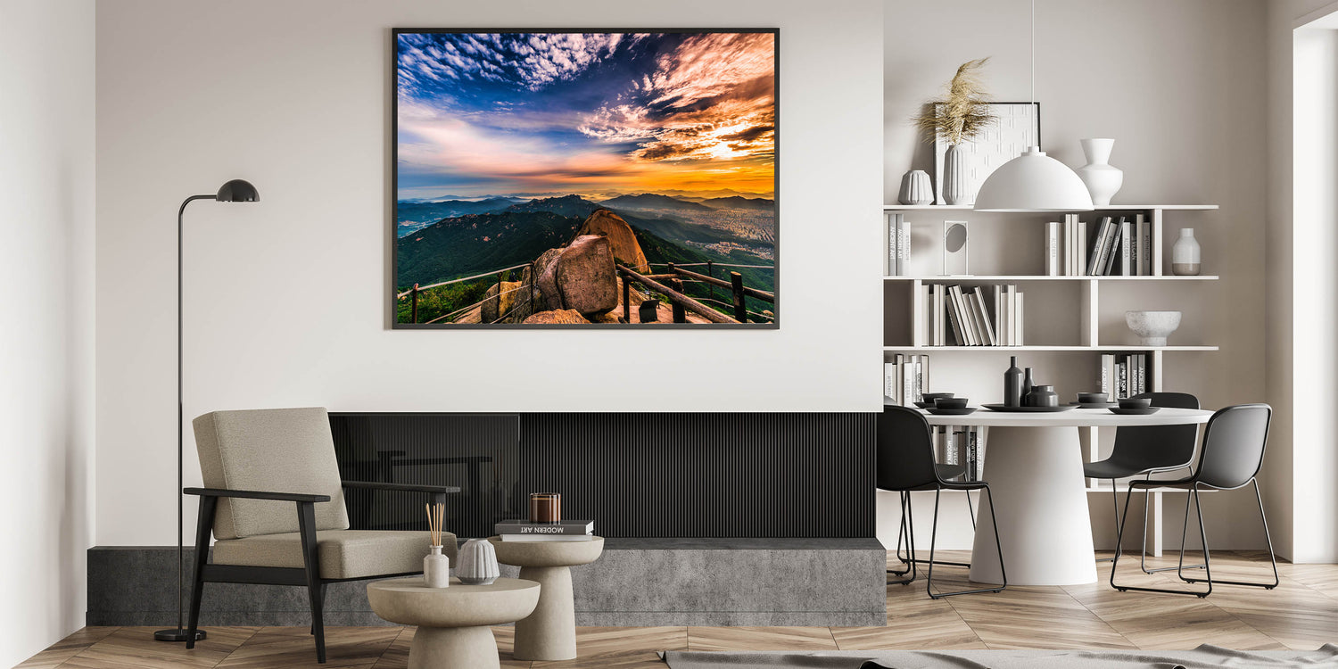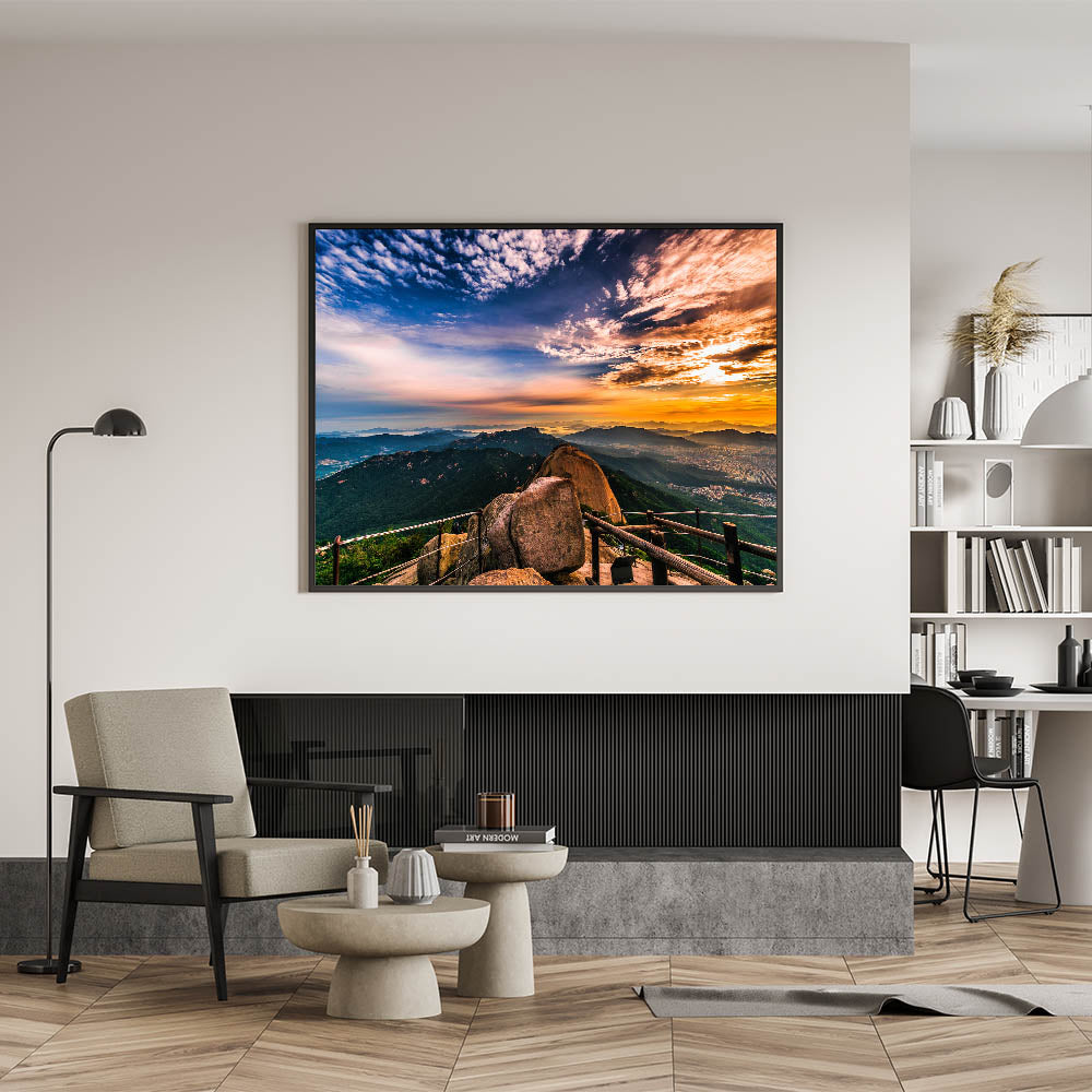 This breathtaking artwork showcases the majestic beauty of a Korean mountain landscape bathed in the golden light of sunset. The dramatic sky, filled with warm tones of orange and purple, creates a captivating contrast with the deep greens and rocky textures of the mountains below. Perfect for nature lovers and adventurers alike, this scenic print will infuse your living room, office, or bedroom with a sense of awe and tranquility.