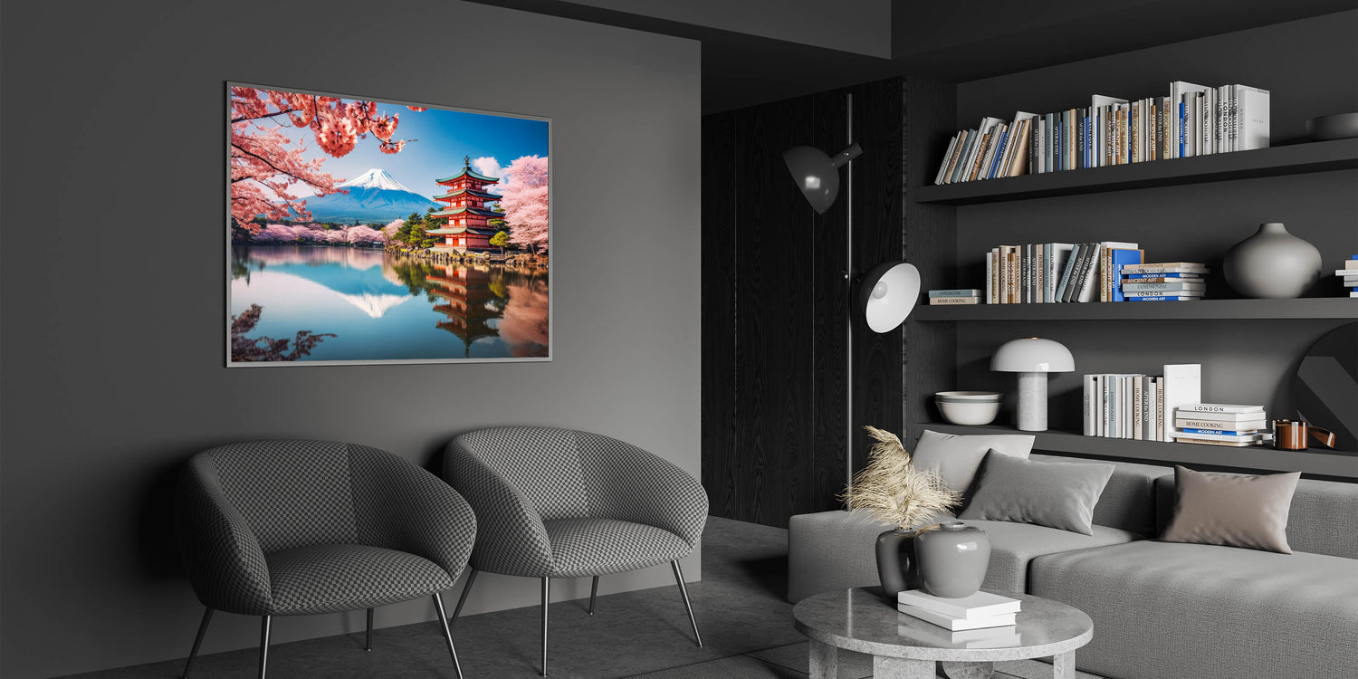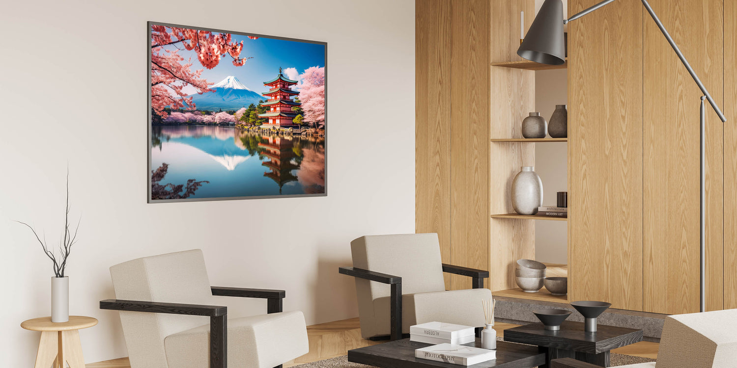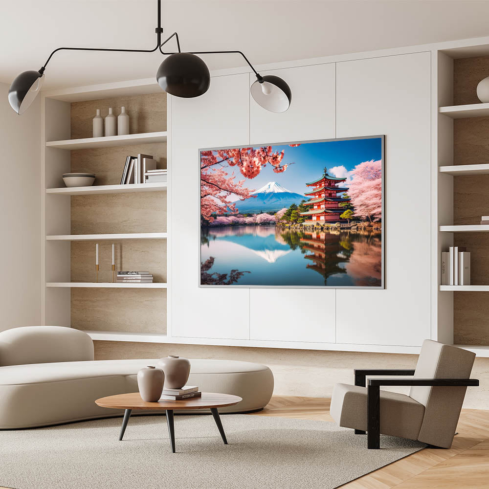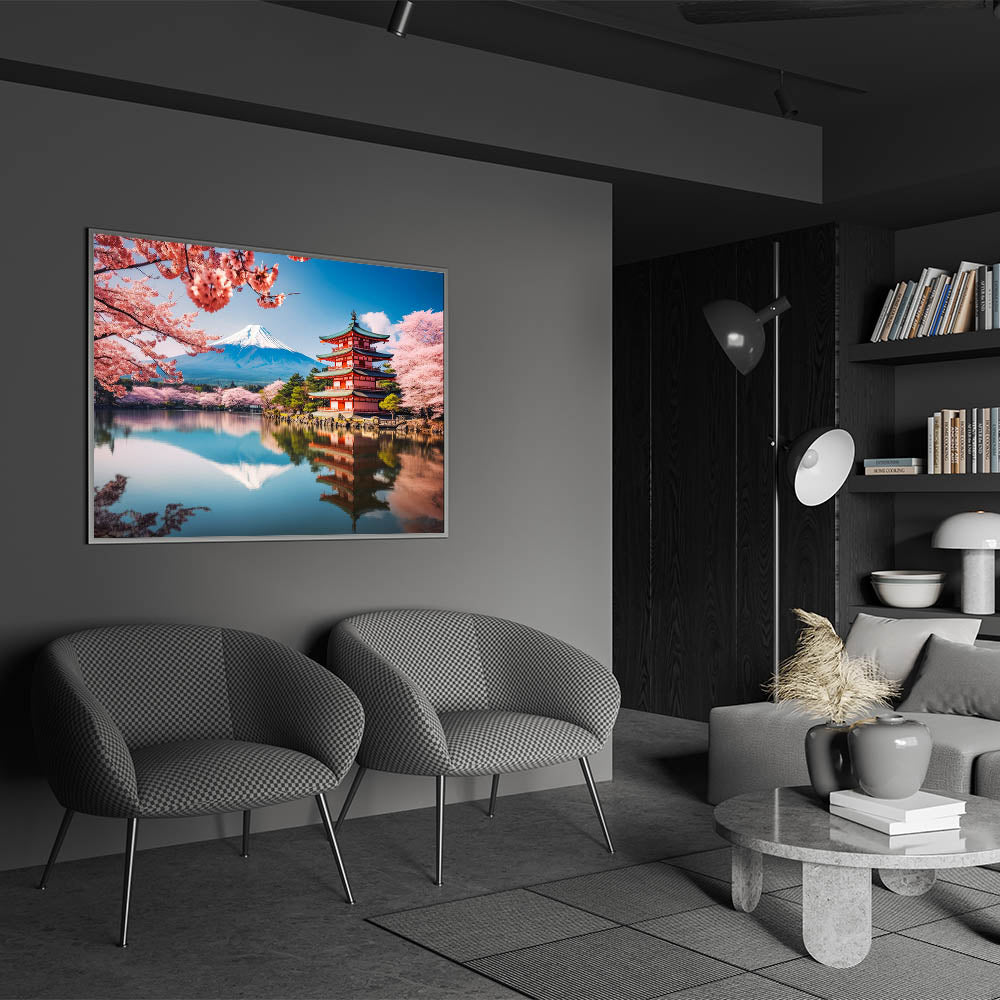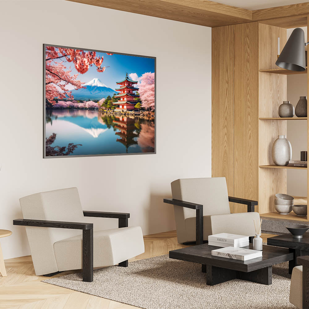 Celebrate the Serenity of Kyoto’s Springtime This stunning Kyoto wall art captures the iconic beauty of Japan’s cherry blossoms, a traditional pagoda, and the majestic Mount Fuji reflecting over a calm lake. The soft pink cherry blossoms frame the scene, while the snow-capped Mount Fuji provides a breathtaking backdrop. The intricate details of the pagoda and the vivid reflection in the lake bring a sense of balance and harmony to this artwork, making it a perfect piece for anyone who loves Japanese culture and the beauty of nature.