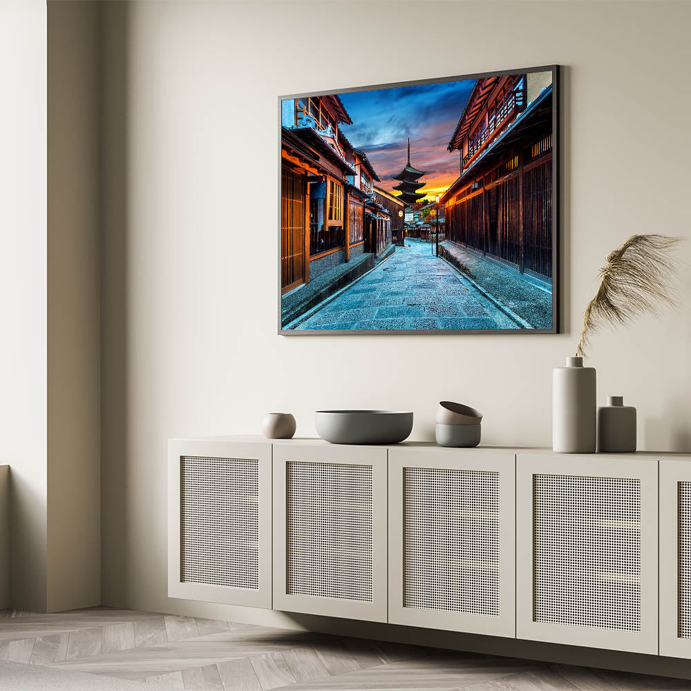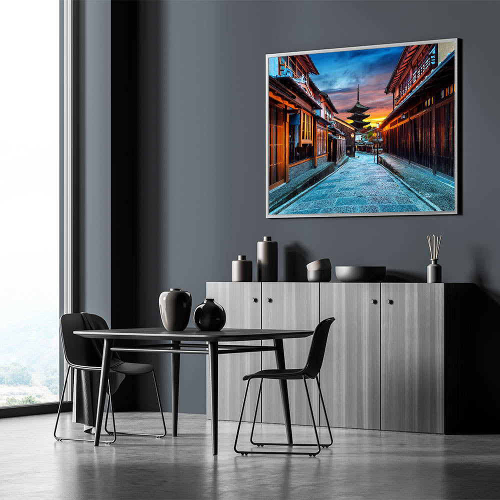 Discover the Charm of Kyoto’s Historic Streets This stunning wall art captures the serene beauty of a historic Kyoto street leading to a traditional pagoda, set against the backdrop of a colorful sunset. The warm glow of the street lanterns and the vibrant hues of the sky create an inviting atmosphere, making this artwork perfect for adding a touch of Japanese culture and tranquility to any space. The intricate details of the traditional wooden architecture highlight Kyoto's rich history, while the vivid colors bring the scene to life.