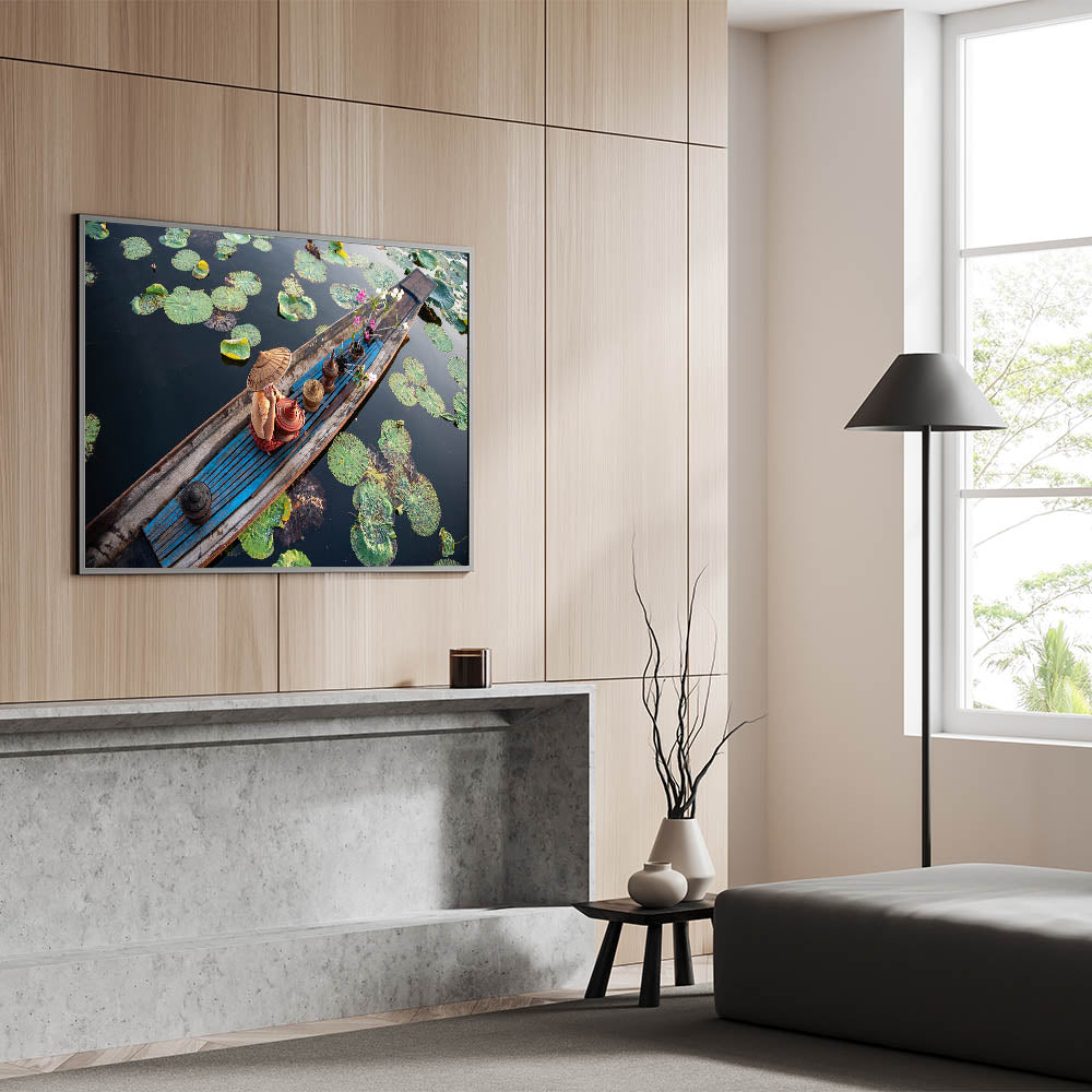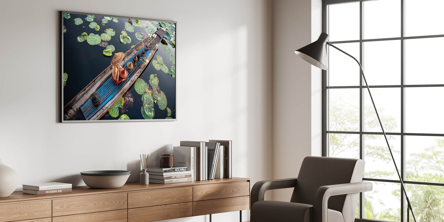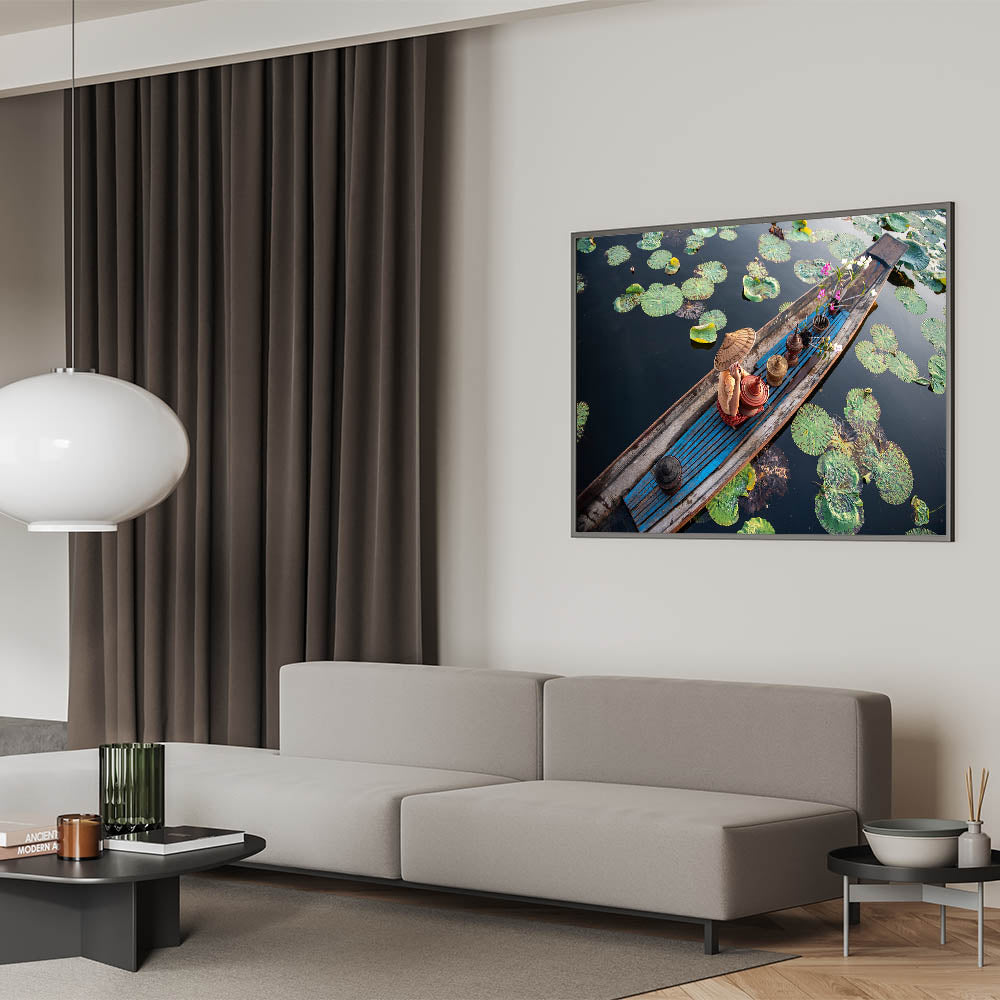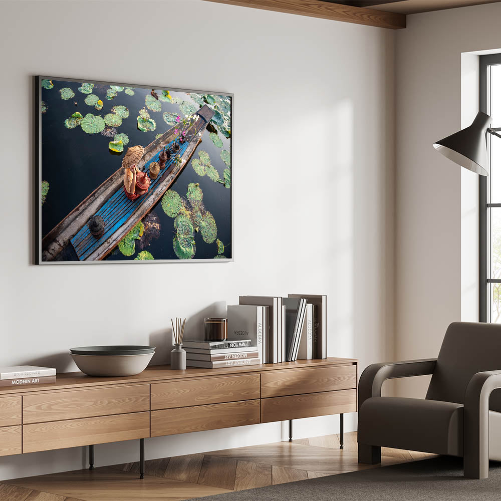 This stunning wall art captures a serene moment of a boat journey across a lily pad-filled lake in Myanmar. The delicate balance of a local traveler with traditional pottery on board creates a peaceful scene, enhanced by the soft reflections of the lily pads on the calm water. The tranquil atmosphere and unique composition make this piece an ideal addition for those looking to bring nature's calm into their home or office.