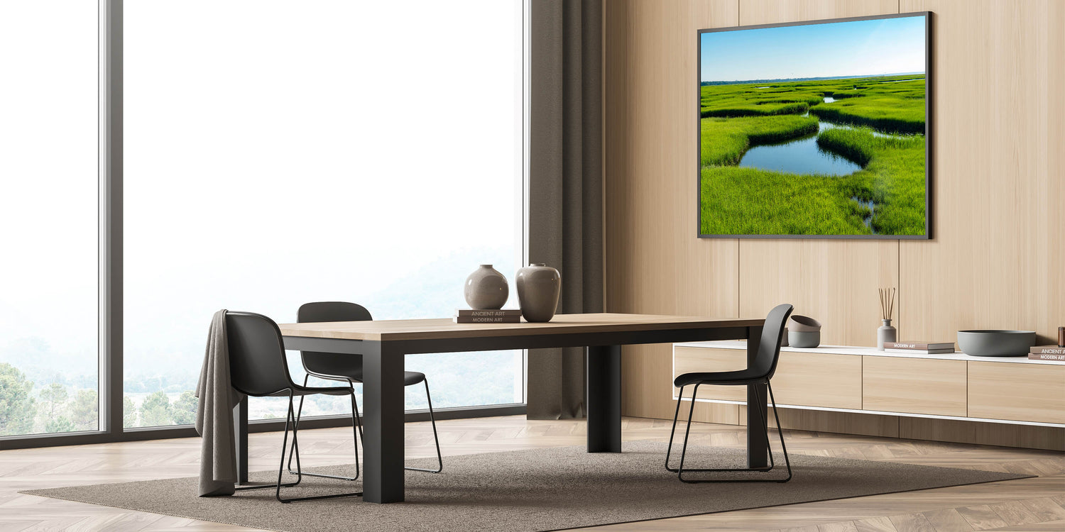 Bring the freshness of nature into your space with this stunning marsh and swamp wall art, featuring a lush green marshland stretching into the horizon. The vivid greenery contrasted with the calm, reflective waters creates a serene and peaceful atmosphere, perfect for brightening up any room in your home.