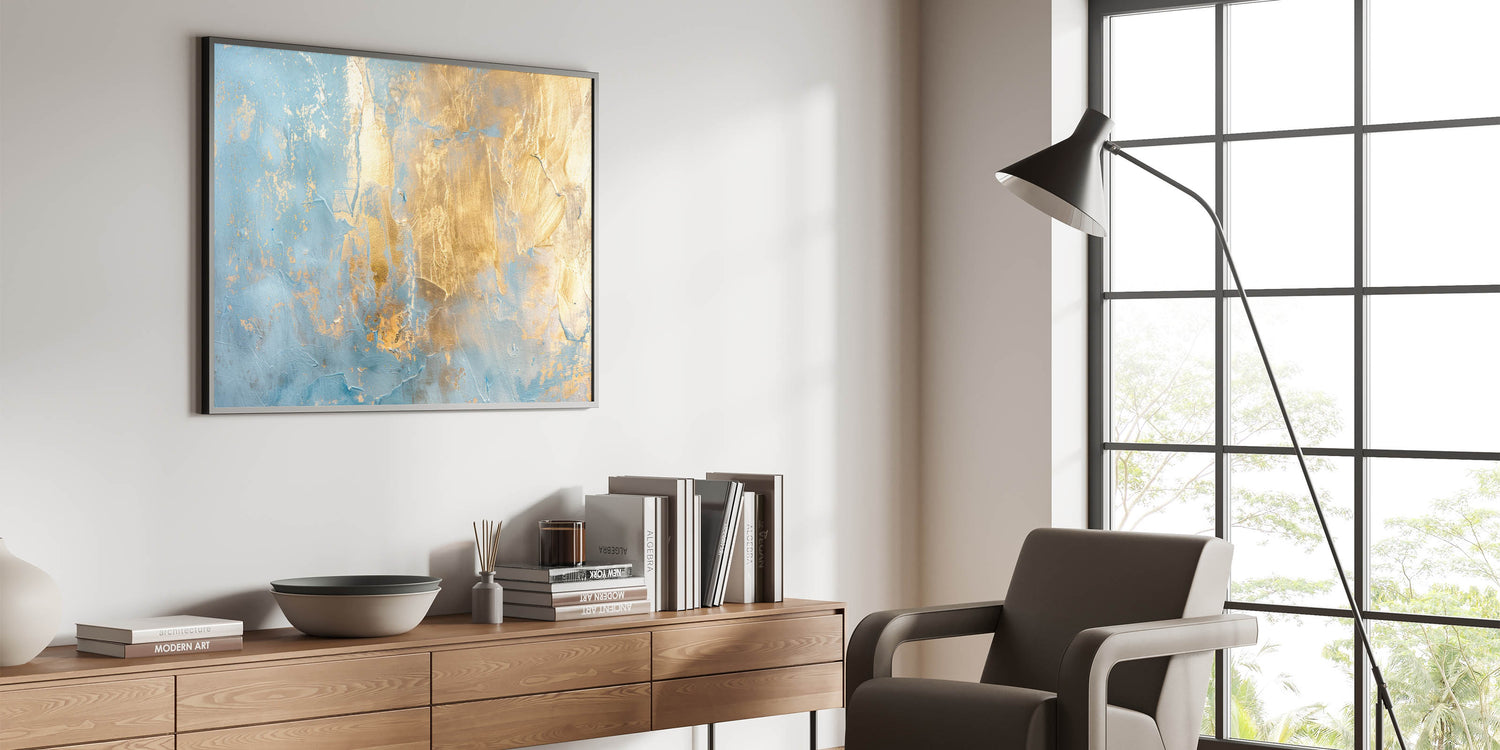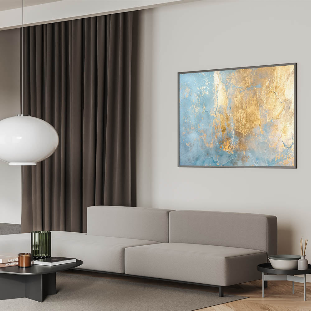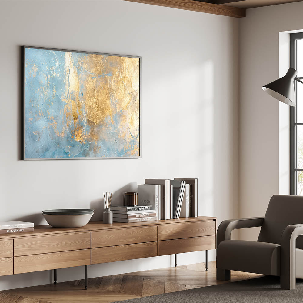 Bring a touch of elegance to your space with this luxury abstract wall art collection piece, featuring a captivating fusion of light blue and shimmering gold. This high-quality abstract canvas print creates a stunning visual balance between soft textures and bold metallics, making it an exclusive abstract design for modern spaces. Its sophisticated yet calming color palette enhances both contemporary and upscale interiors.