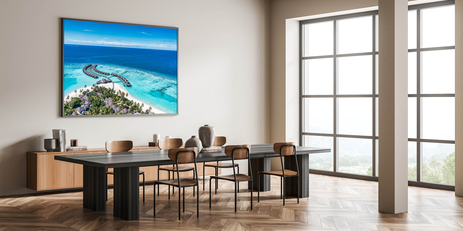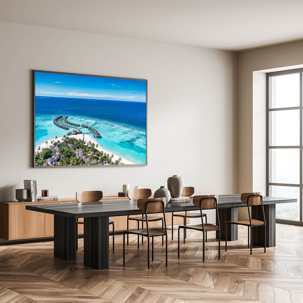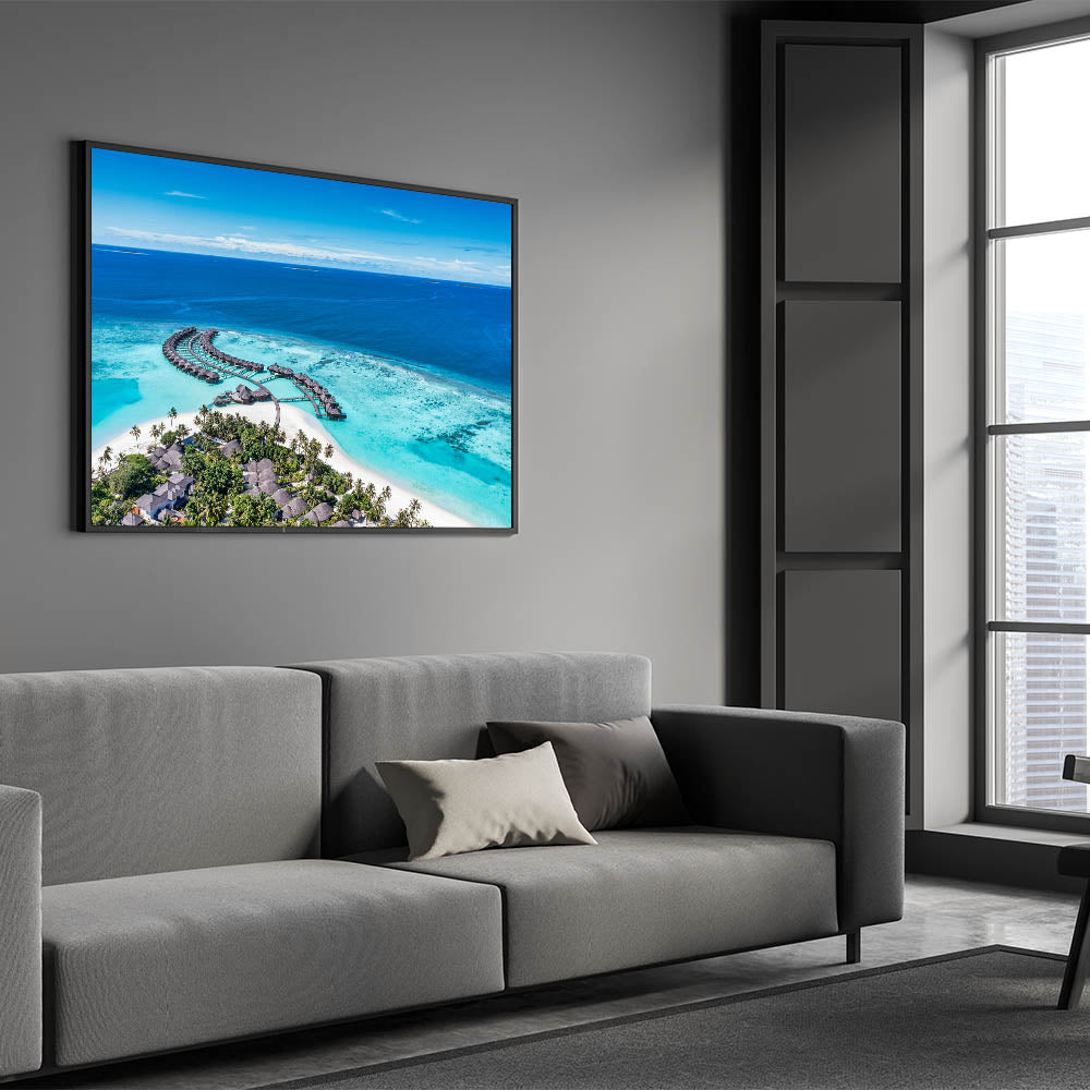 - High-definition print showcasing the detailed aerial view of a tropical resort and crystal-clear ocean.
