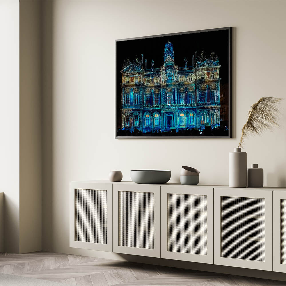 Celebrate Lyon’s magical Festival of Lights with this striking Lyon cityscape print, featuring the illuminated Hôtel de Ville bathed in a dazzling display of blue lights. This captivating artwork perfectly captures the essence of Lyon’s rich cultural heritage and artistic celebrations. Ideal for lovers of French wall decor and iconic French landmarks, this piece brings a festive yet elegant touch to any room.