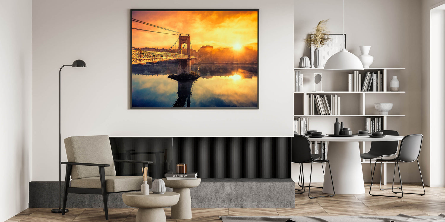 Capture the breathtaking beauty of Lyon with this stunning wall art, featuring a mesmerizing sunset over the iconic Rhône River and bridge. This artwork brings the warm, golden hues of the sunset reflecting off the water, making it a perfect piece for any room looking for a blend of elegance and tranquility. Ideal for those who love French decor and captivating cityscapes, this artwork will add a touch of Lyon’s vibrant charm to your space.