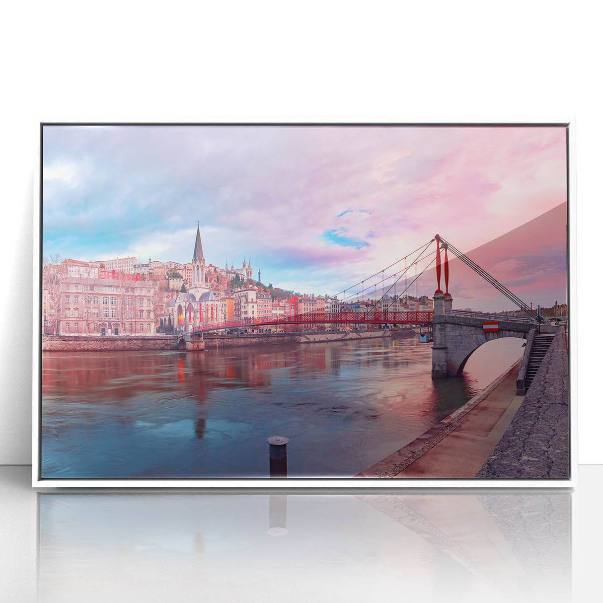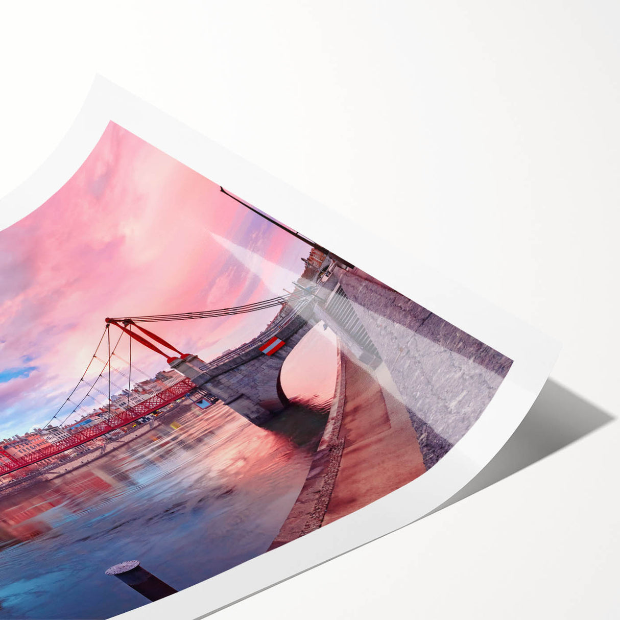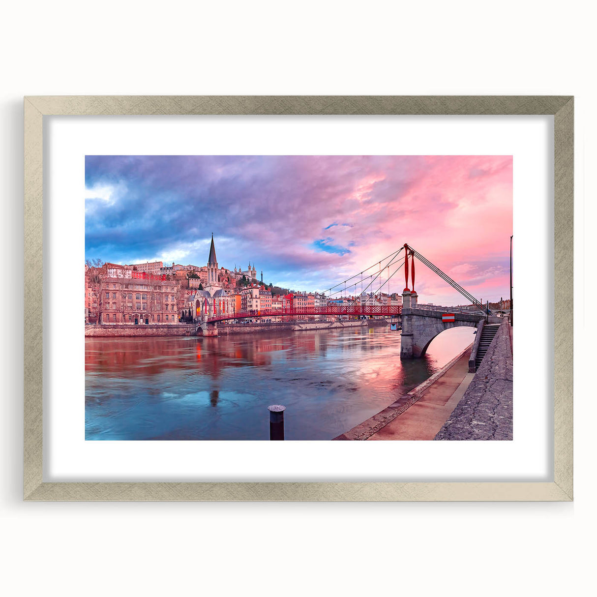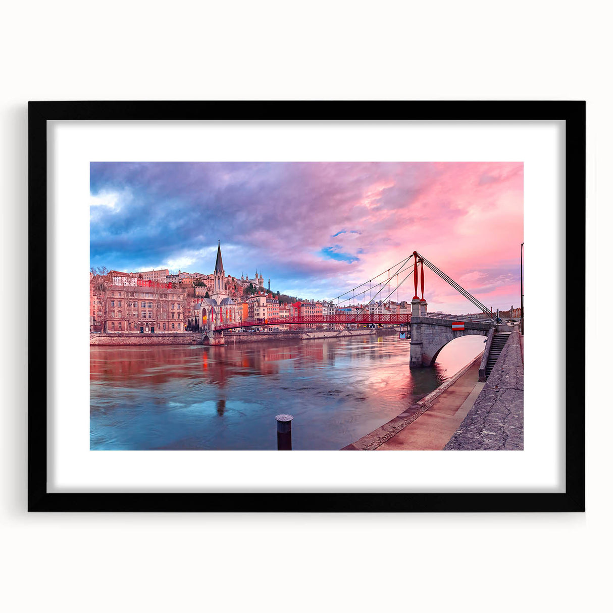 - High-quality reproduction of a sunset over Lyon’s Saône River, with detailed reflections.