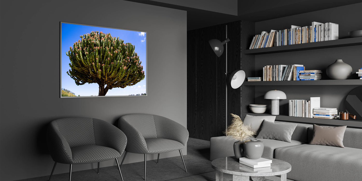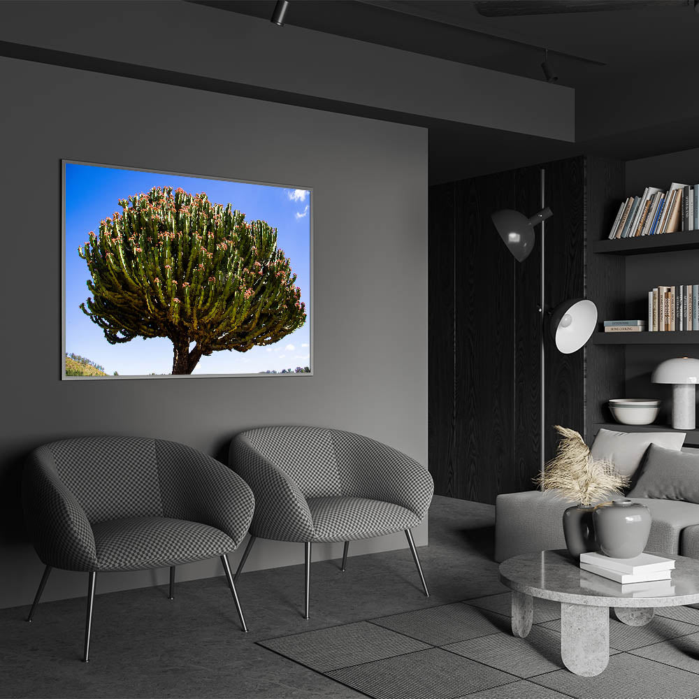Celebrate the unique and vibrant flora of Ethiopia with this stunning wall art featuring a majestic cactus tree in full bloom. The striking green of the cactus contrasts beautifully with the vivid blue sky, creating a scene that is both bold and serene. This artwork captures the essence of Ethiopia's diverse landscapes, offering a glimpse into the natural beauty that defines this African nation. Perfect for nature lovers and those looking to bring a touch of the outdoors into their home, this piece is a vivid reminder of the resilience and beauty of nature.