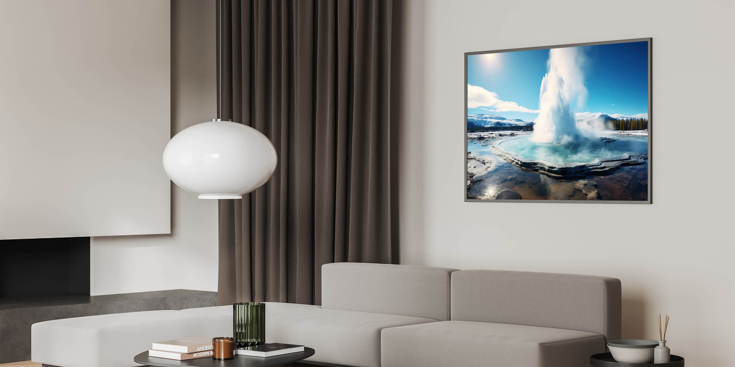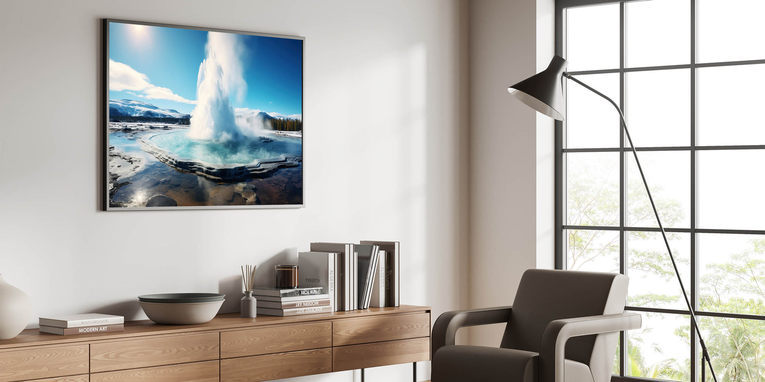 Elevate your home decor with this majestic geyser wall art, showcasing a stunning winter landscape where a powerful geyser erupts against a backdrop of snow-capped mountains. This breathtaking piece is perfect for anyone who loves the beauty of natural wonders and desires to bring that serene yet dynamic energy into their living space.